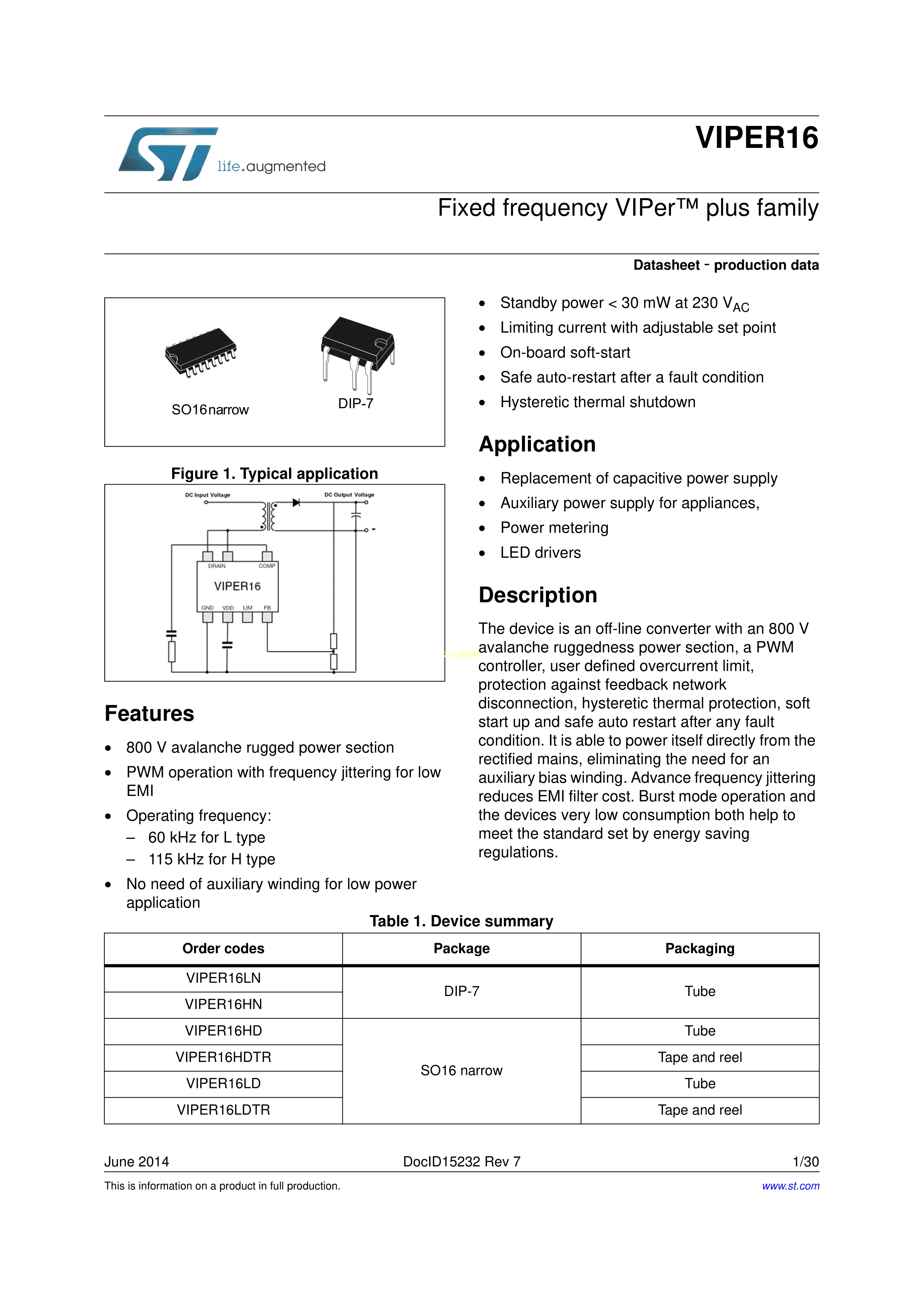 VIPER16HDTR数据手册SO-16N封装ST(意法半导体)PDF规格书,中英文下载