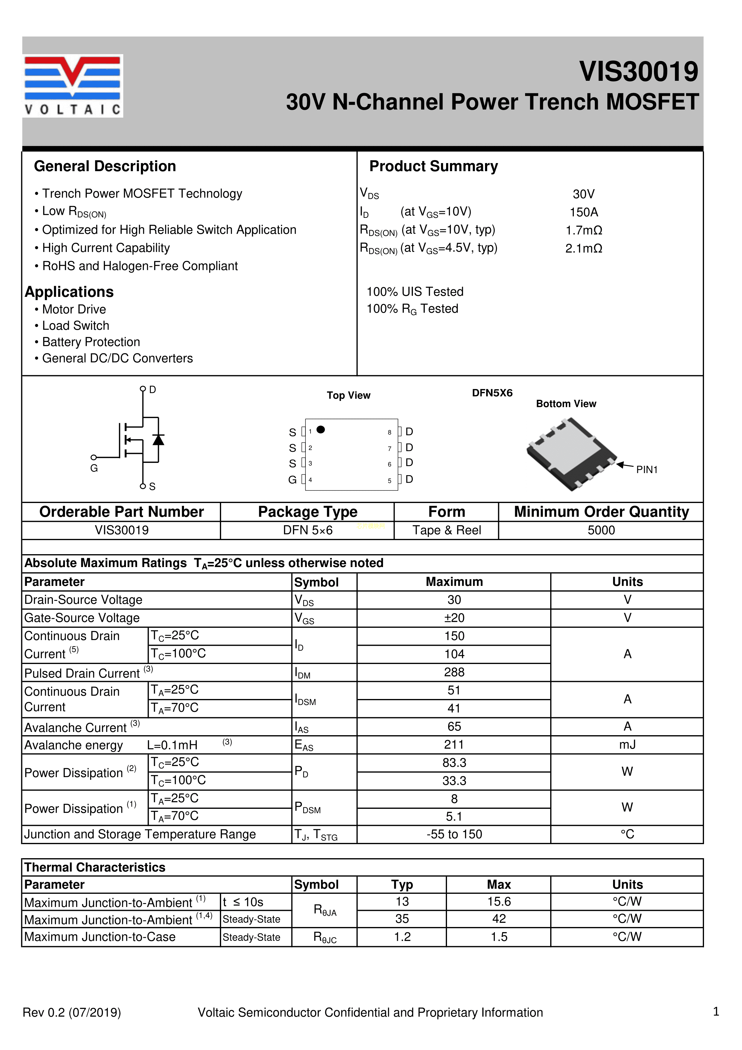 VIS30019A数据手册DFN(5x6)封装VOLTAIC(无锡沃达科)PDF规格书,中英文下载