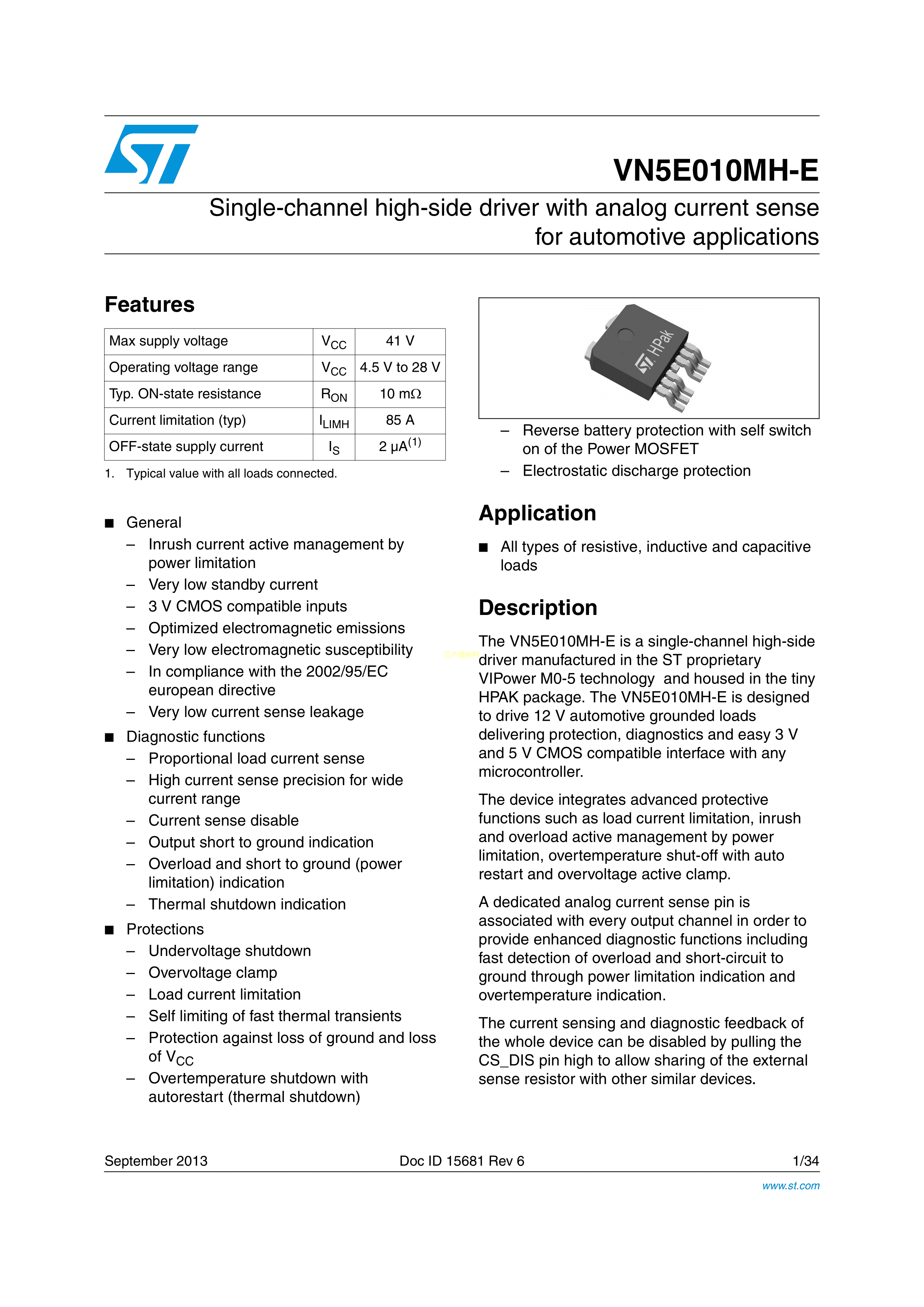 VN5E010MHTR-E数据手册HPAK-6封装ST(意法半导体)PDF规格书,中英文下载