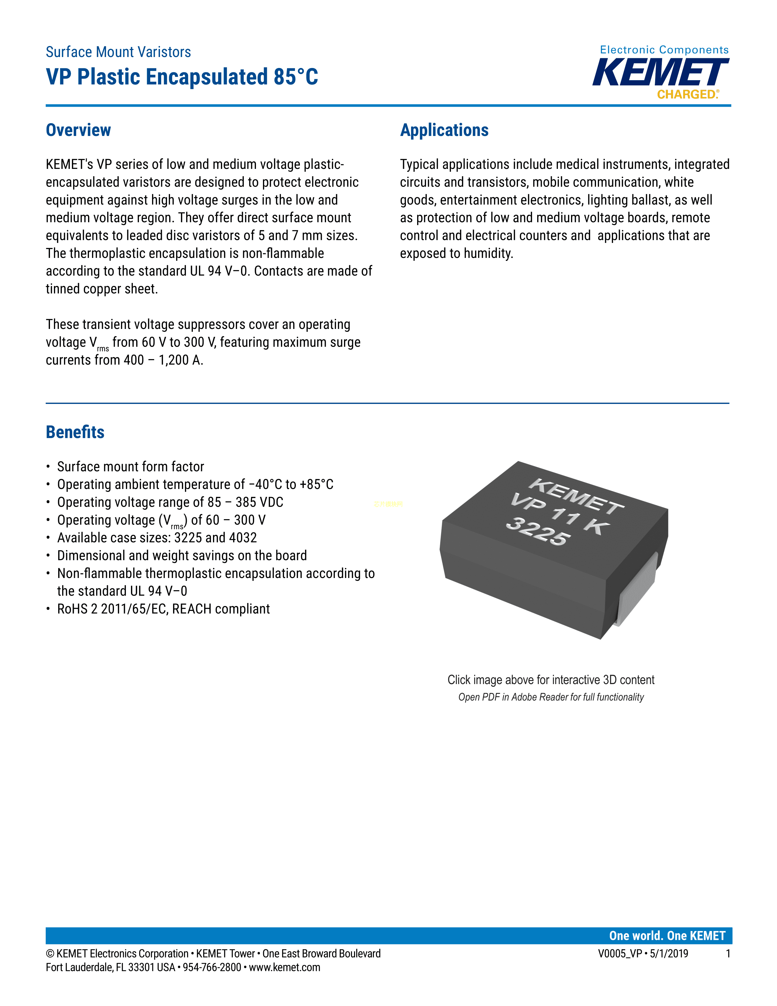 VP3225K401R095数据手册SMD封装KEMET(基美)PDF规格书,中英文下载
