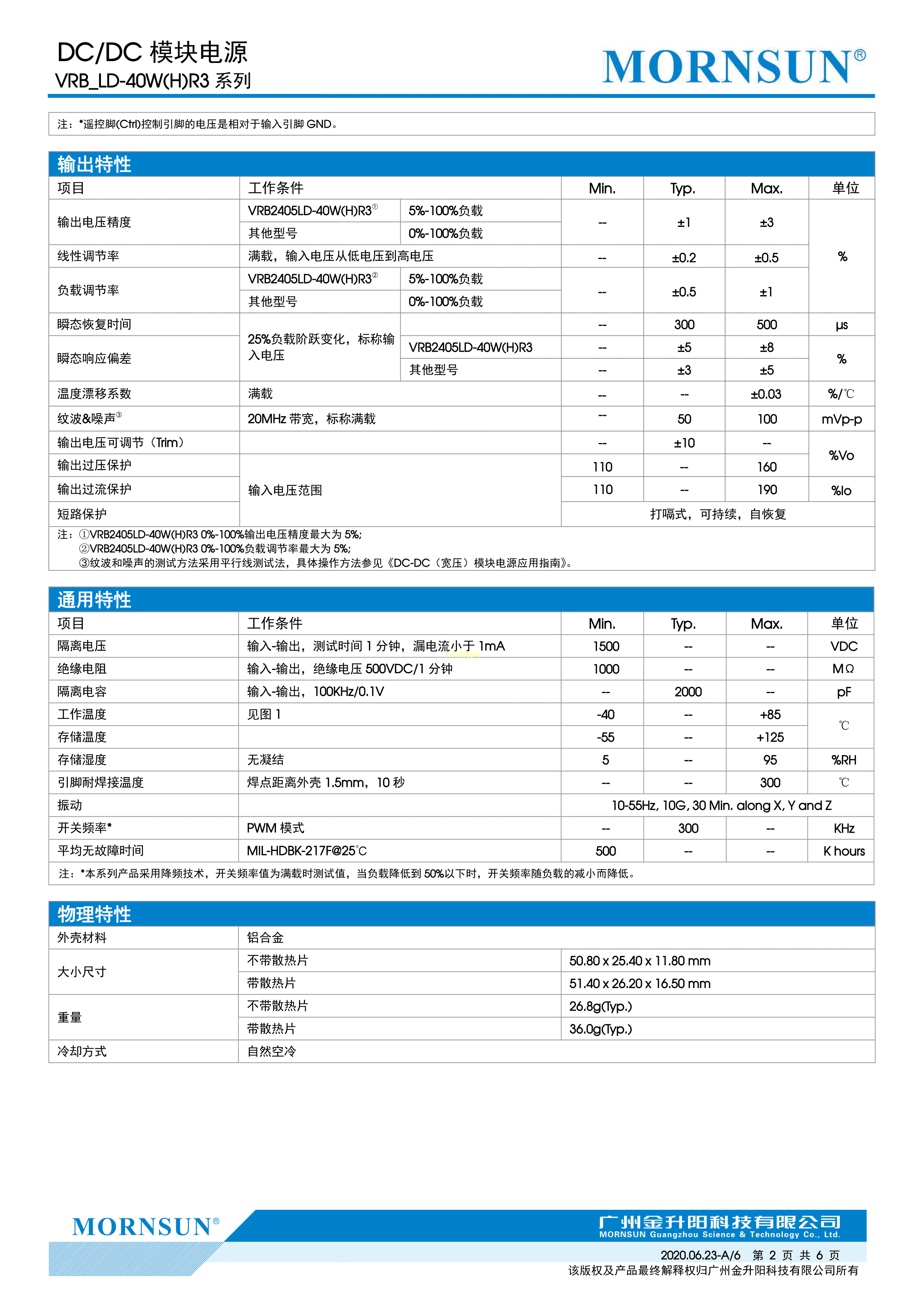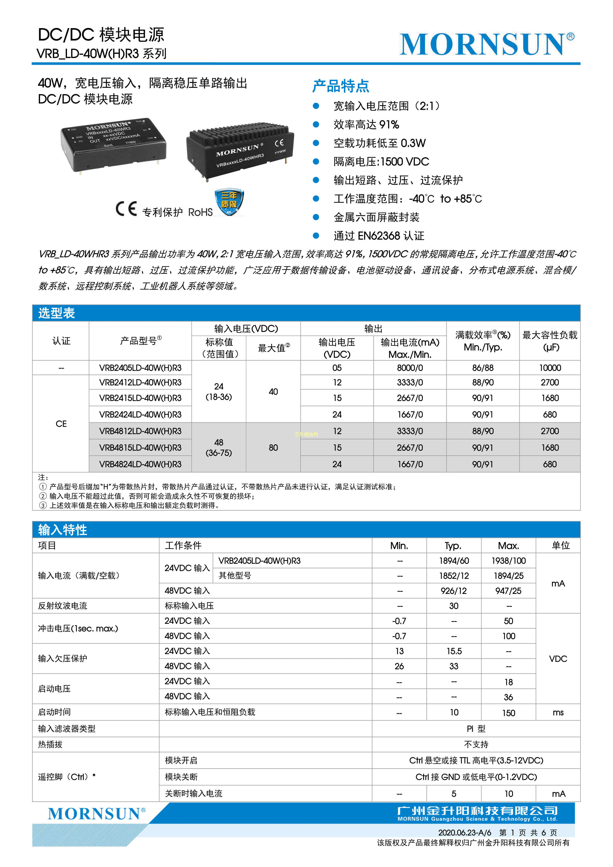 VRB2405LD-40WHR3数据手册插件封装MORNSUN(金升阳)PDF规格书,中英文下载