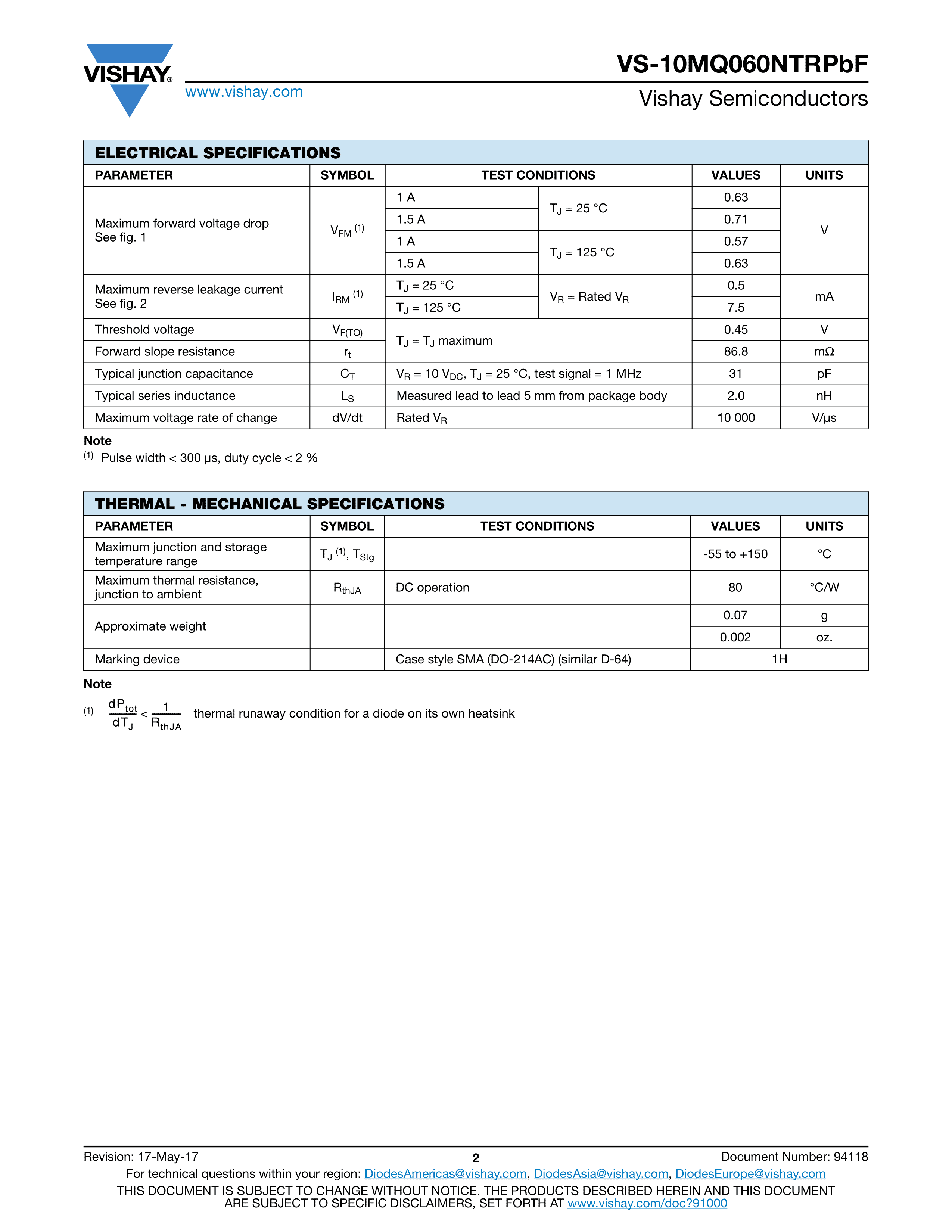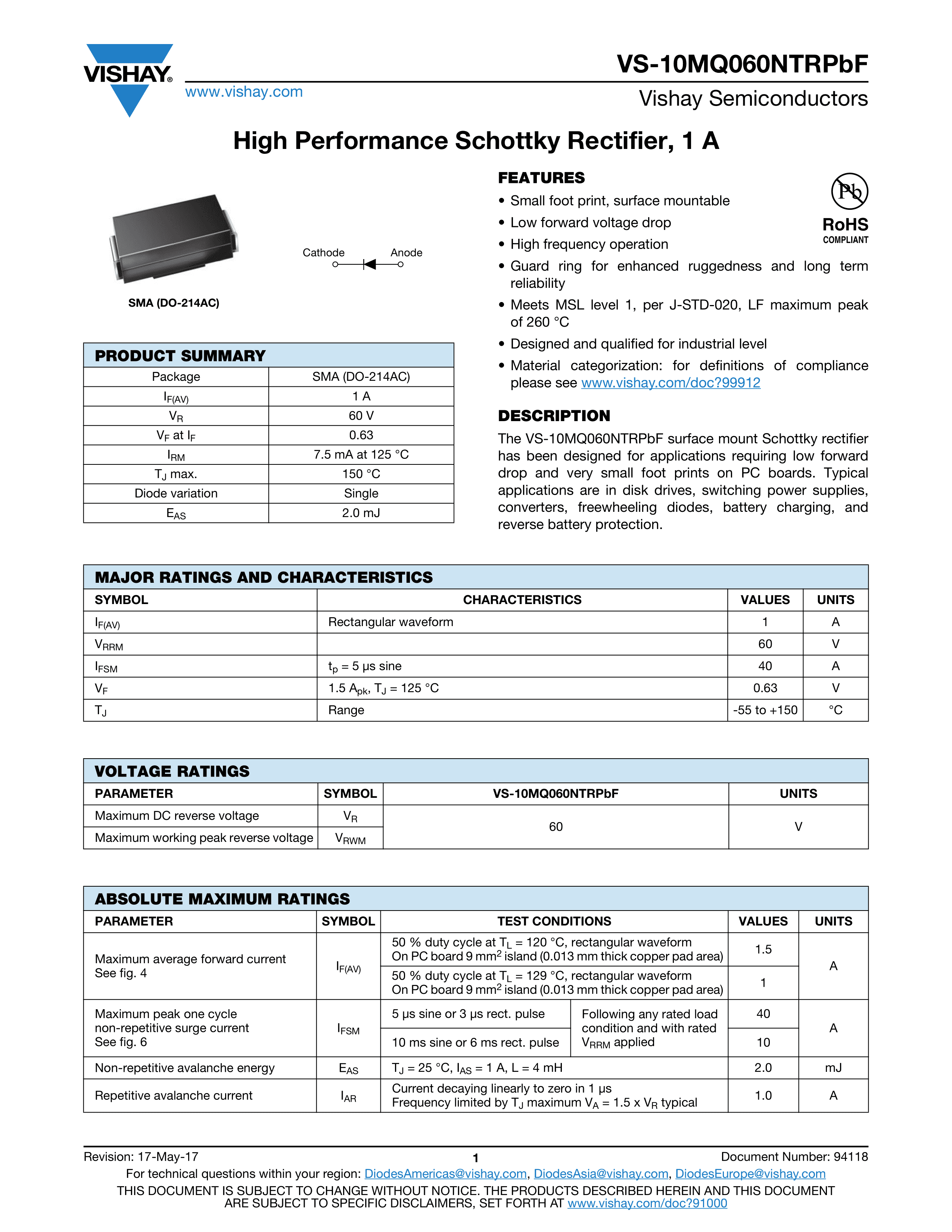 VS-10MQ060NTRPBF数据手册SMA(DO-214AC)封装VISHAY(威世)PDF规格