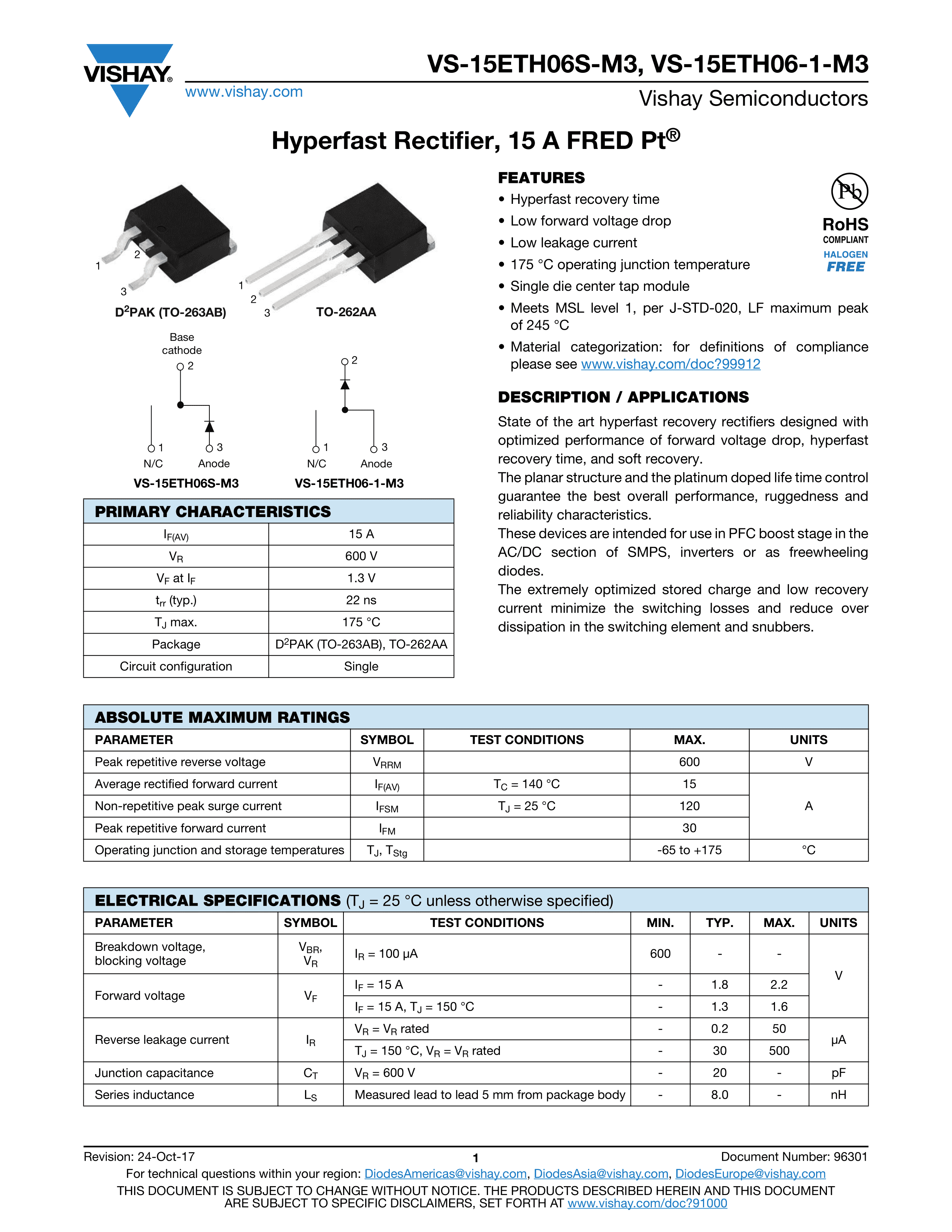 VS-15ETH06S-M3数据手册TO-263AB封装VISHAY(威世)PDF规格书,中英文下载