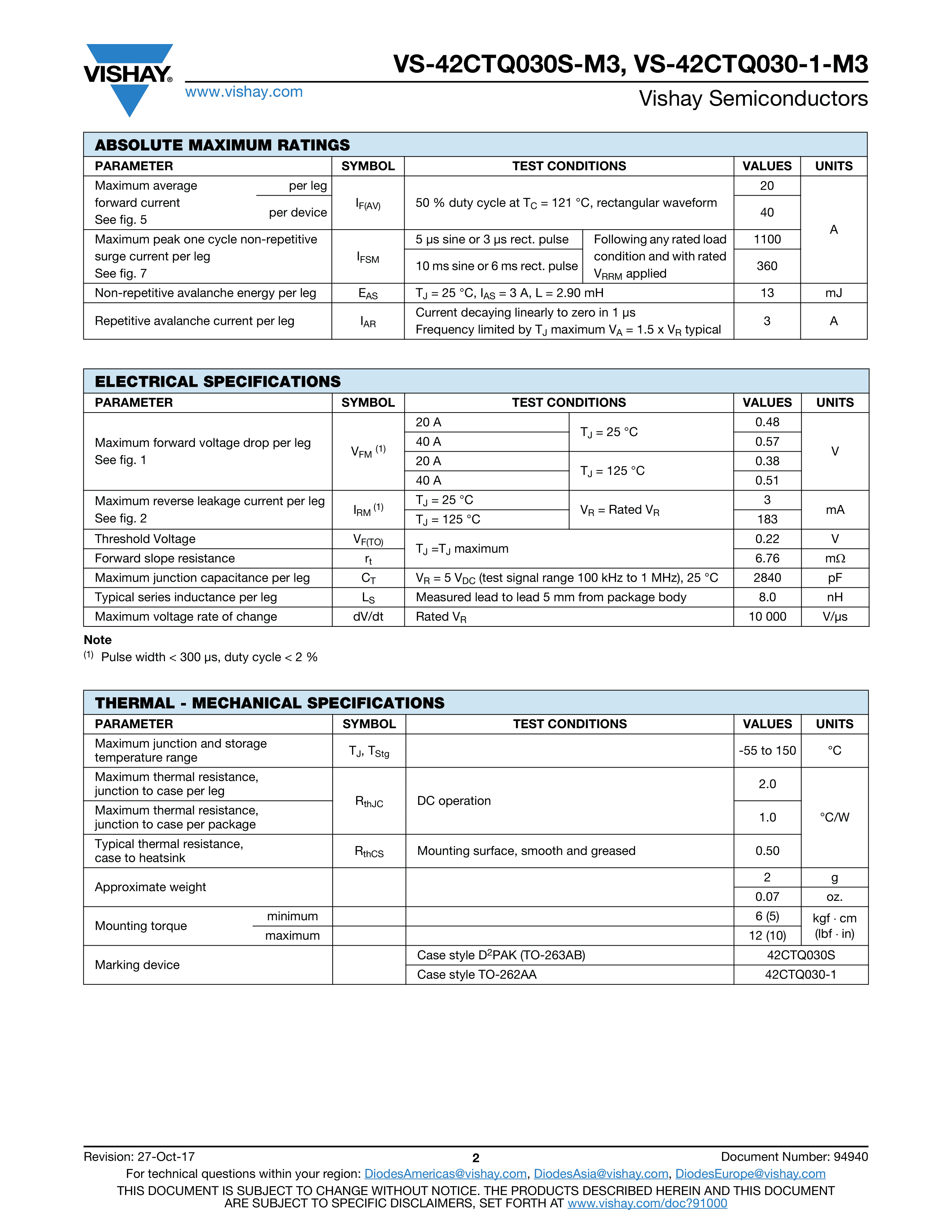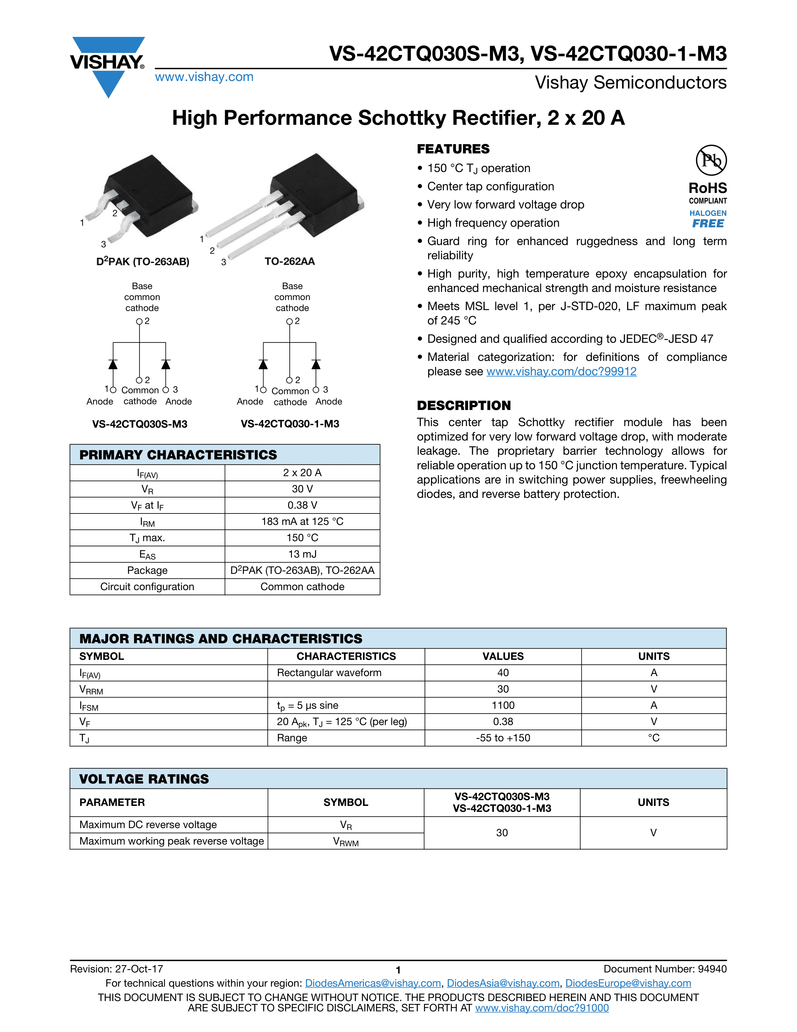 VS-42CTQ030S-M3数据手册D2PAK封装VISHAY(威世)PDF规格书,中英文下载