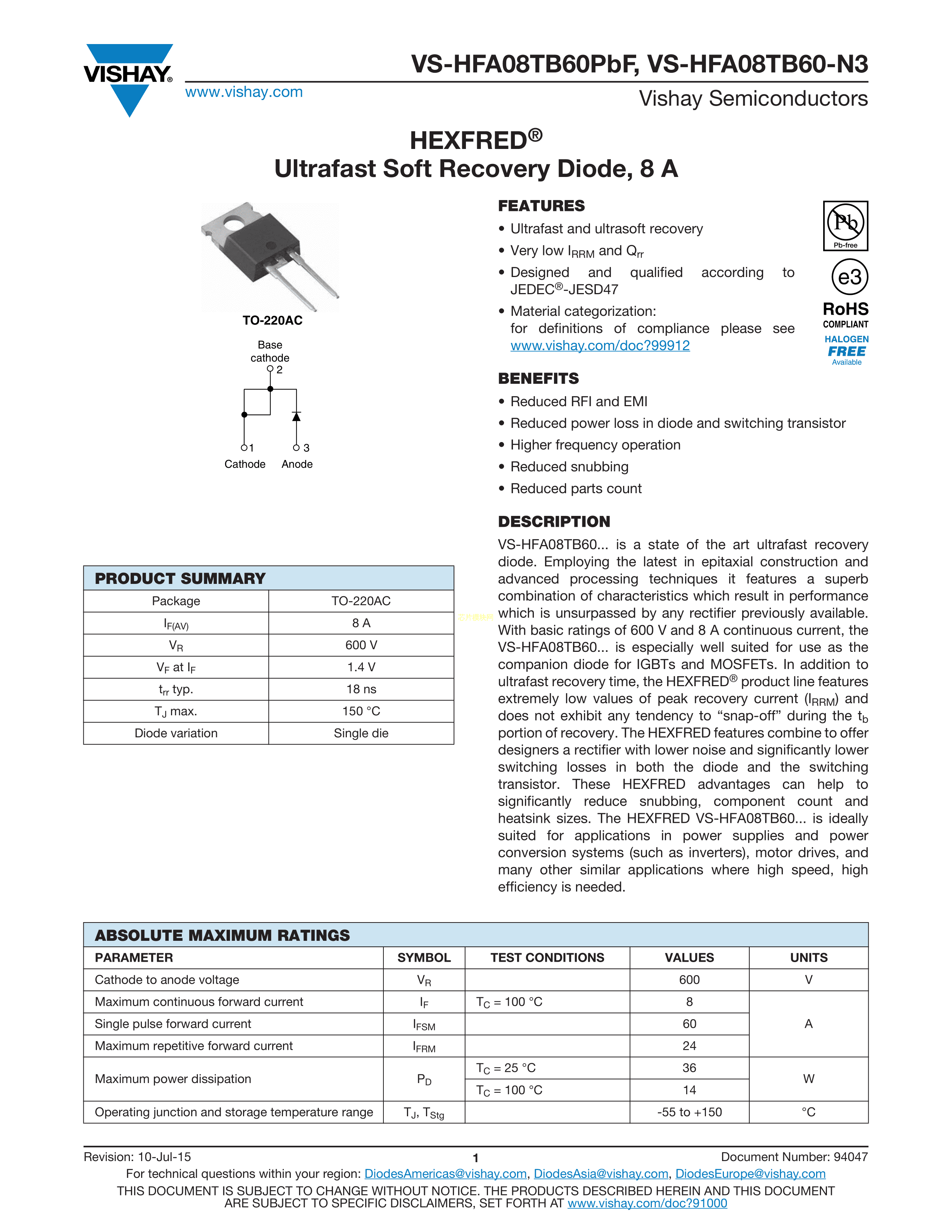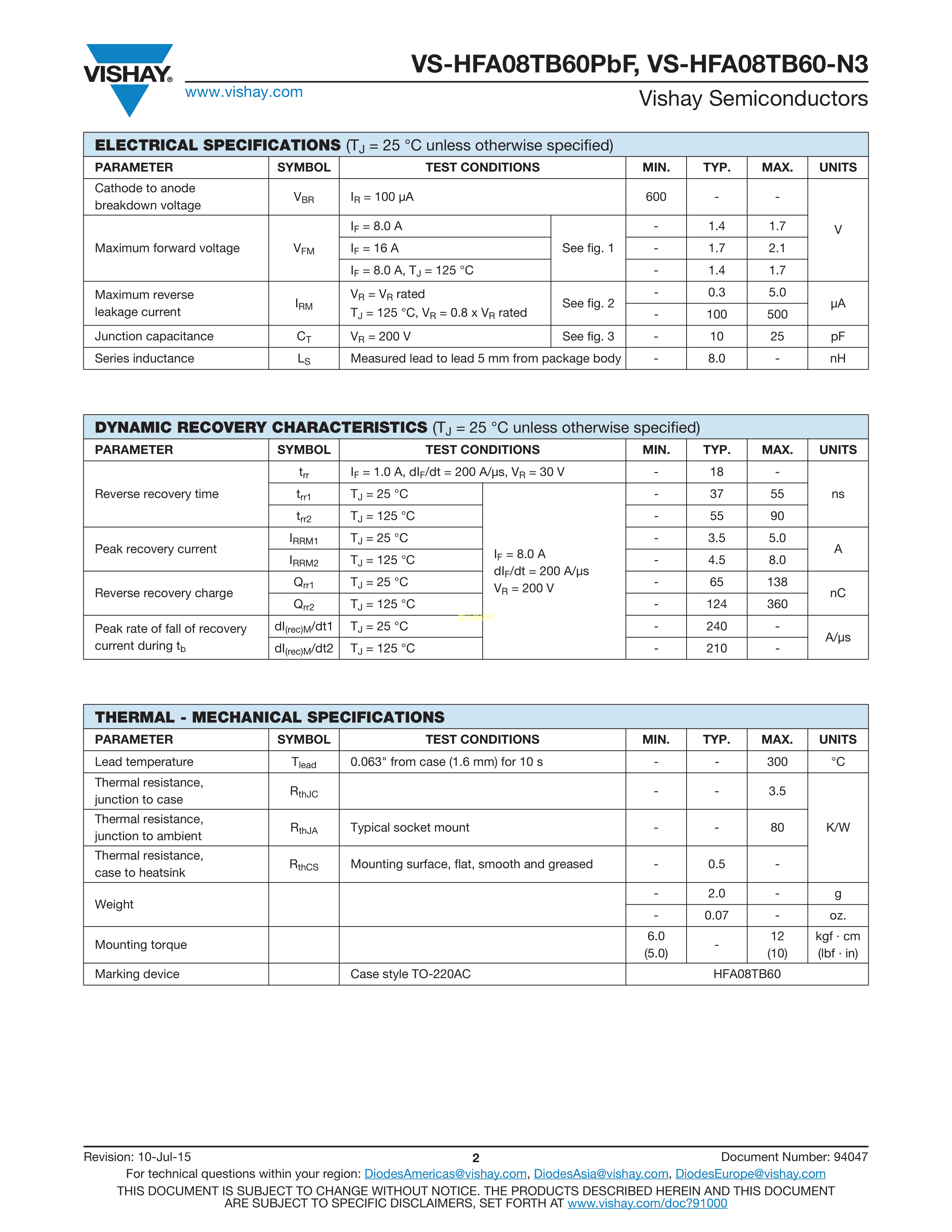 VS-HFA08TB60-N3数据手册TO-220AC封装VISHAY(威世)PDF规格书,中英文下载