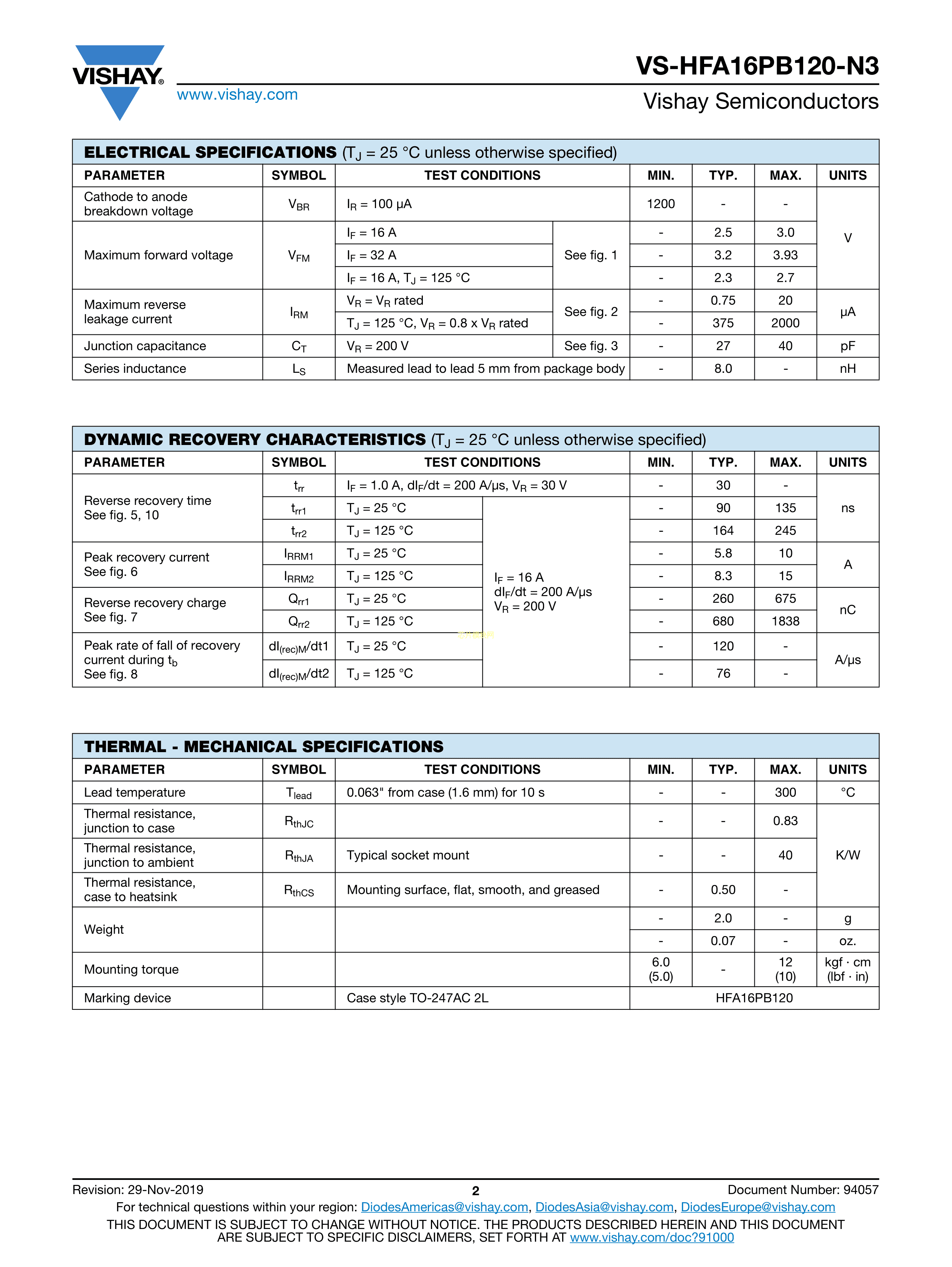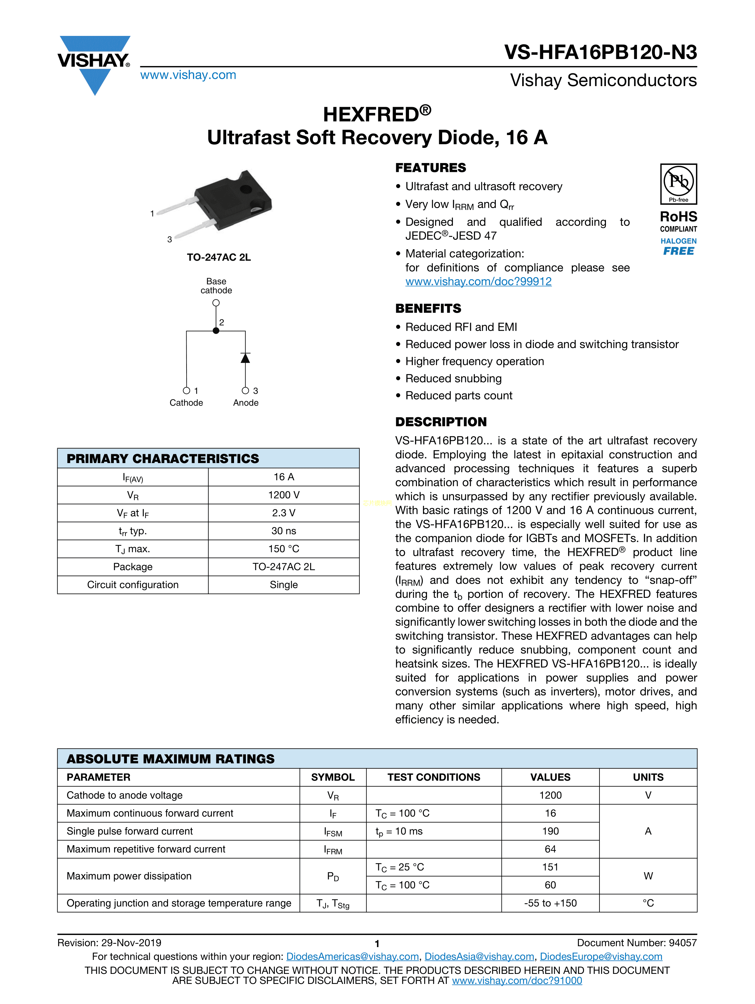 VS-HFA16PB120PBF数据手册TO-247AC-2L封装VISHAY(威世)PDF规格书,中英文下载