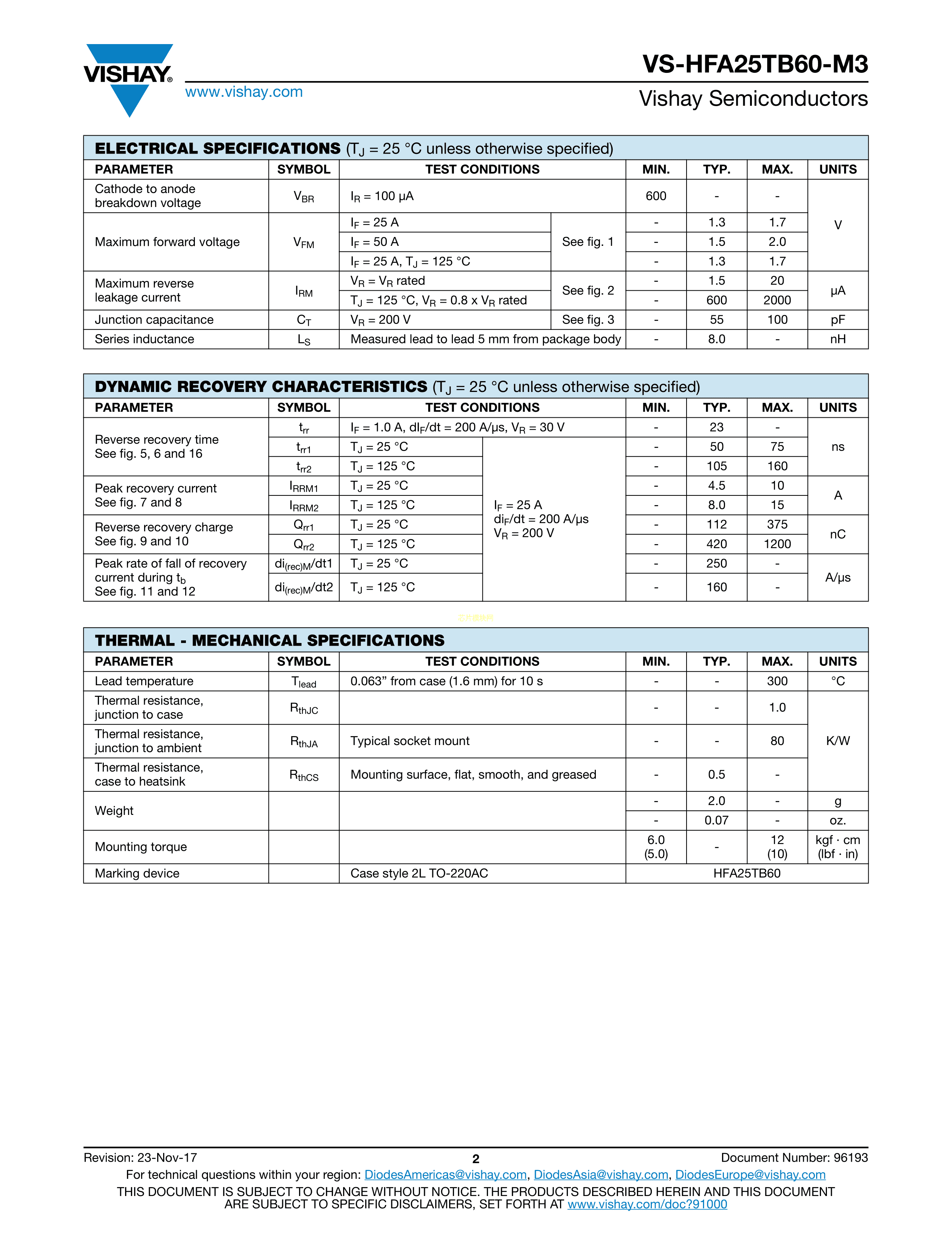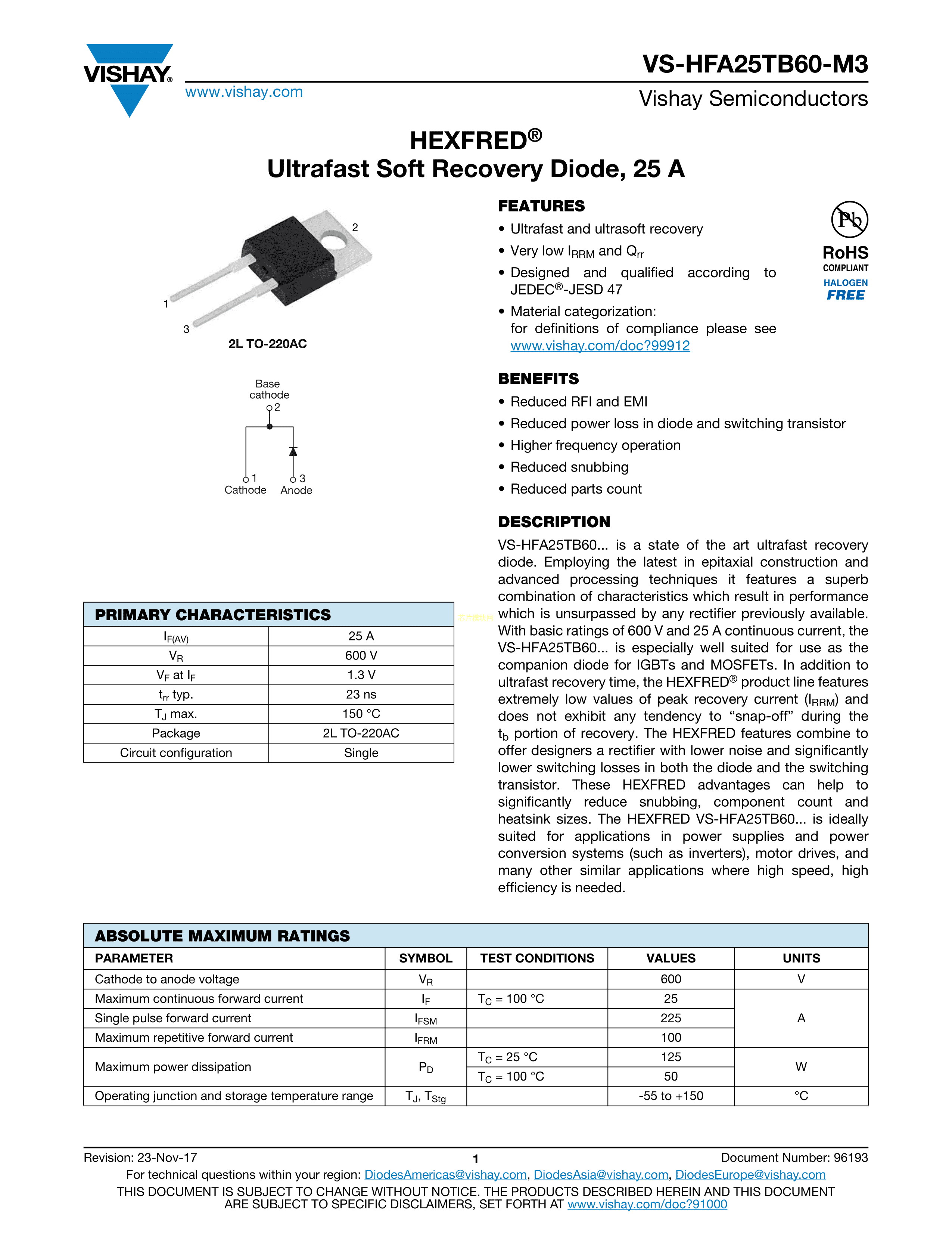VS-HFA25TB60-M3数据手册TO-220AC封装VISHAY(威世)PDF规格书,中英文下载