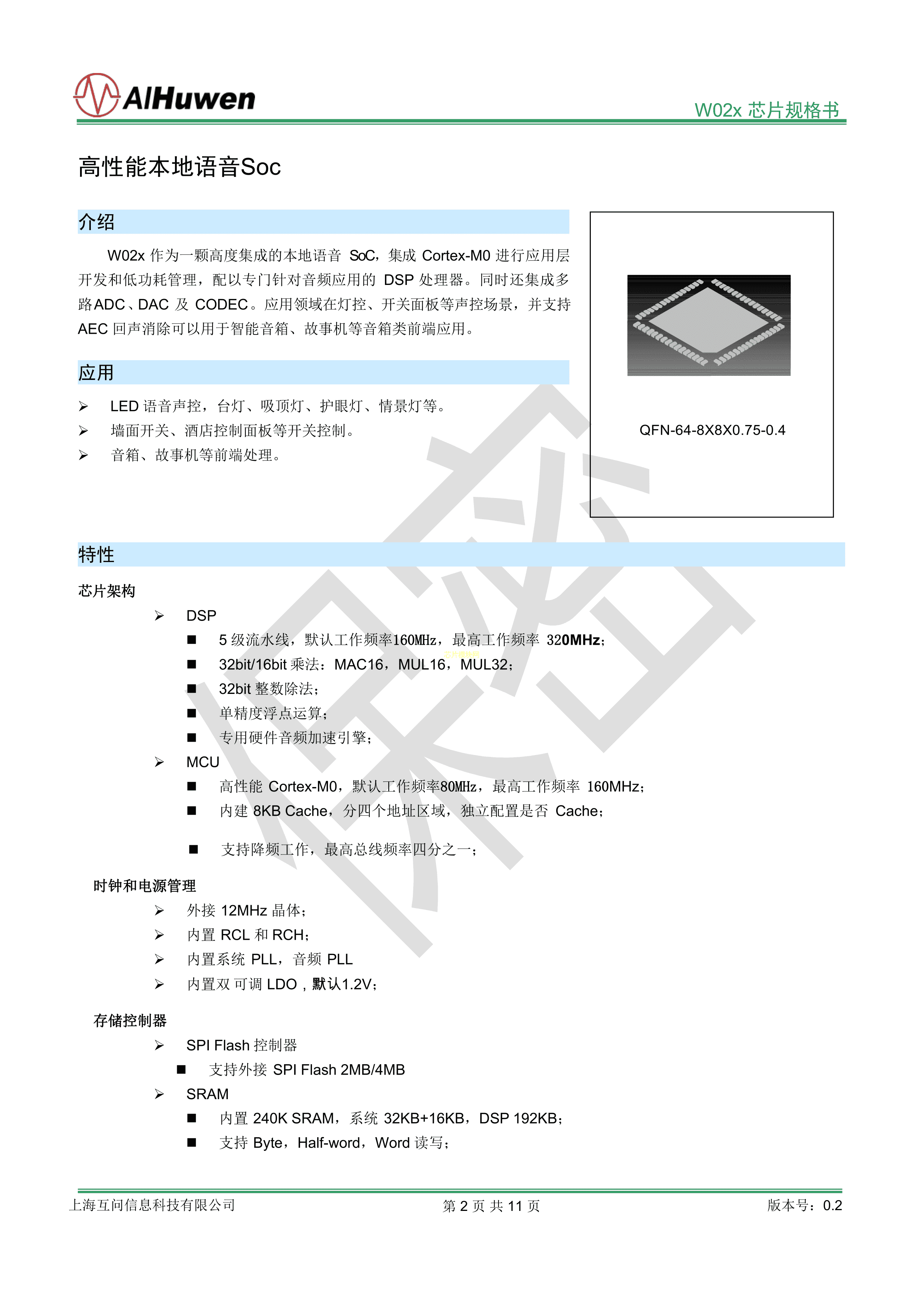 W02数据手册QFN-64封装AIHuwen(上海互问)PDF规格书,中英文下载