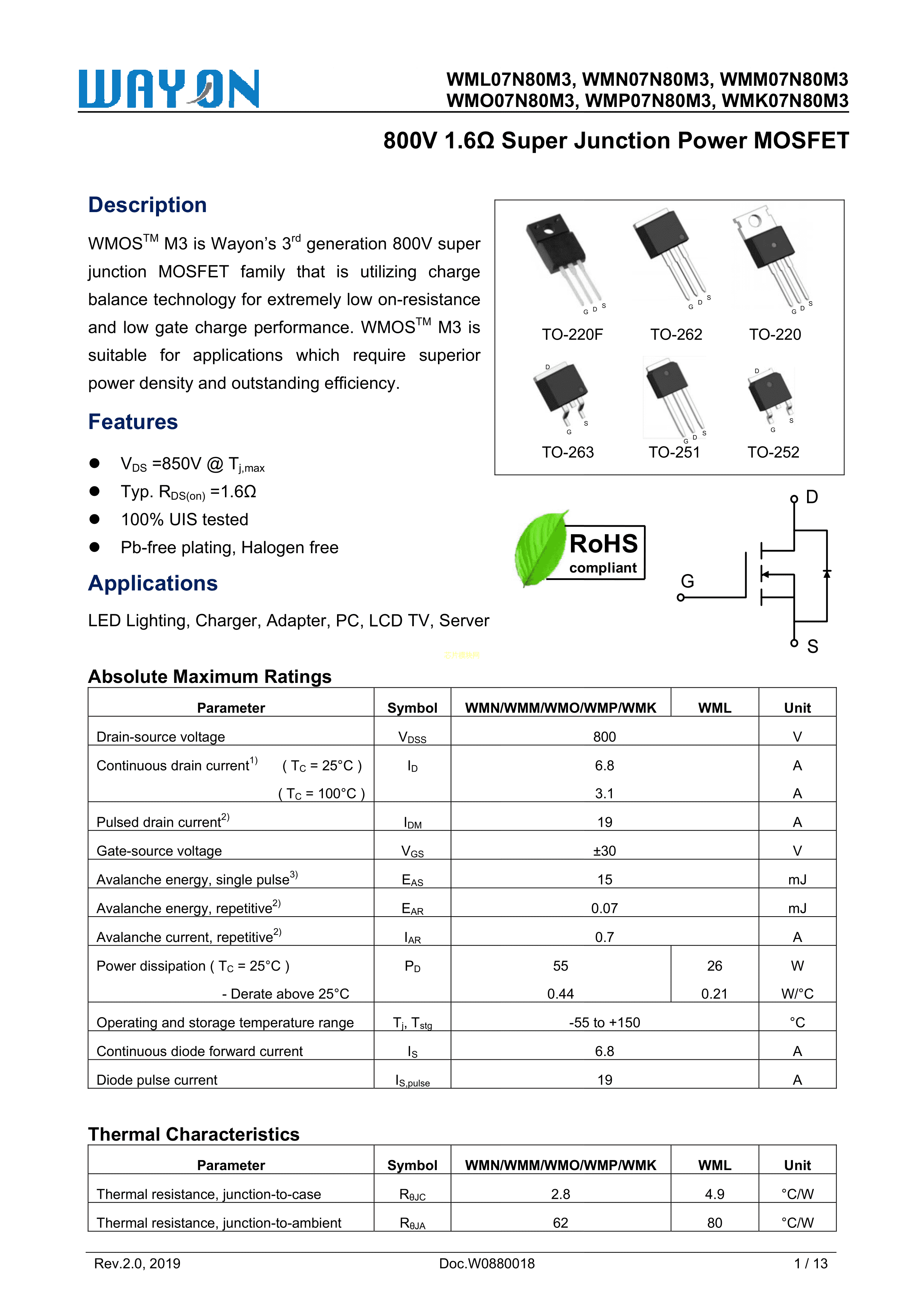 WML07N80M3数据手册TO-220F封装Wayon(上海维安)PDF规格书,中英文下载