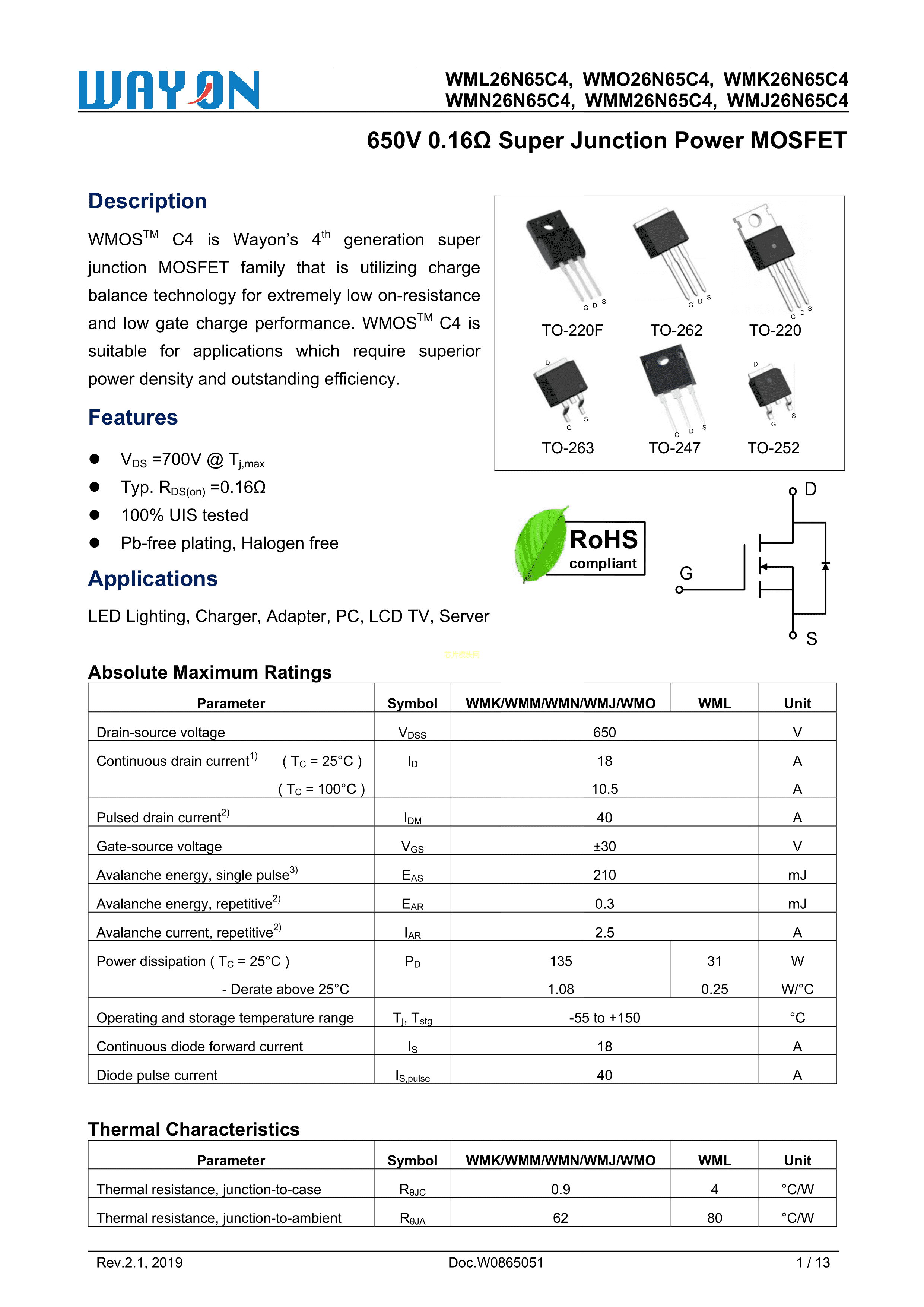 WML26N65C4数据手册TO-220F封装Wayon(上海维安)PDF规格书,中英文下载