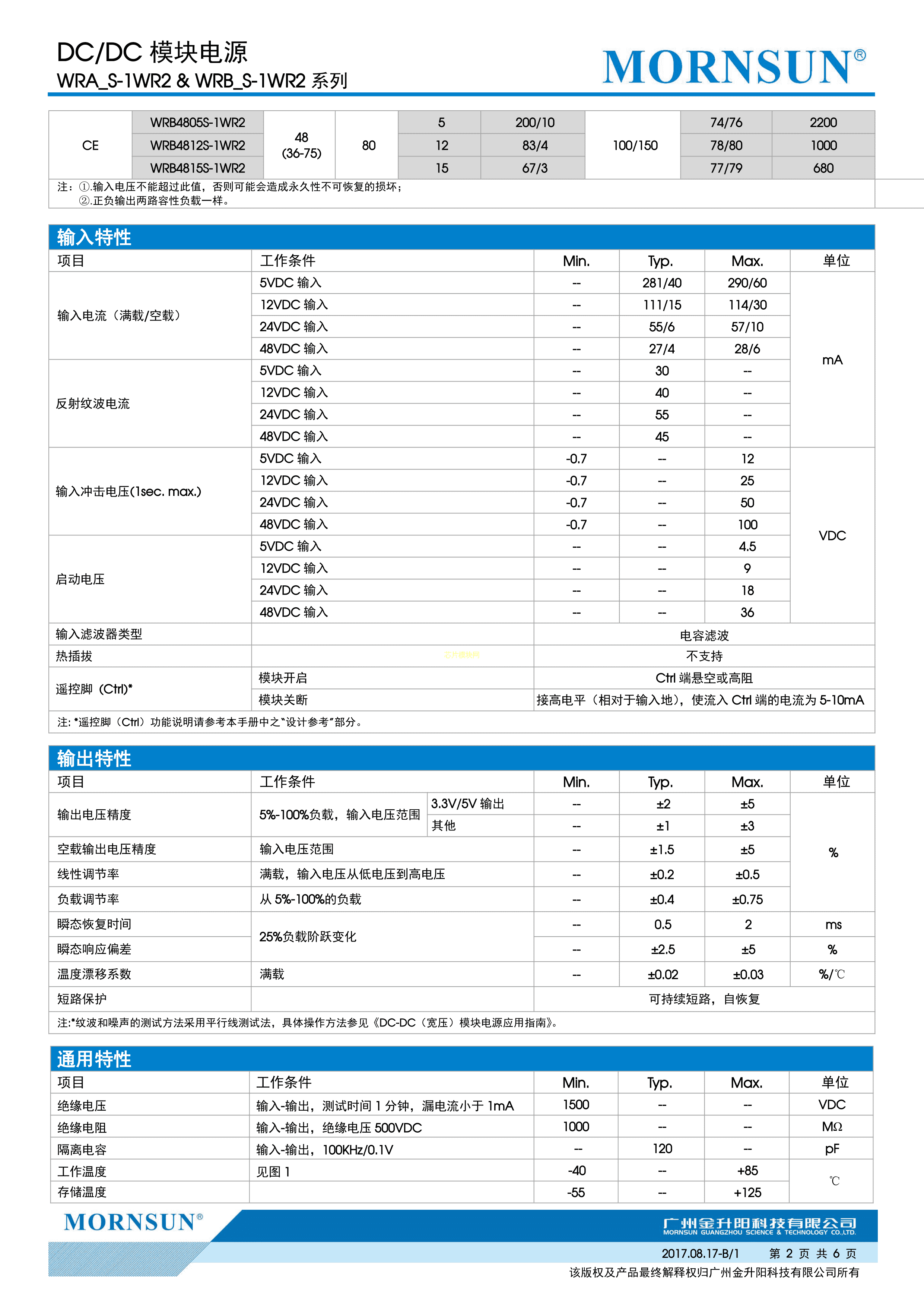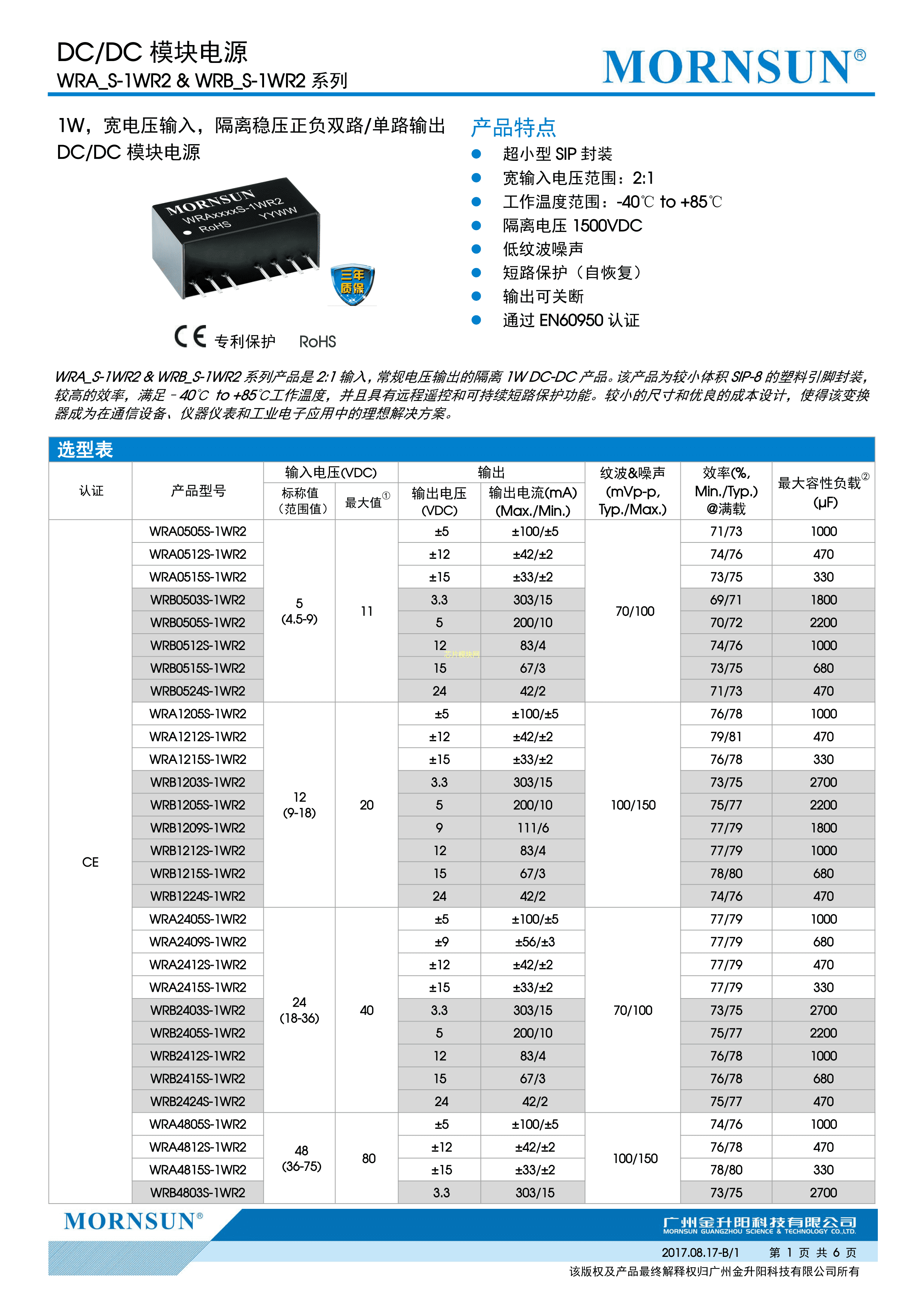 WRB1205S-1WR2数据手册插件封装MORNSUN(金升阳)PDF规格书,中英文下载