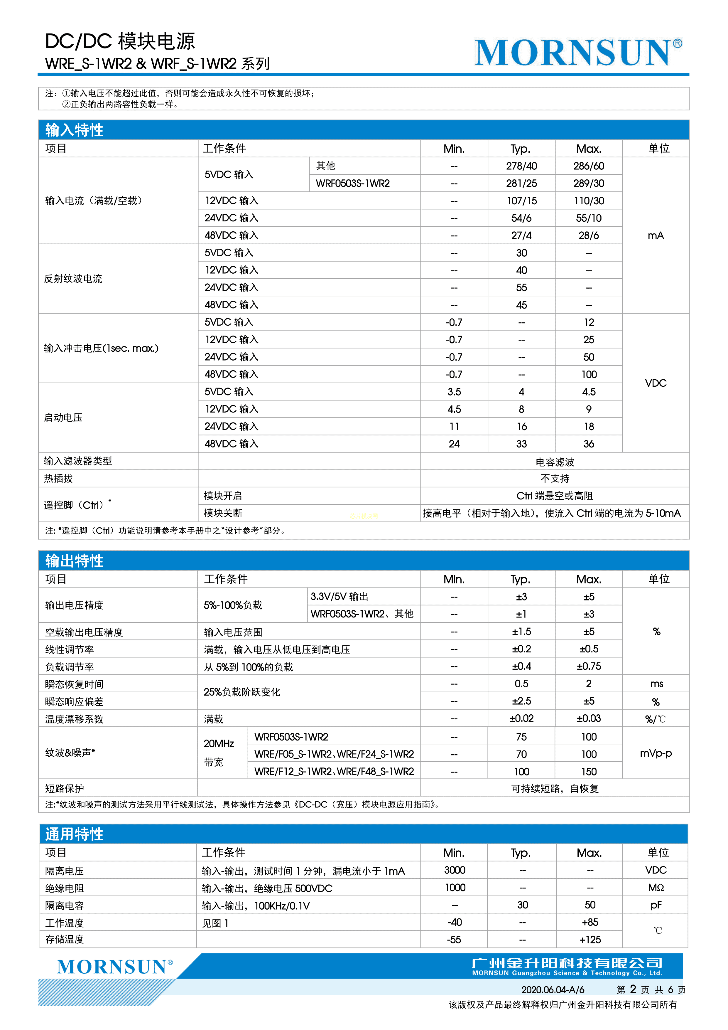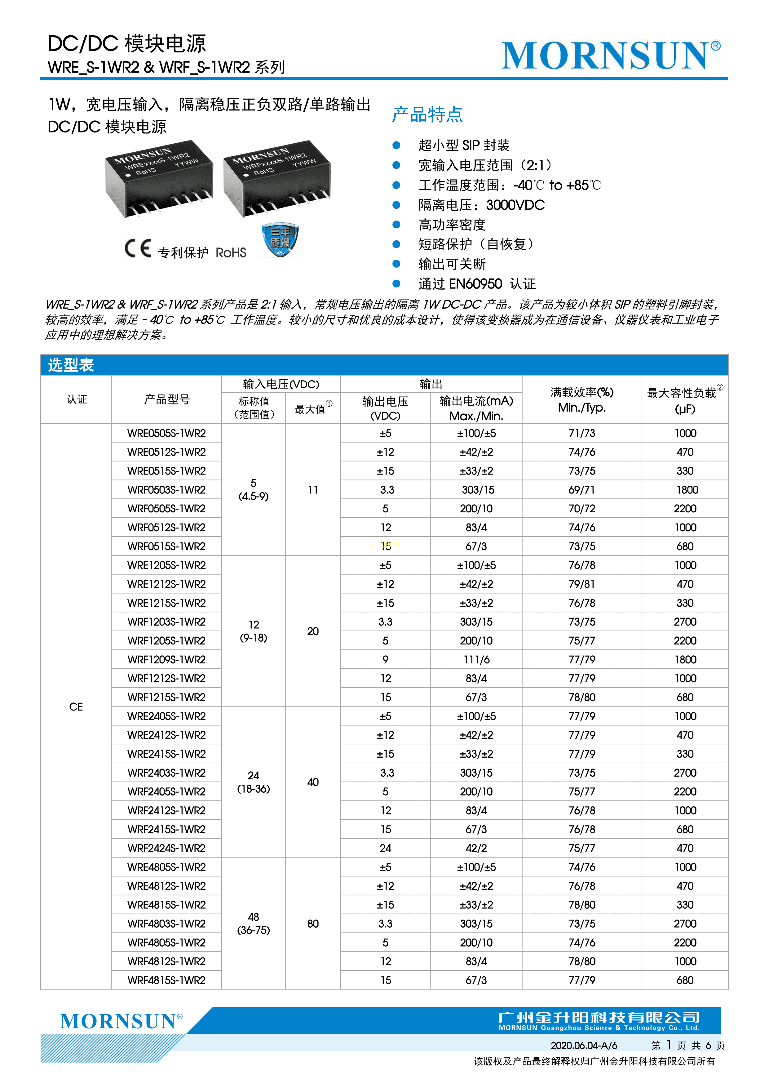 WRE2412S-1WR2数据手册插件封装MORNSUN(金升阳)PDF规格书,中英文下载