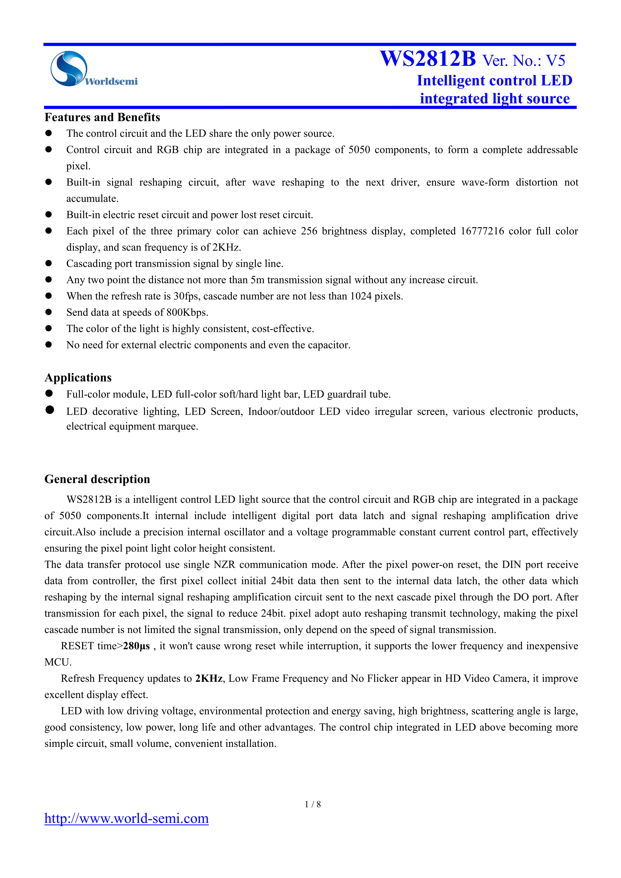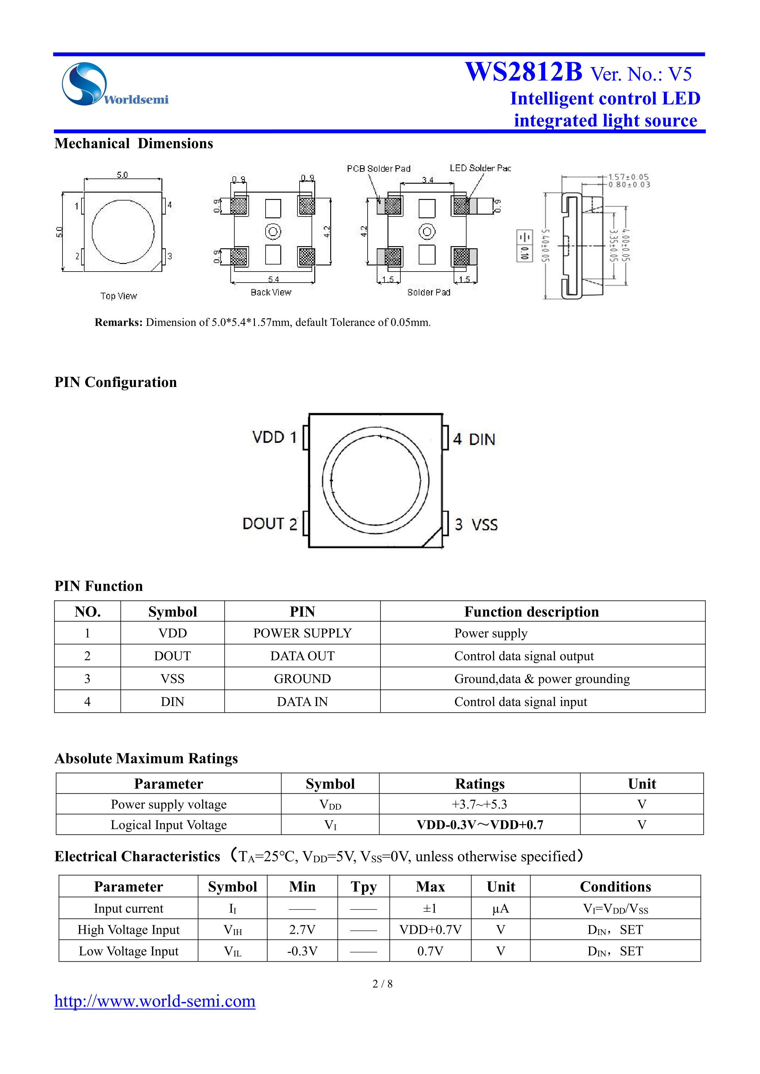 WS2812B-B-W数据手册SMD5x5mm封装worldsemiPDF规格书,中英文下载