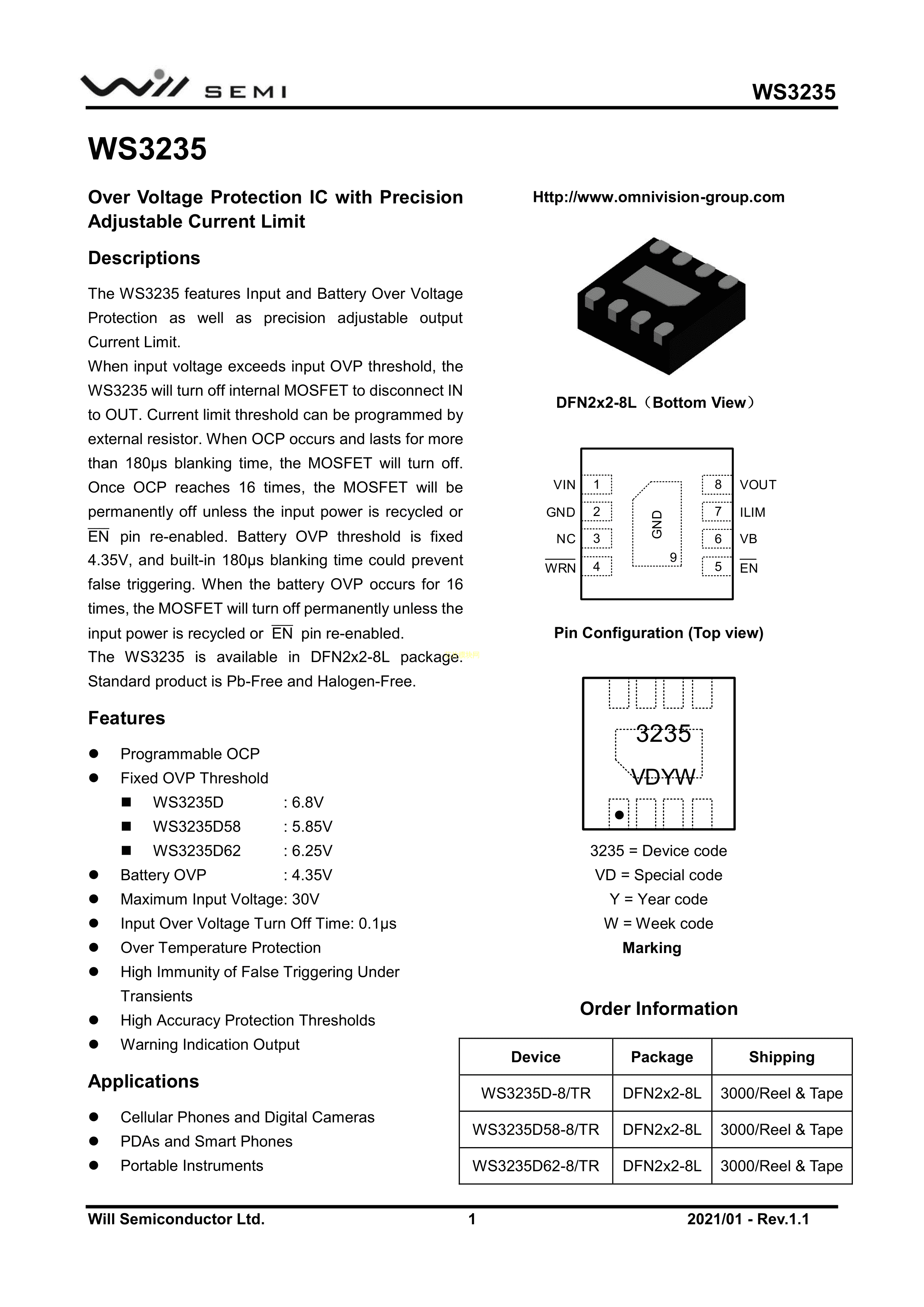 WS3235D-8-TR数据手册DFN2x2-8L封装WILLSEMI(韦尔)PDF规格书,中英文下