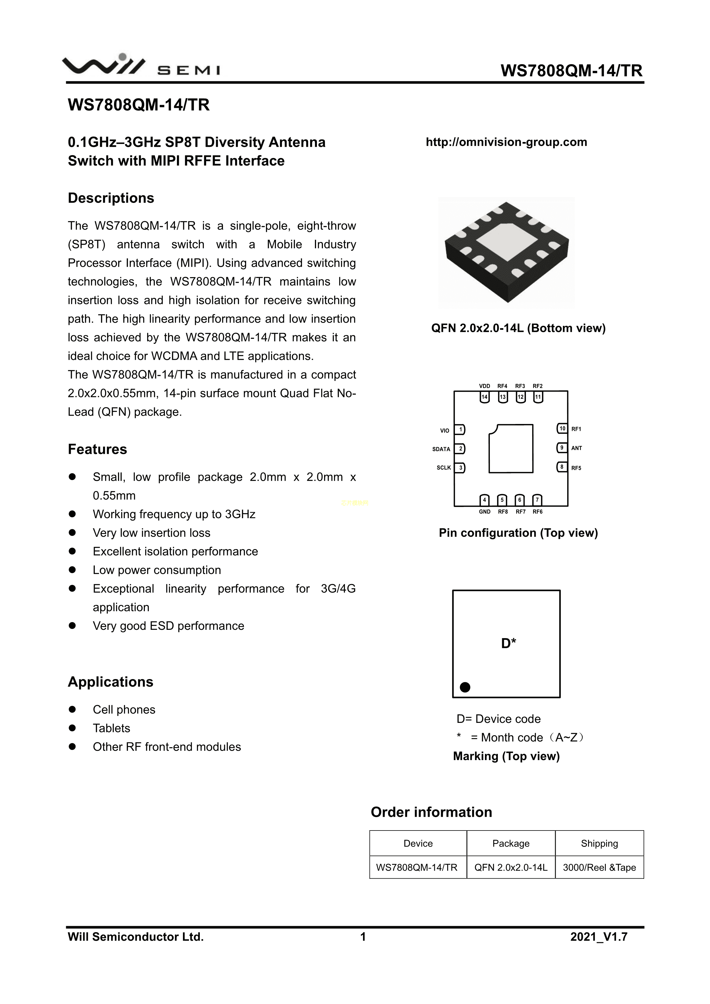 WS7808QM-14-TR数据手册QFN2.0x2.0-14L封装WILLSEMI(韦尔)PDF规
