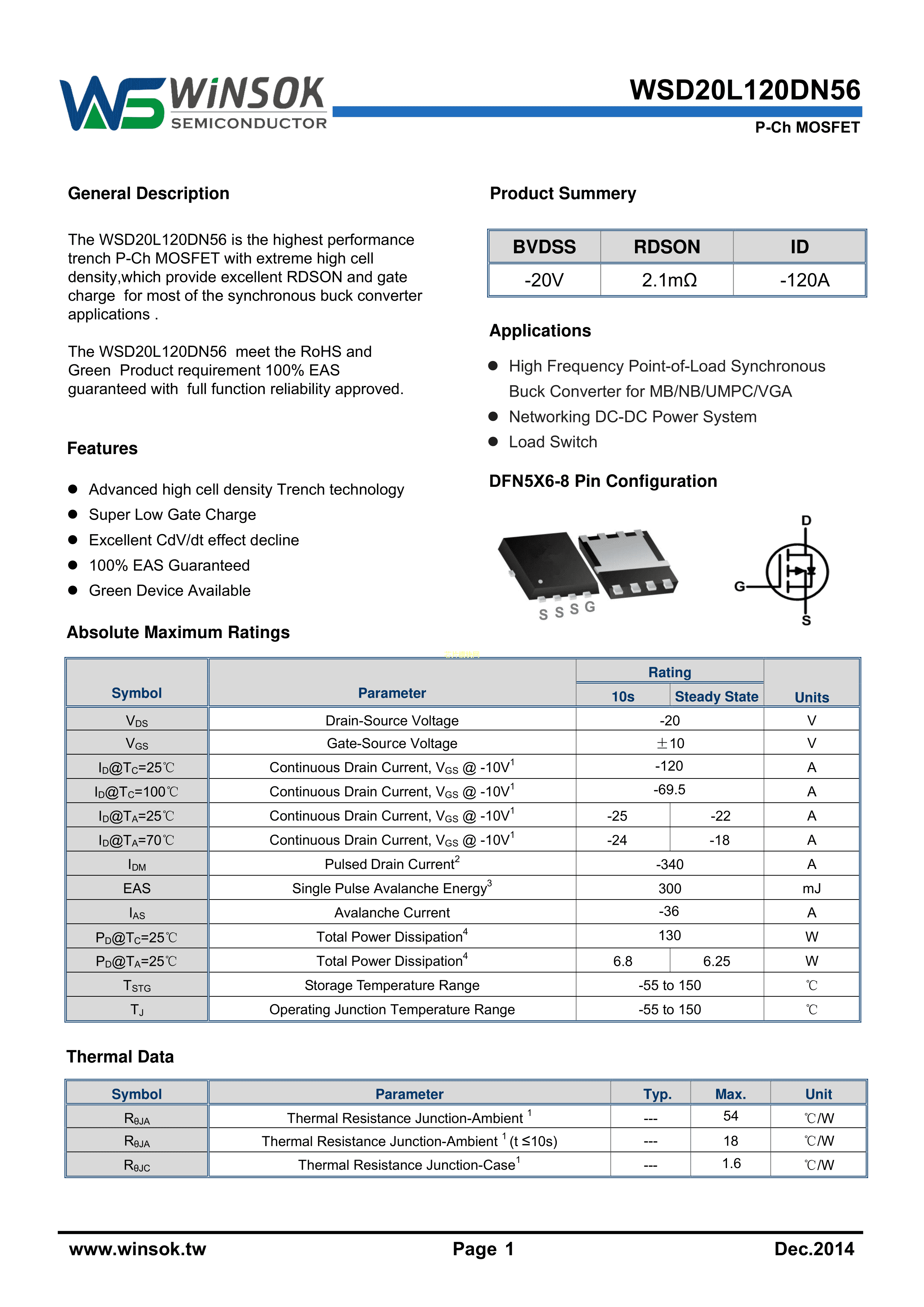 WSD20L120DN数据手册DFN-8封装WINSOK(微硕)PDF规格书,中英文下载