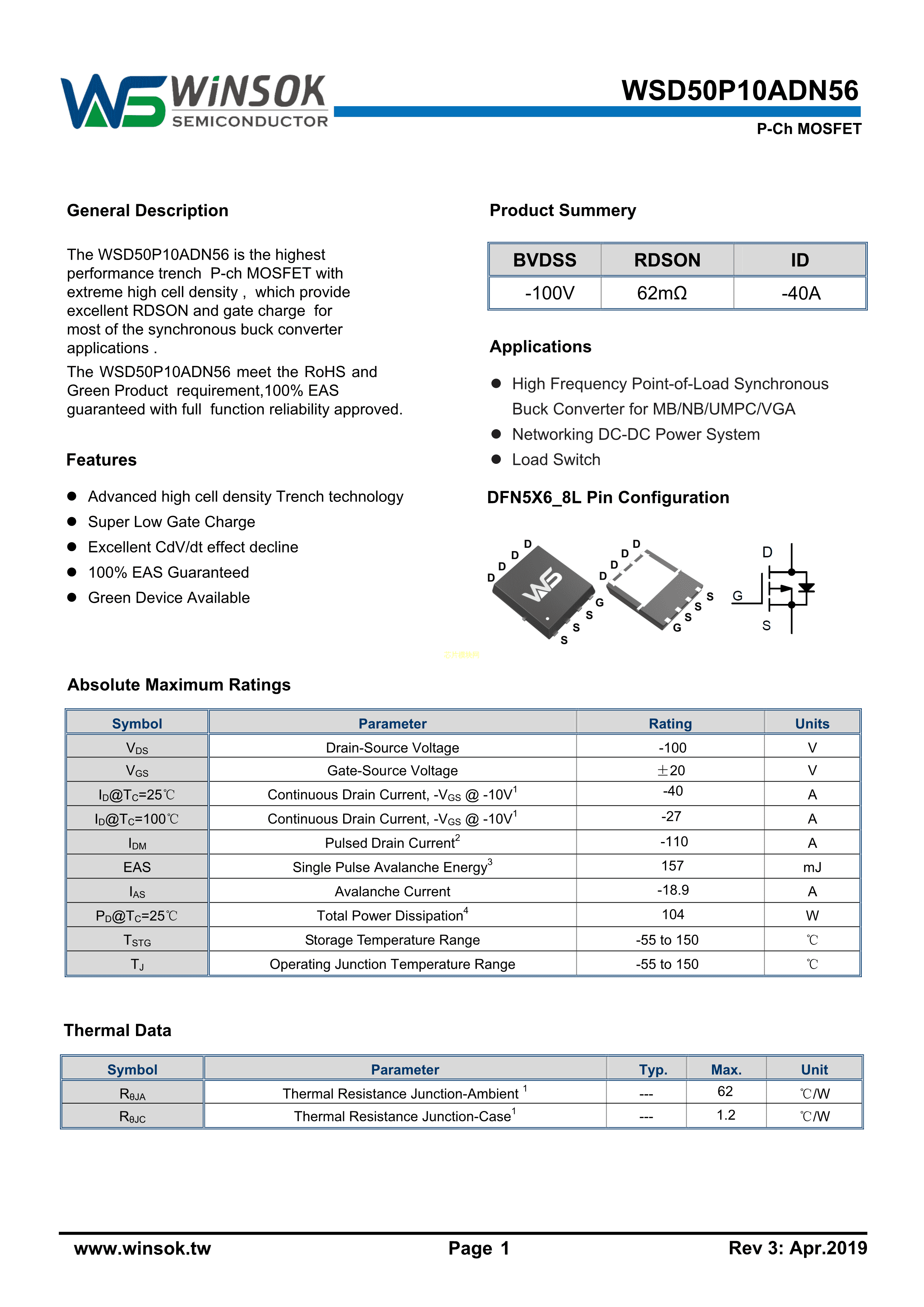 WSD50P10ADN56数据手册DFN5X6-8封装WINSOK(微硕)PDF规格书,中英文下载