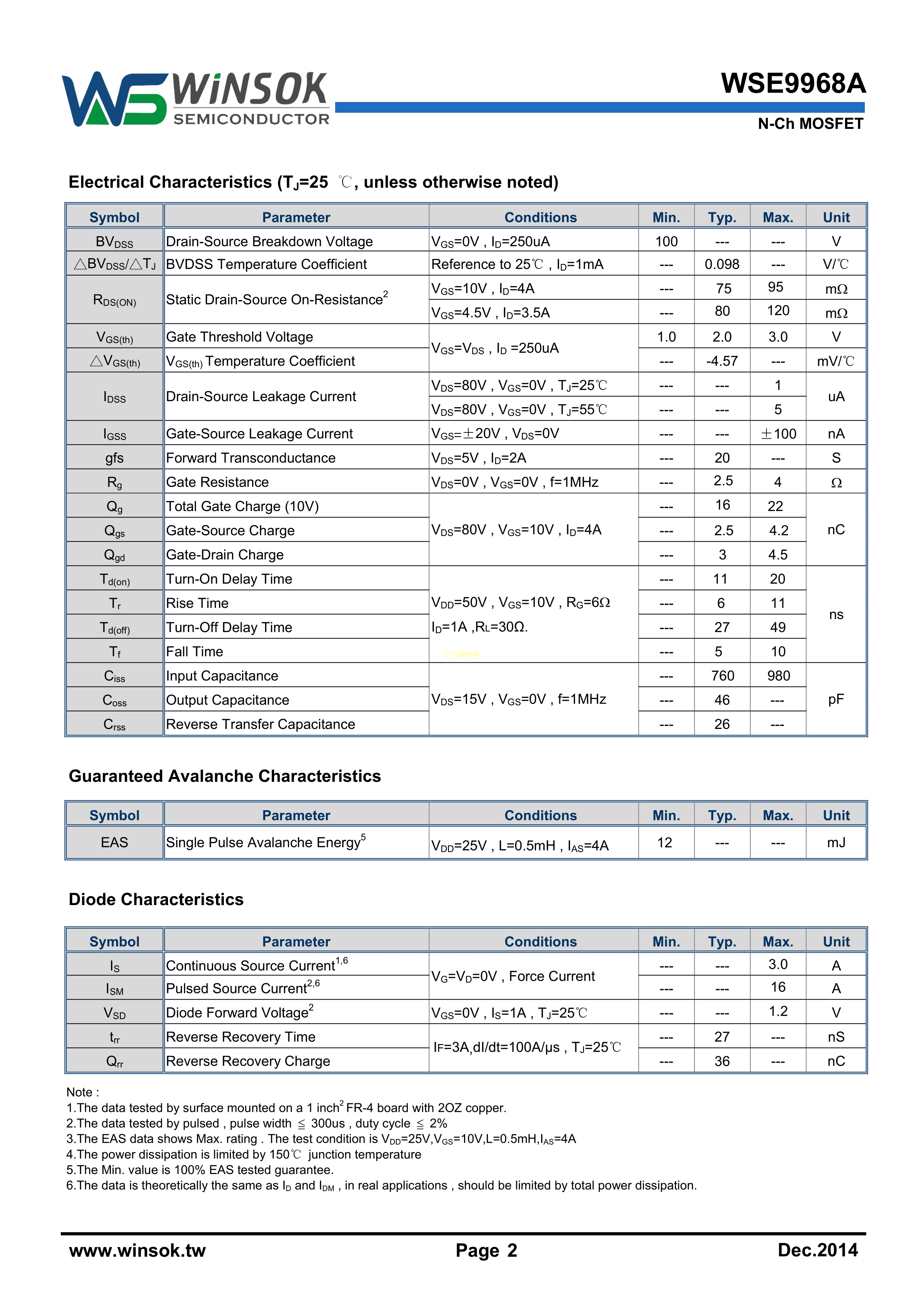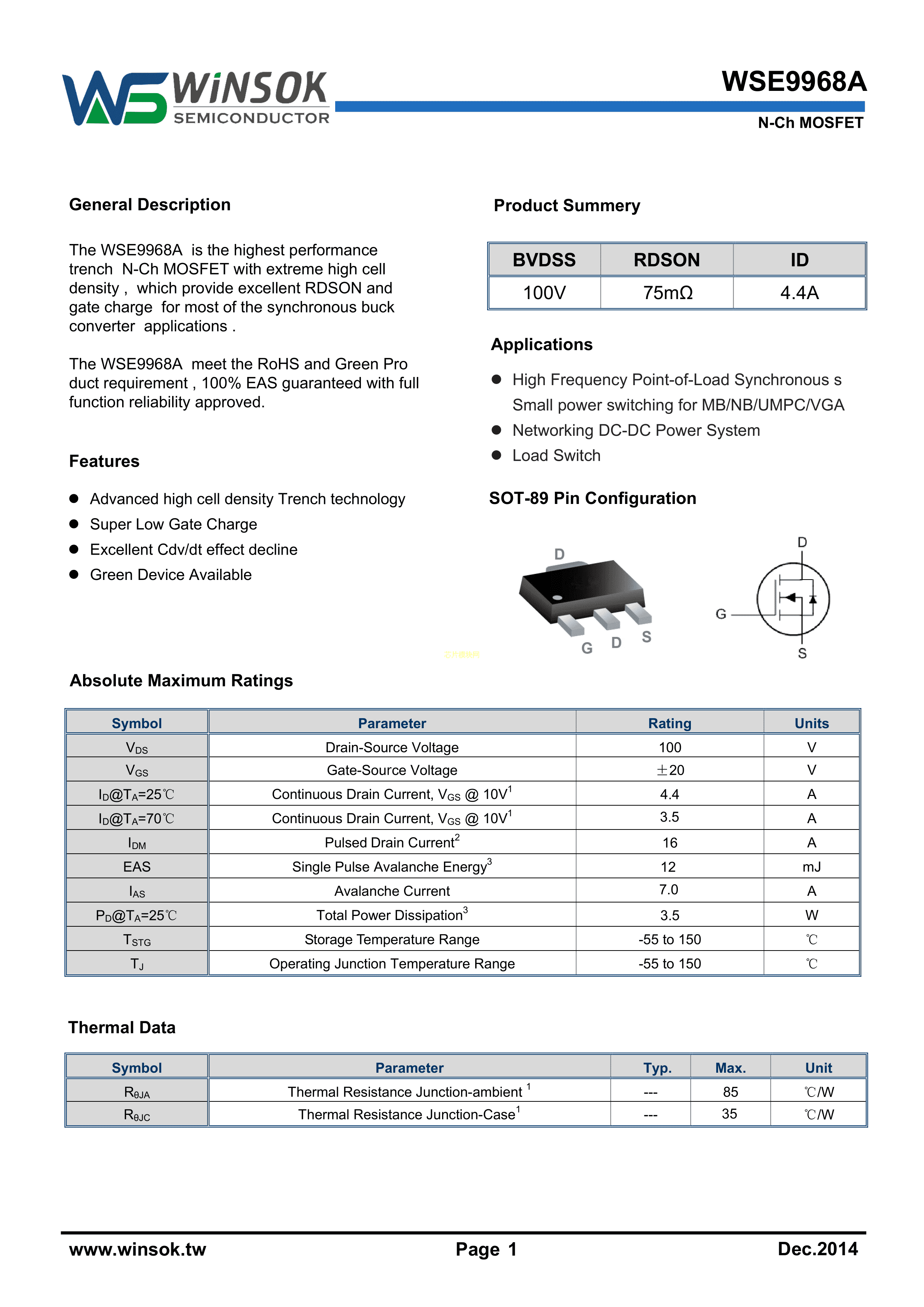 WSE9968A数据手册SOT-89(SOT-89-3)封装WINSOK(微硕)PDF规格书,中英文下载