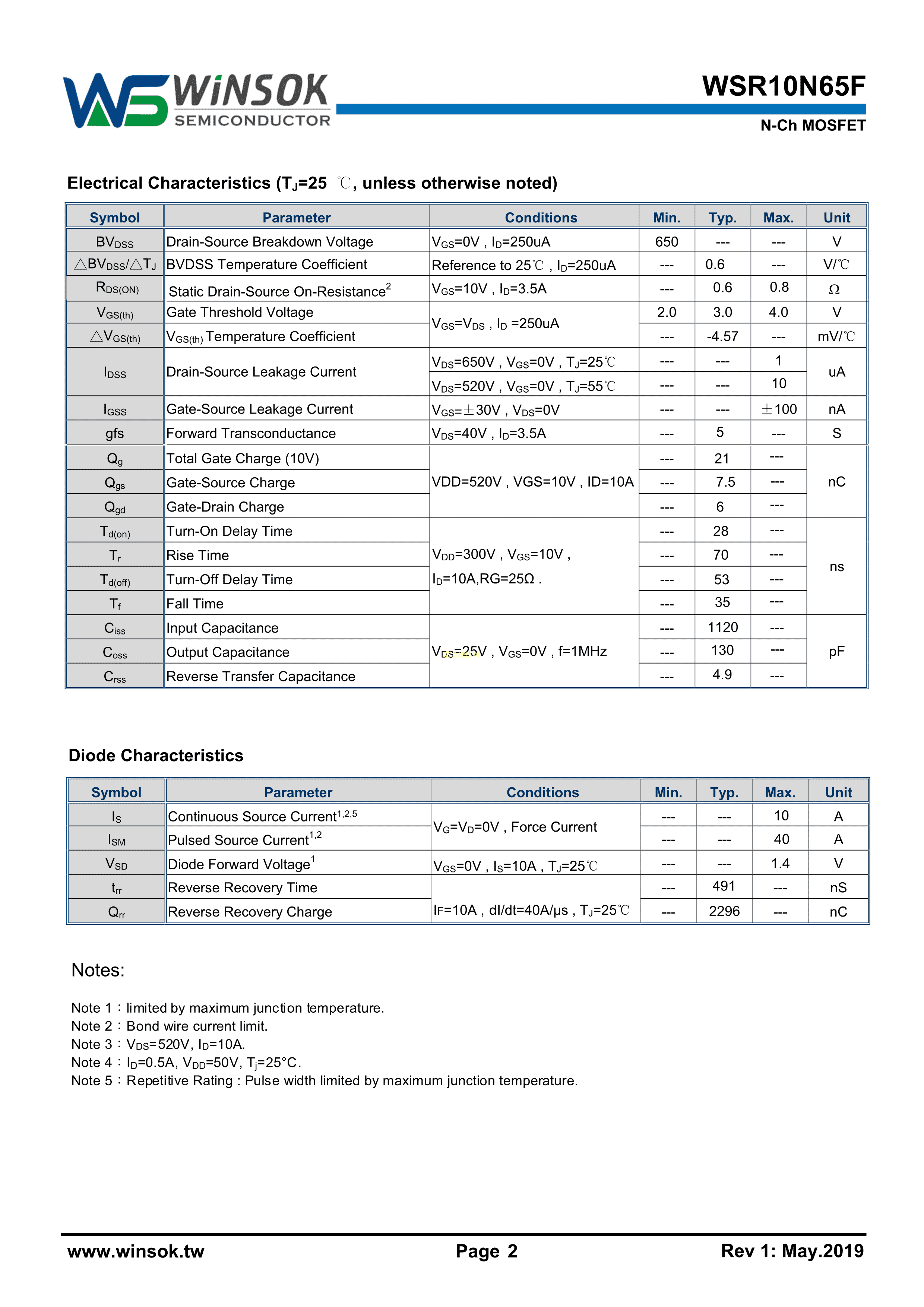 WSR10N65F数据手册TO-220F封装WINSOK(微硕)PDF规格书,中英文下载