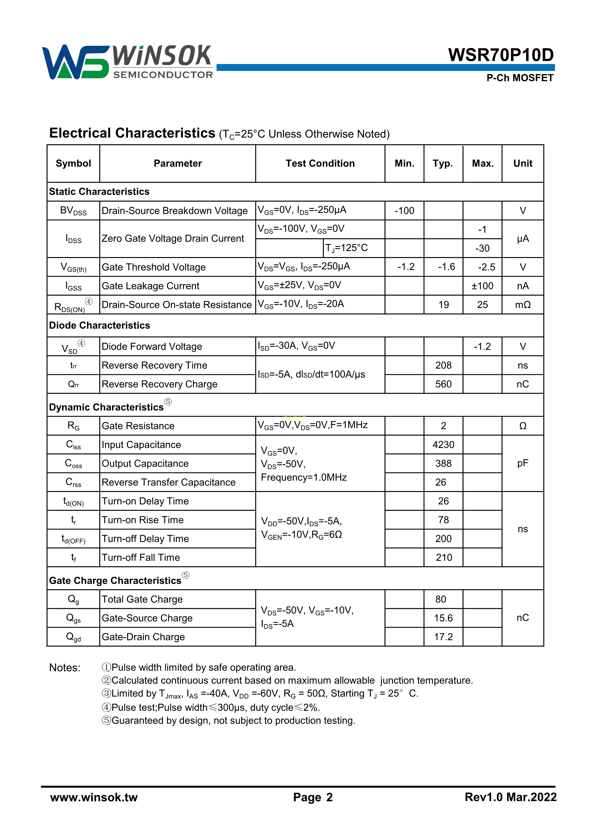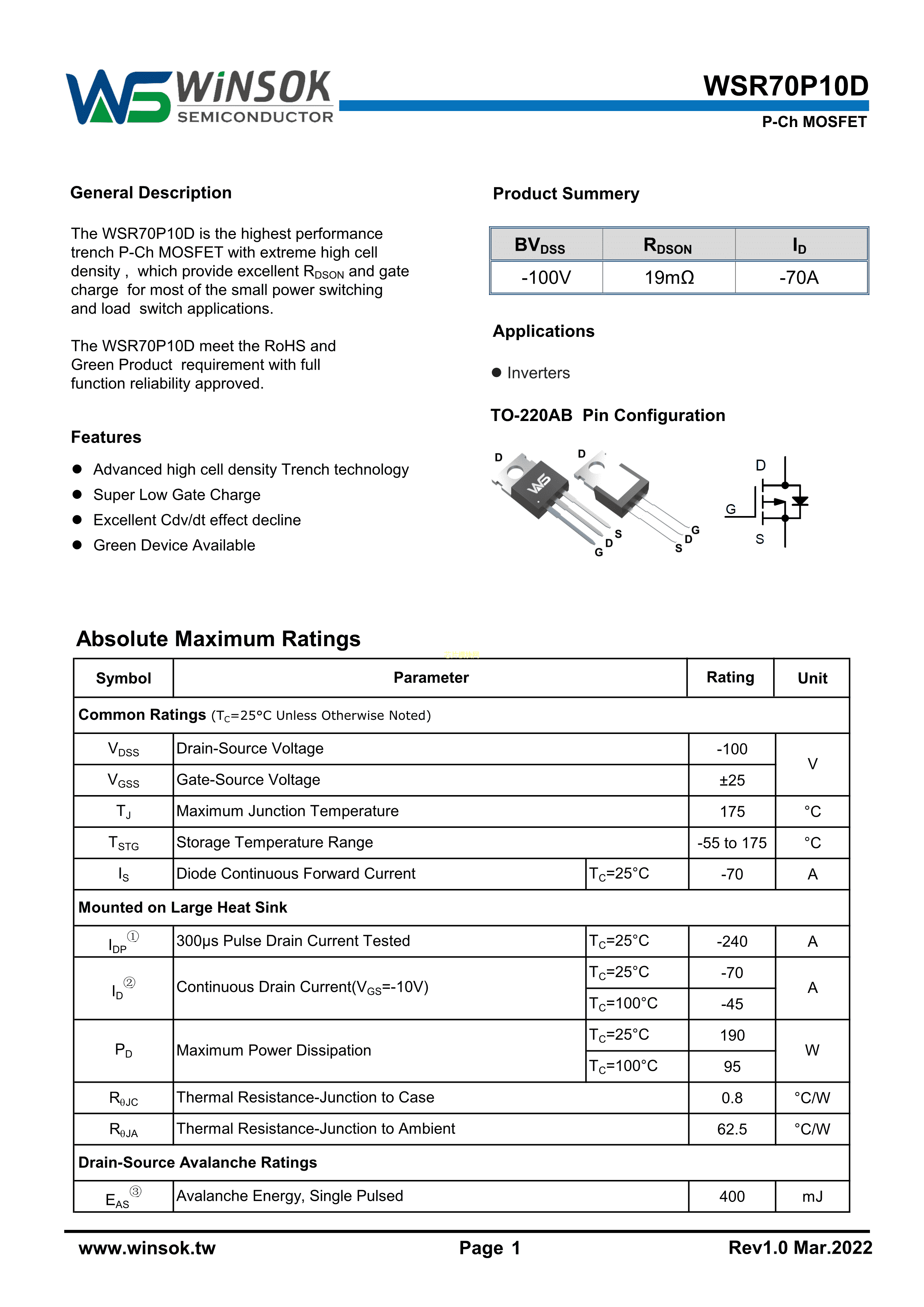 WSR70P10D数据手册TO-220封装WINSOK(微硕)PDF规格书,中英文下载