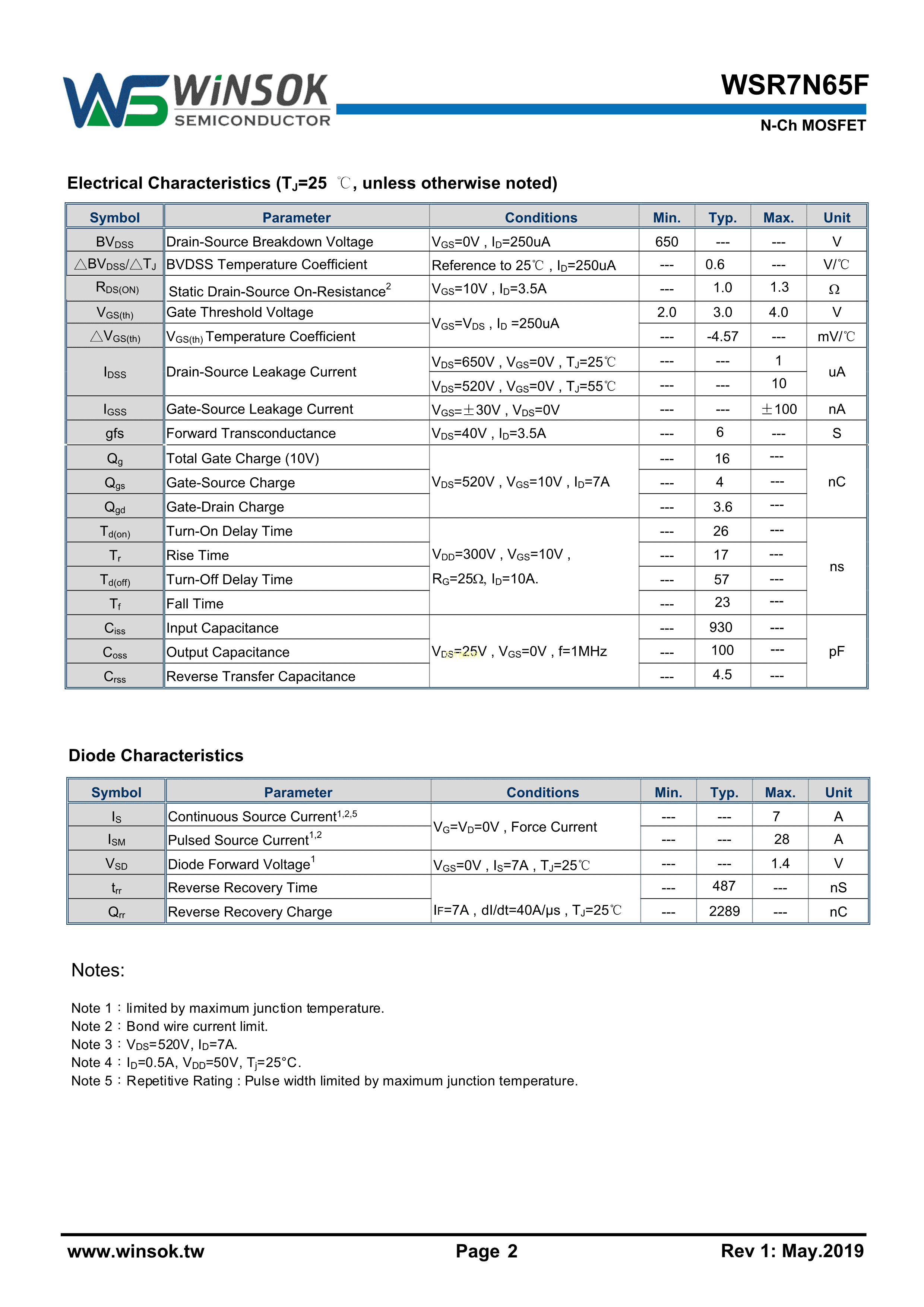 WSR7N65F数据手册TO-220F封装WINSOK(微硕)PDF规格书,中英文下载