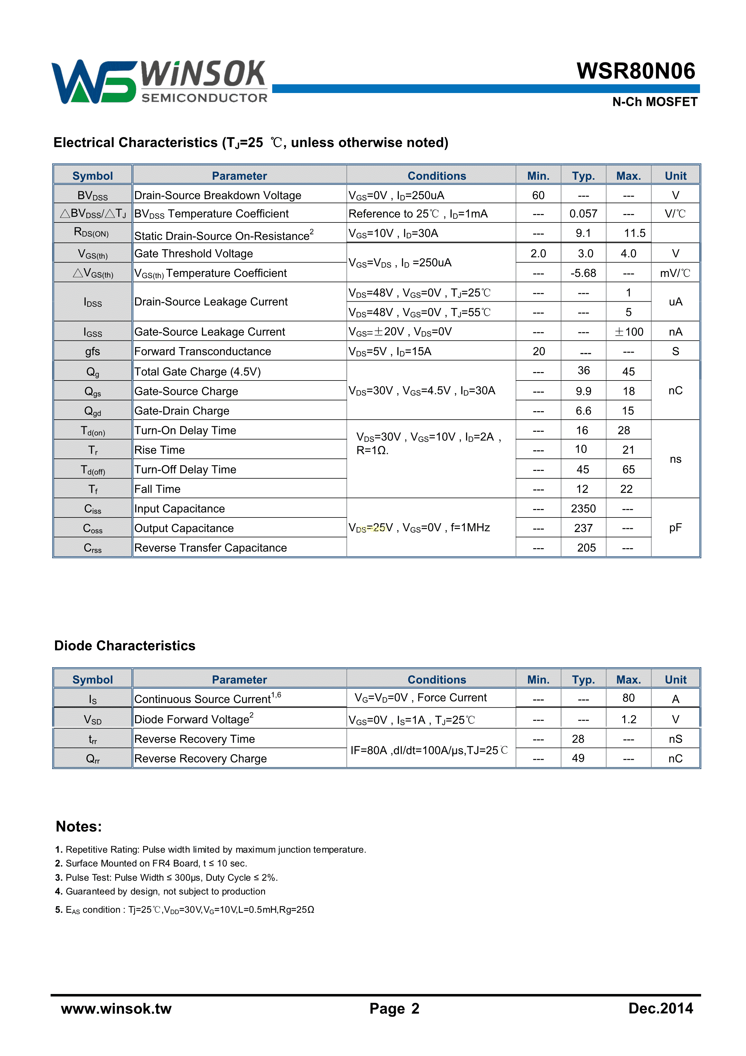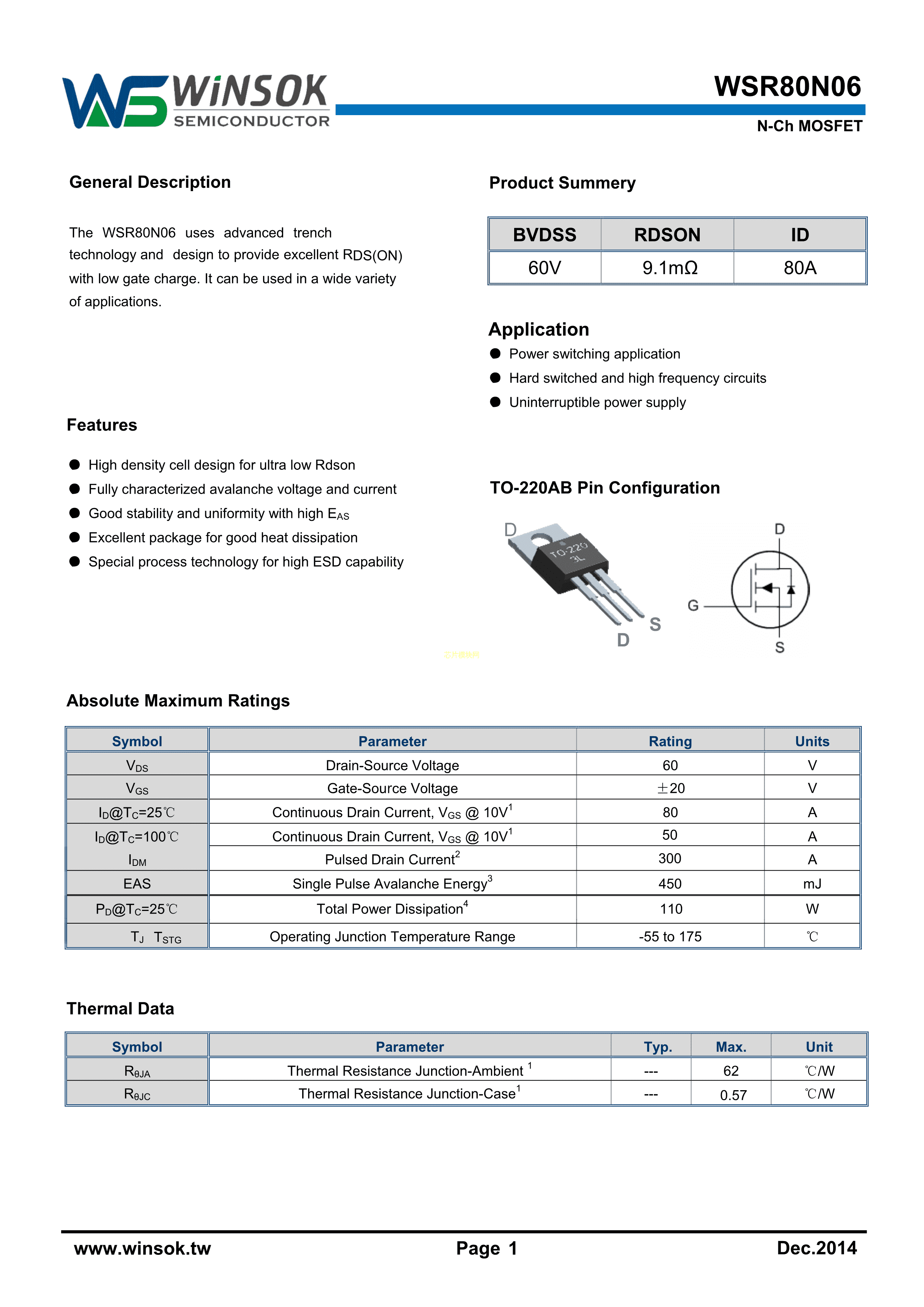 WSR80N06数据手册TO-220AB封装WINSOK(微硕)PDF规格书,中英文下载