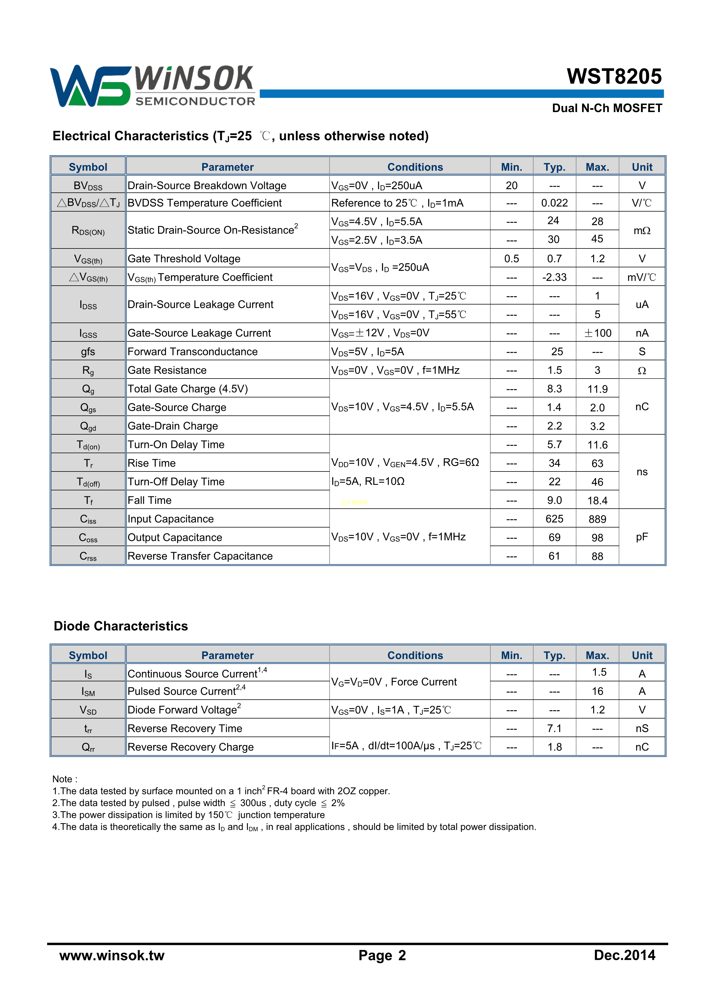 WST8205数据手册SOT-23-6封装WINSOK(微硕)PDF规格书,中英文下载