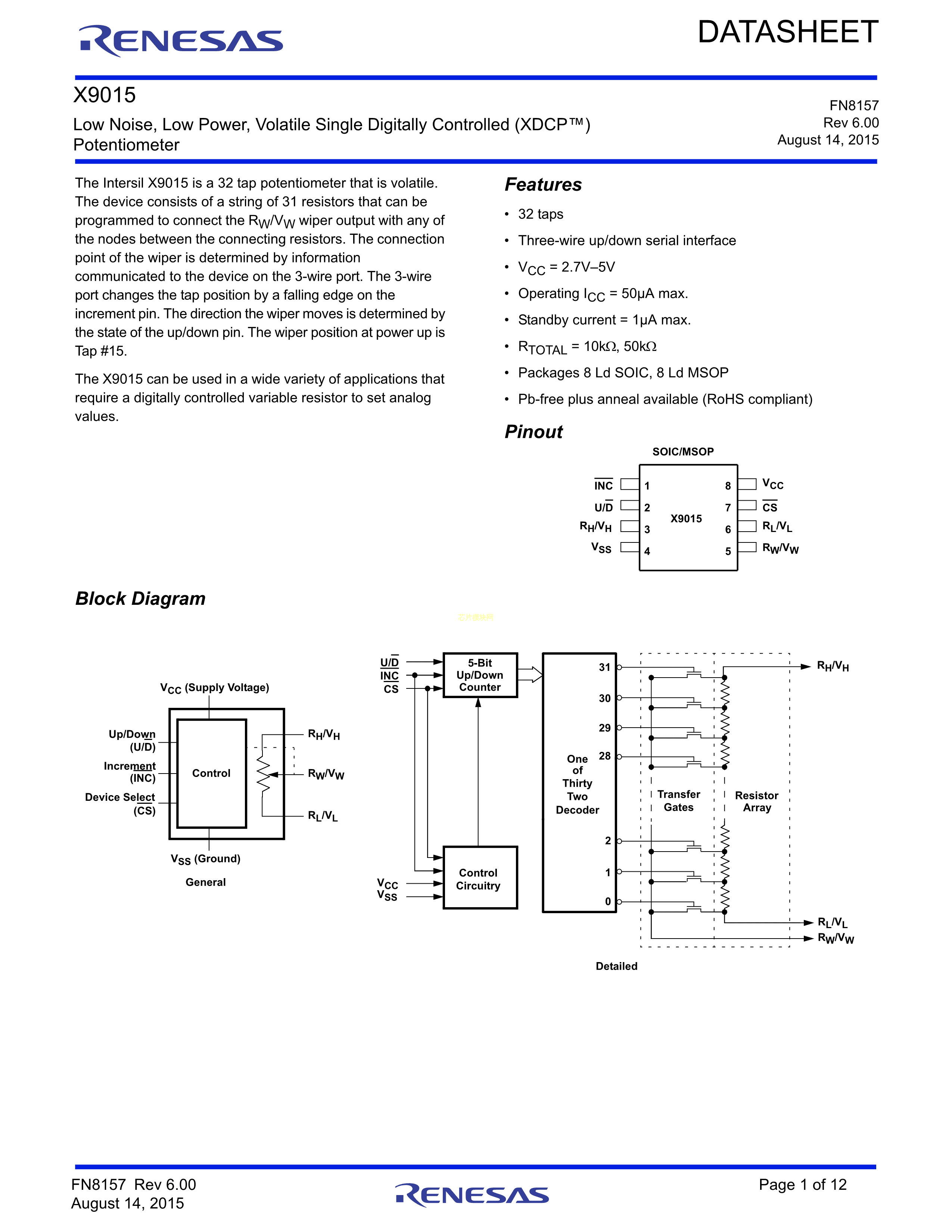X9015UM8IZ-2.7数据手册MSOP-8封装RENESAS(瑞萨)-IDTPDF规格书,中英