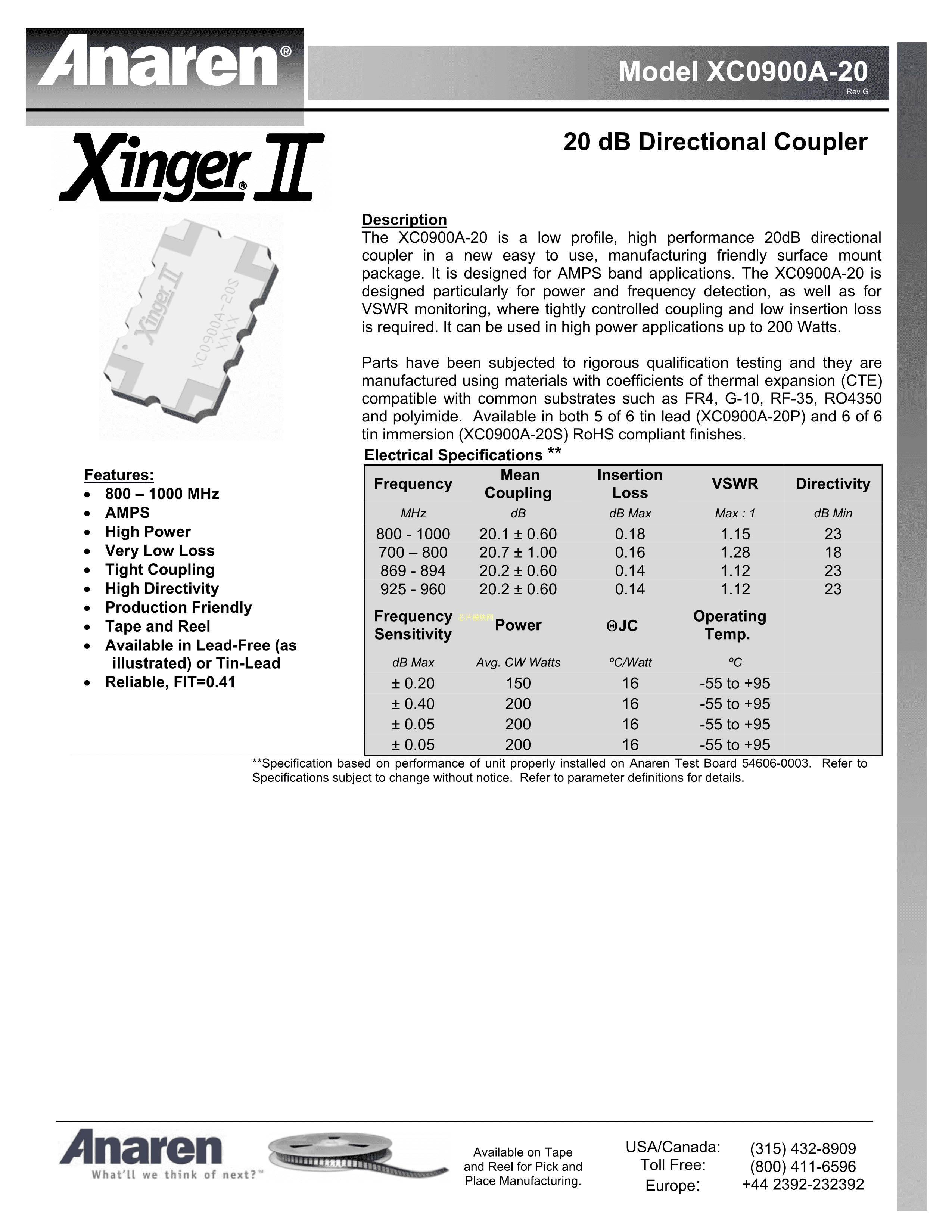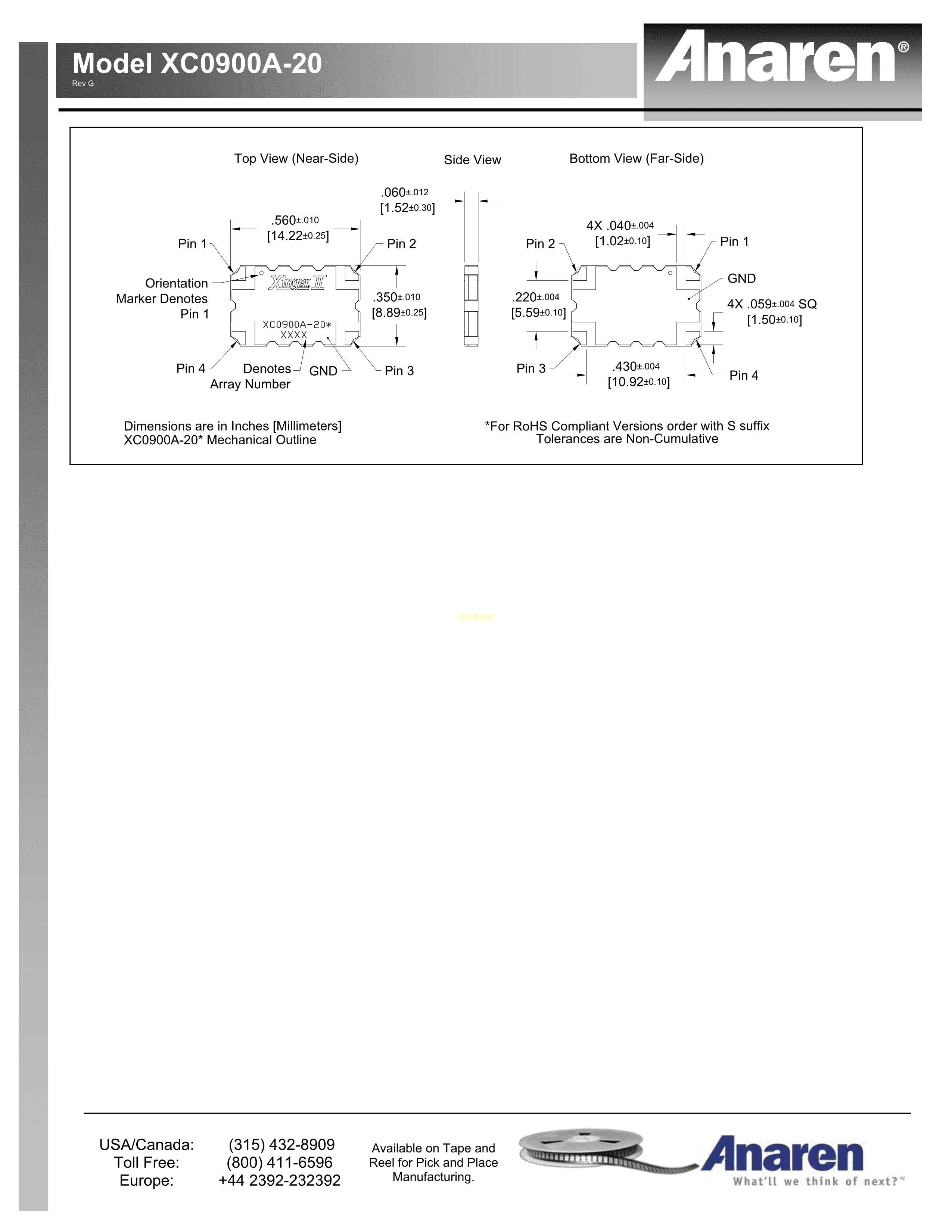 XC0900A-20S数据手册SMD-4封装Anaren(安伦)PDF规格书,中英文下载