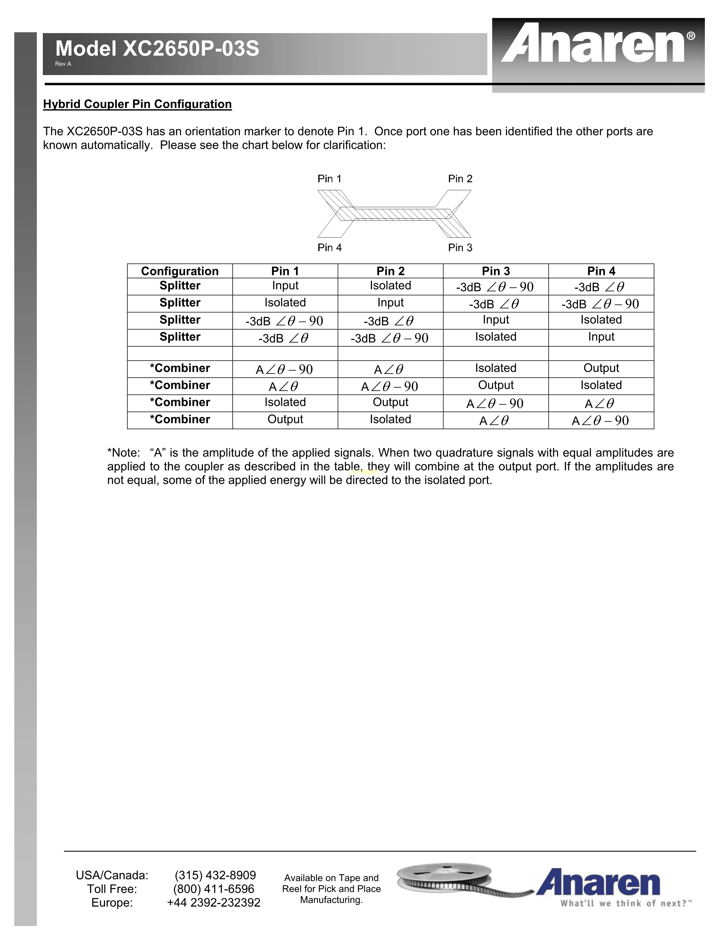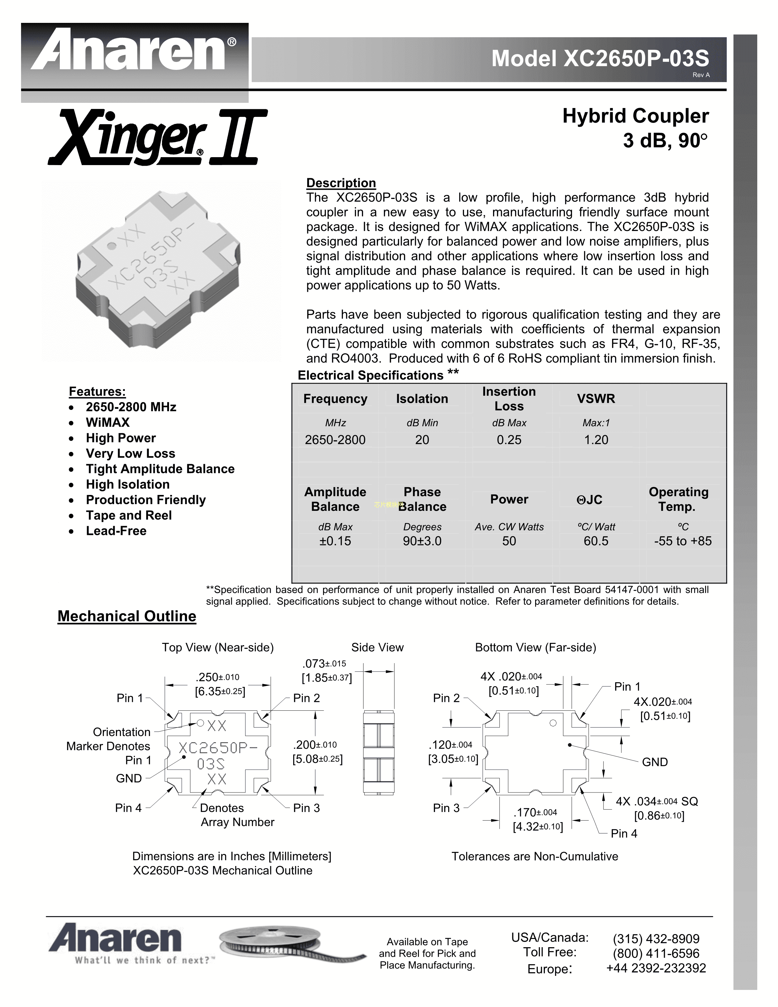 XC2650P-03S数据手册SMD6.35x5.08mm封装Anaren(安伦)PDF规格书,中英