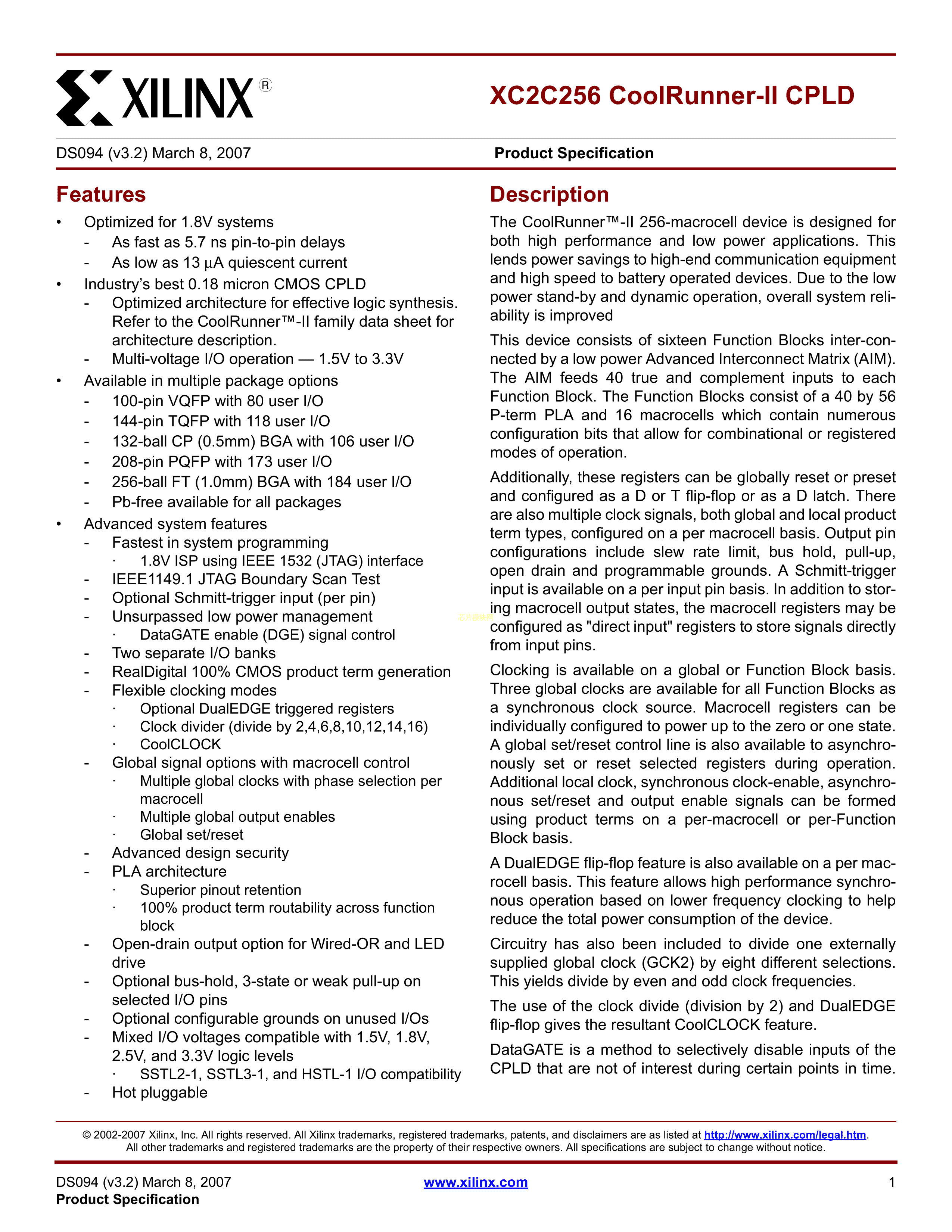 XC2C256-6CP132C数据手册CSPBGA-132(8x8)封装XILINX(赛灵思)PDF
