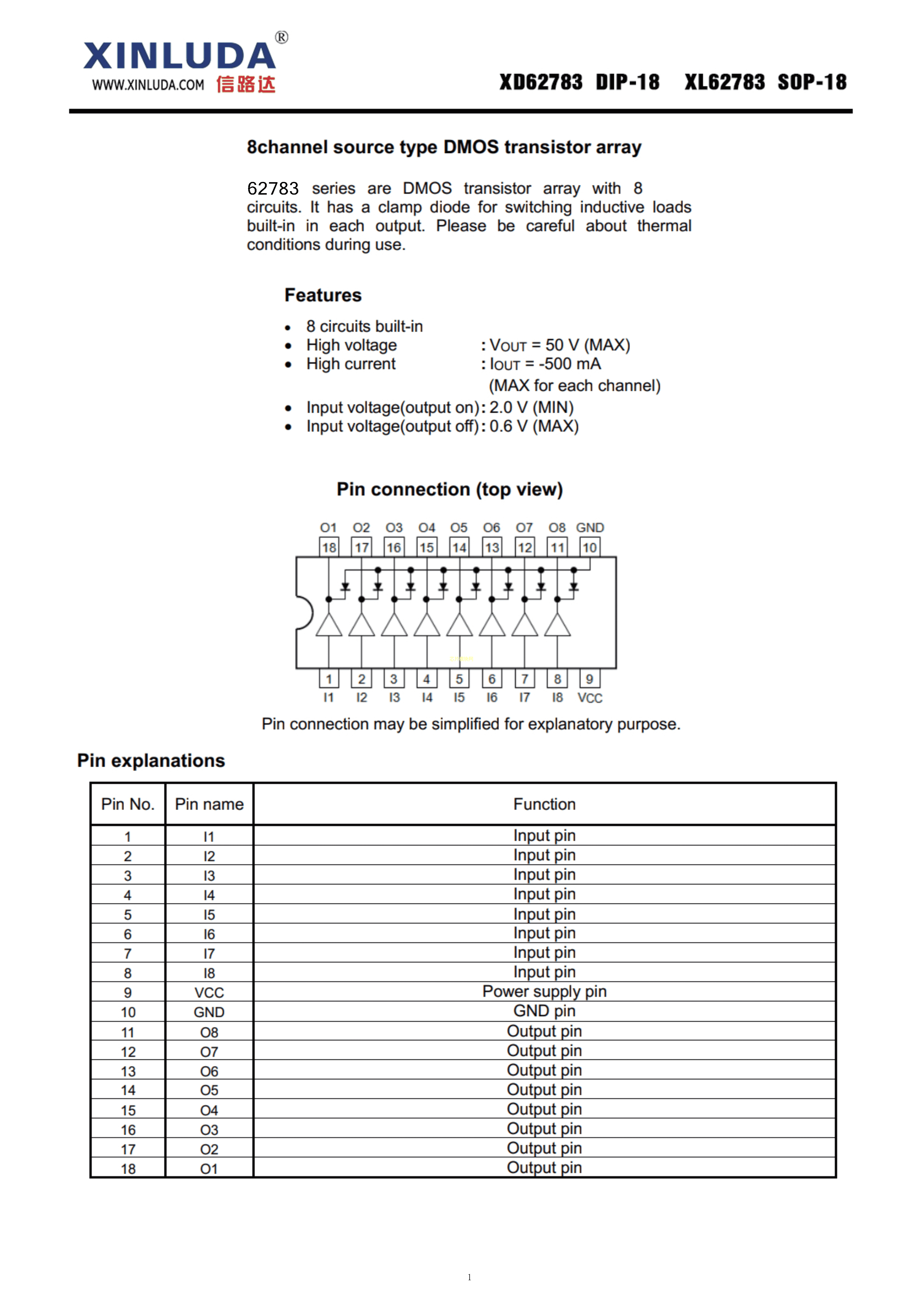 XD62783数据手册DIP-18封装XINLUDA(信路达)PDF规格书,中英文下载