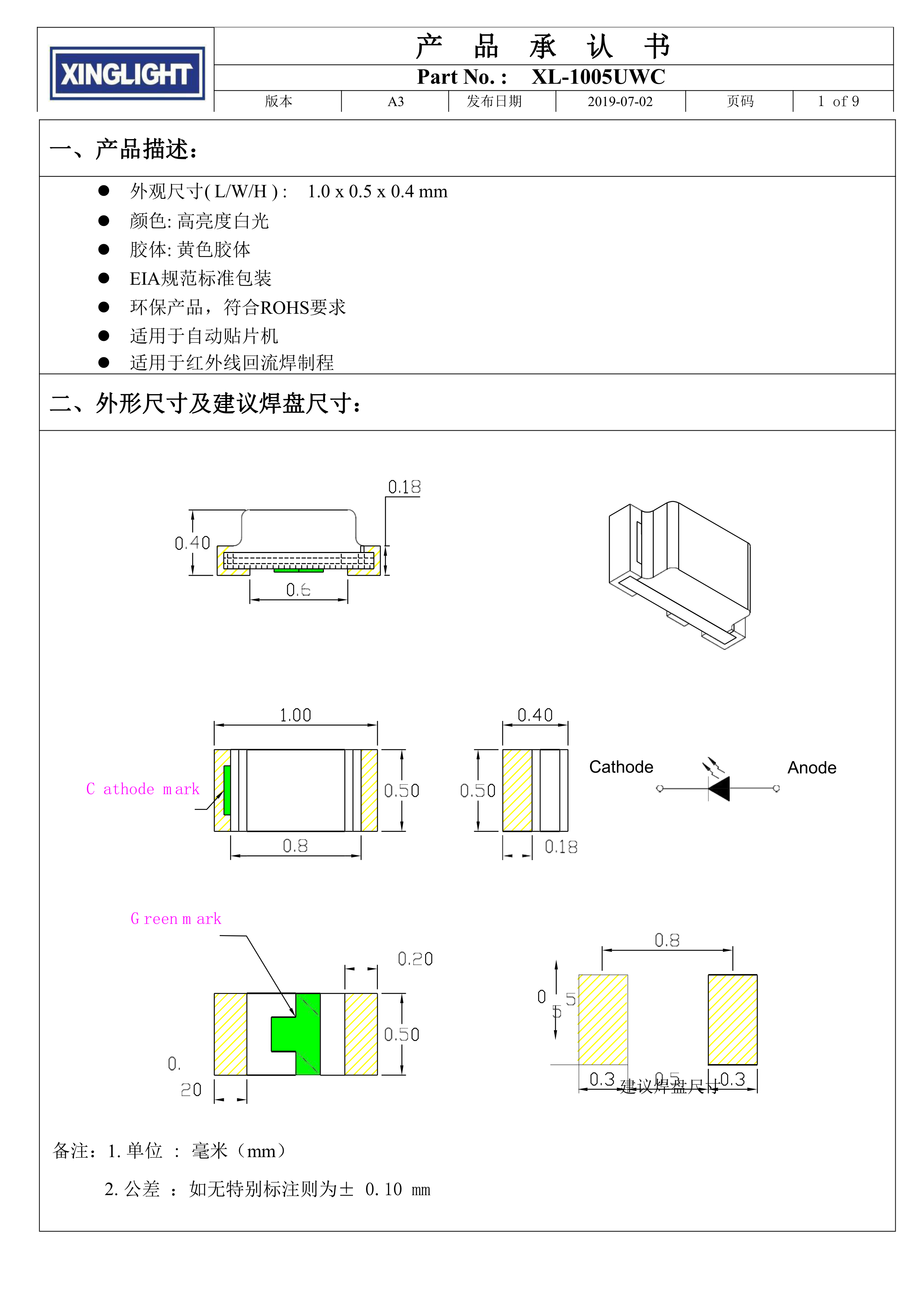 XL-1005UWC数据手册0402封装XINGLIGHT(成兴光)PDF规格书,中英文下载