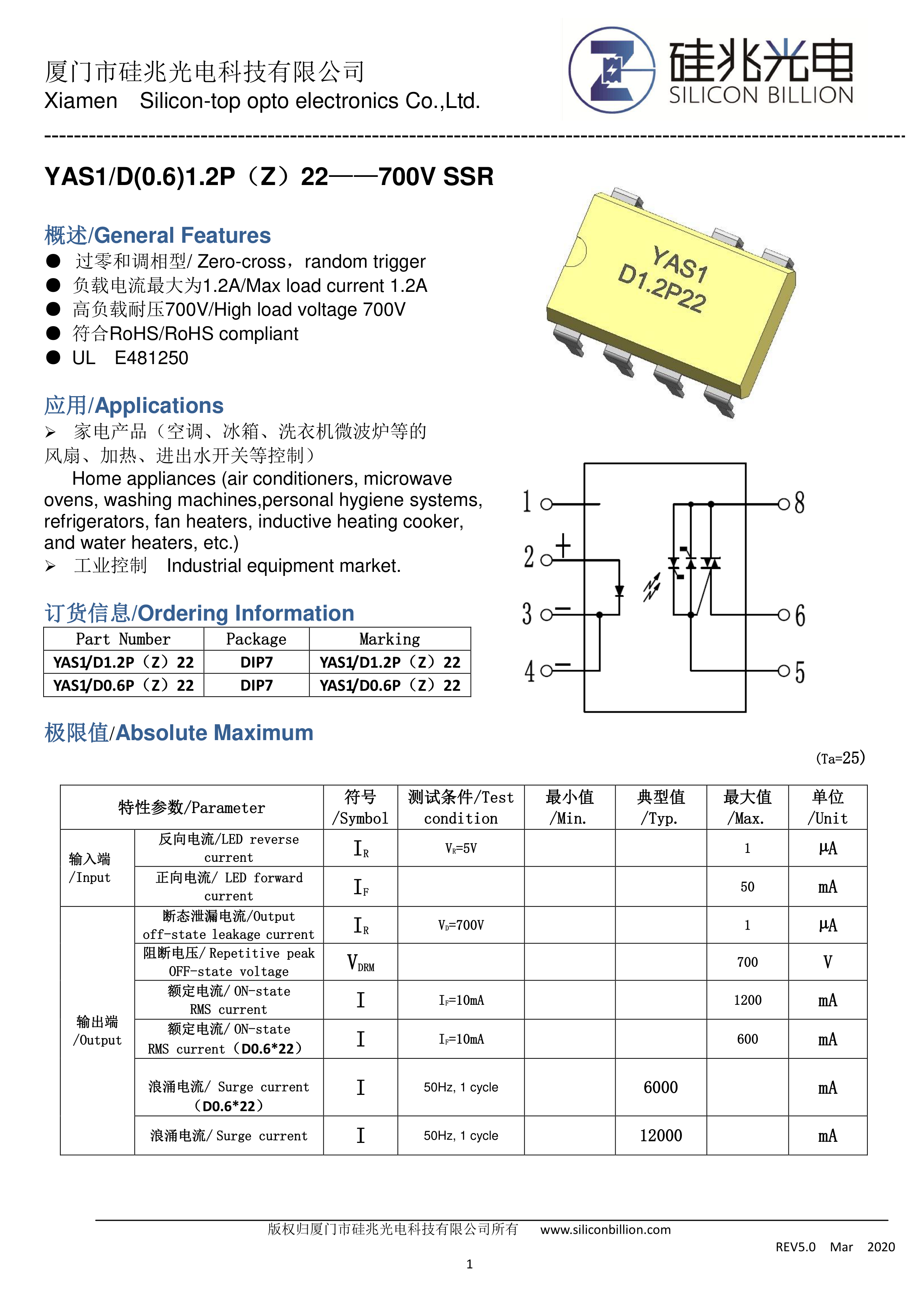 YAS1-D0.6Z22数据手册DIP-7封装Silicon Billion(硅兆)PDF规格书,中