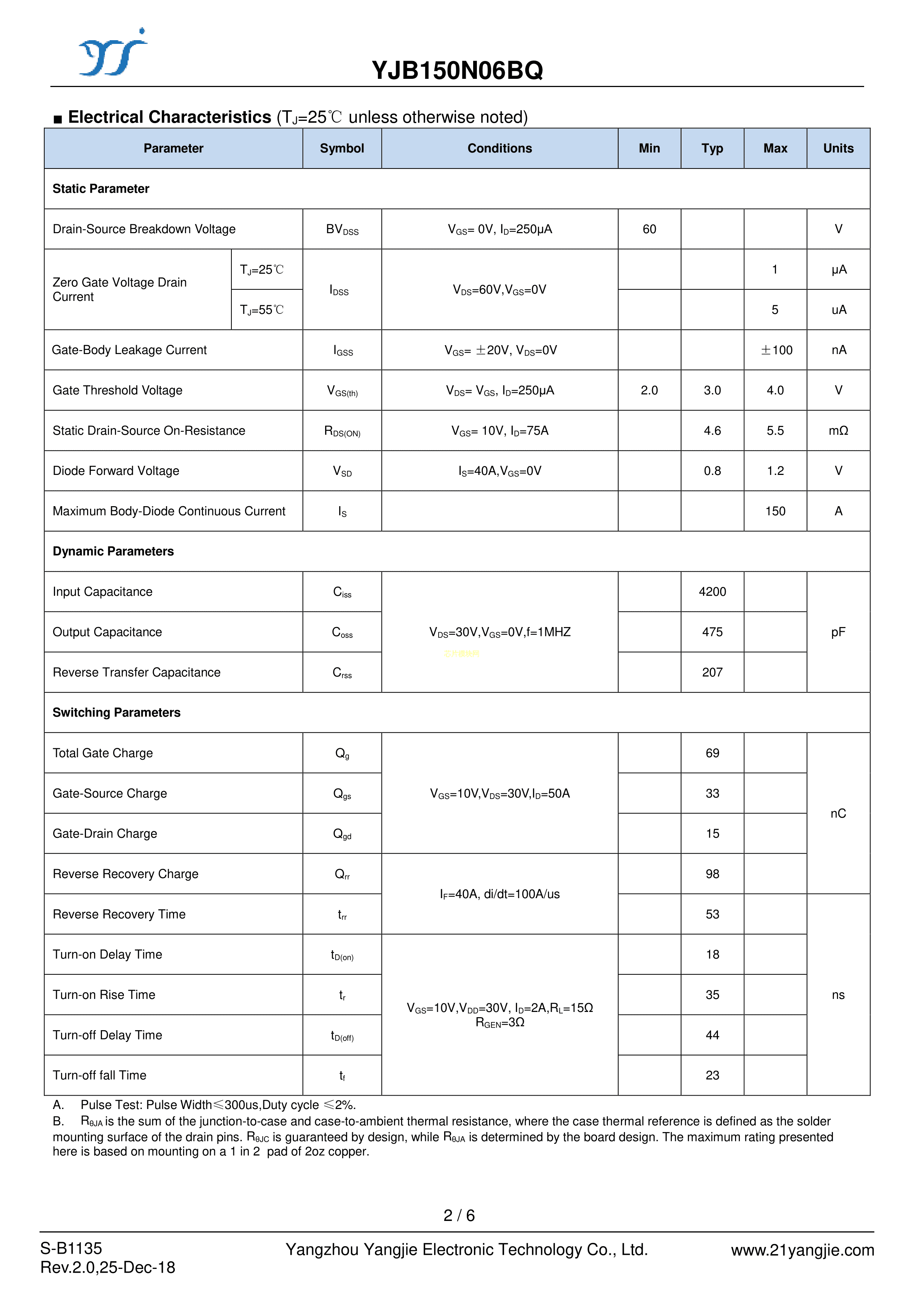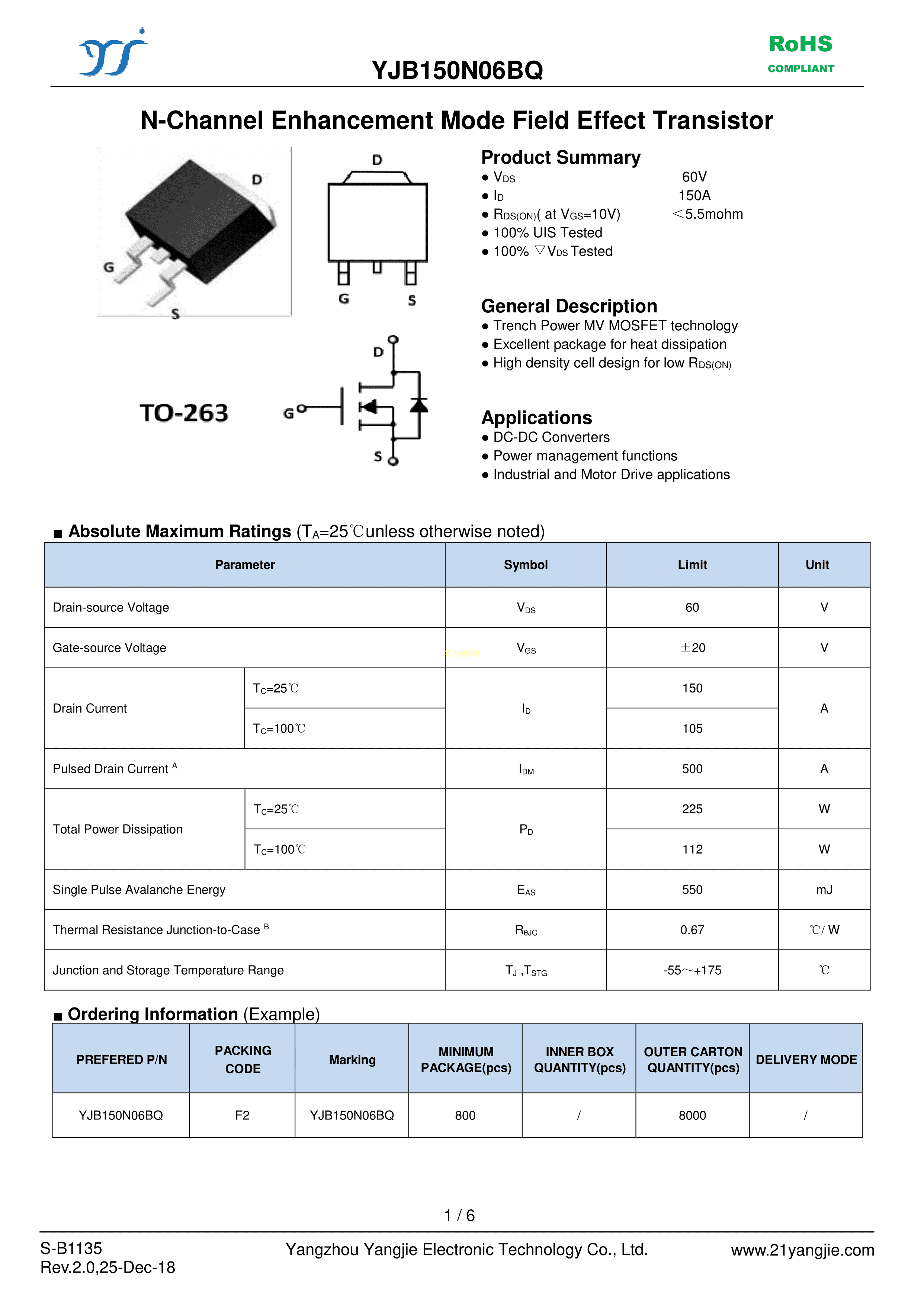 YJB150N06BQ数据手册TO-263封装YANGJIE(扬杰)PDF规格书,中英文下载
