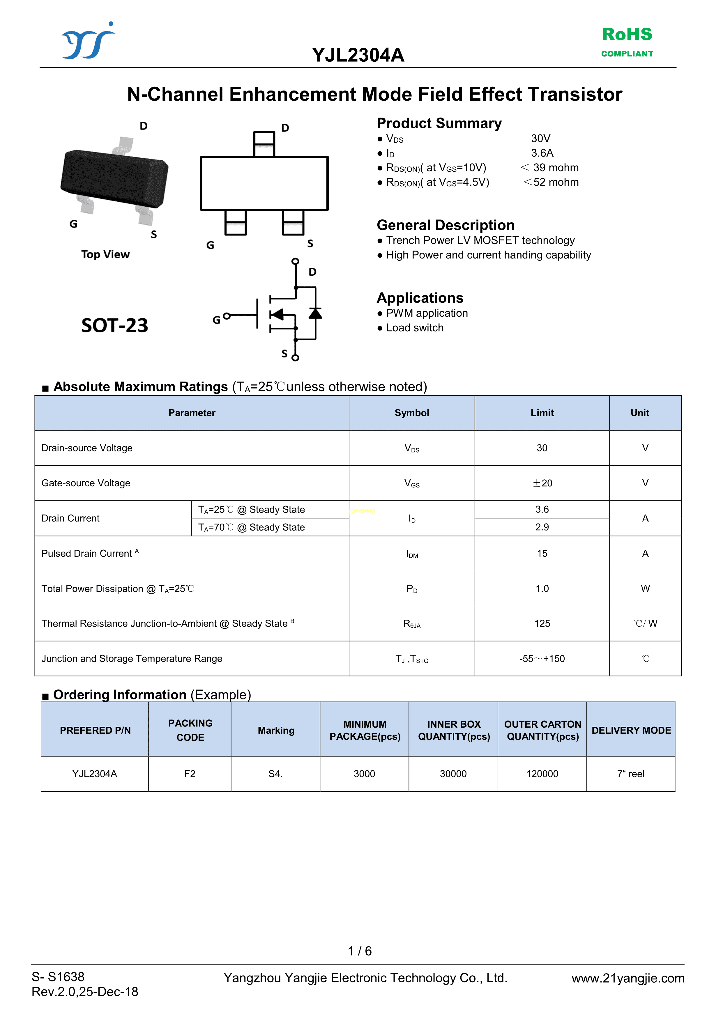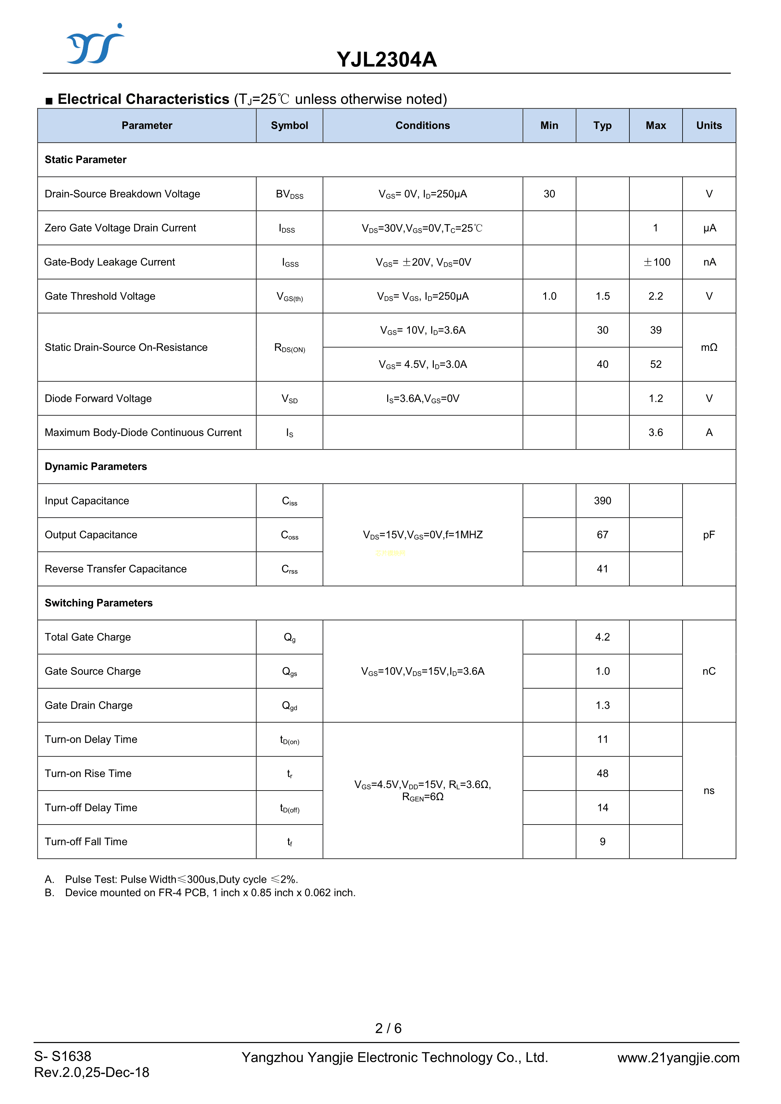 YJL2304A数据手册SOT-23-3L封装YANGJIE(扬杰)PDF规格书,中英文下载