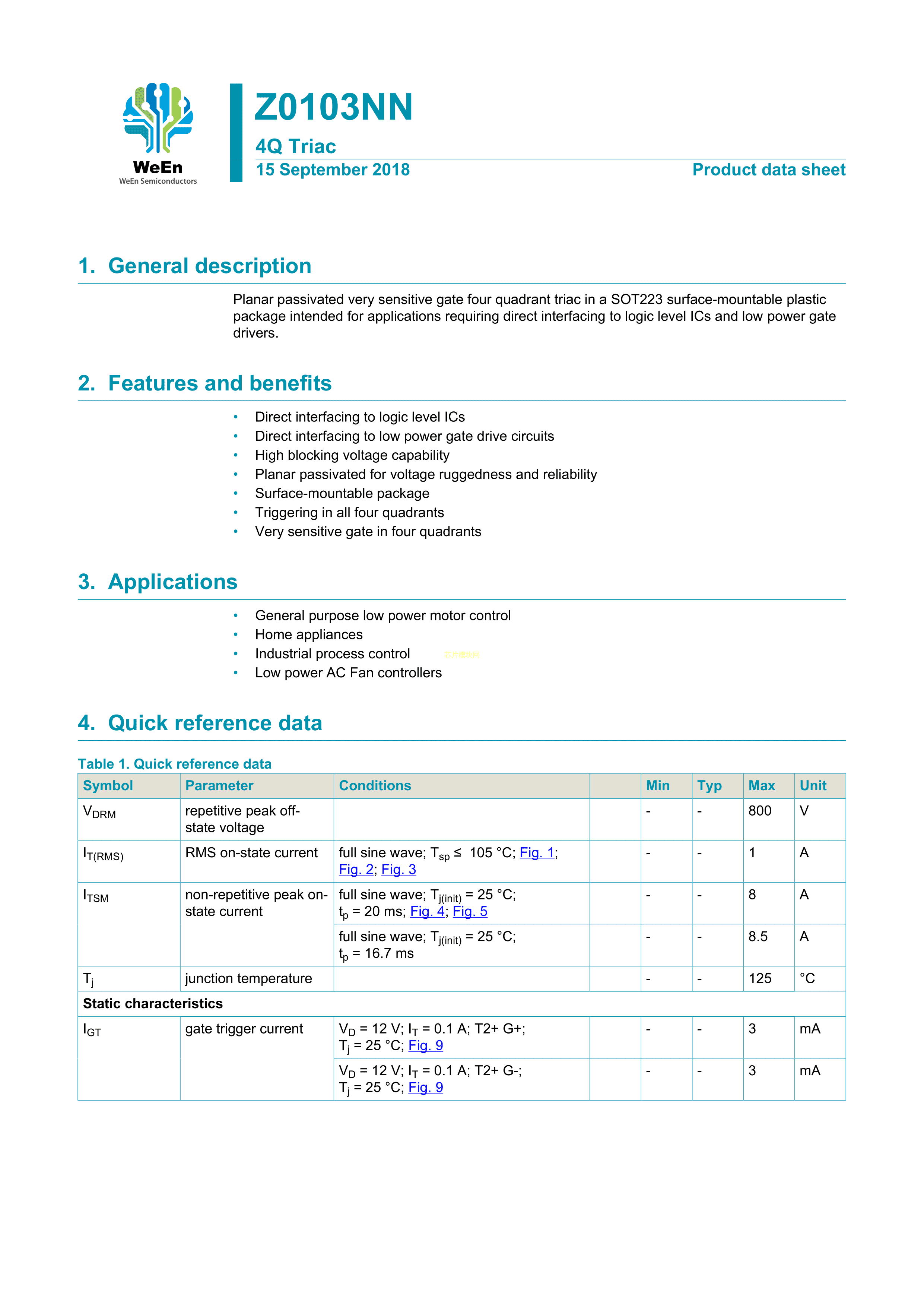 Z0103NN135数据手册SOT-223封装WeEn(瑞能)PDF规格书,中英文下载