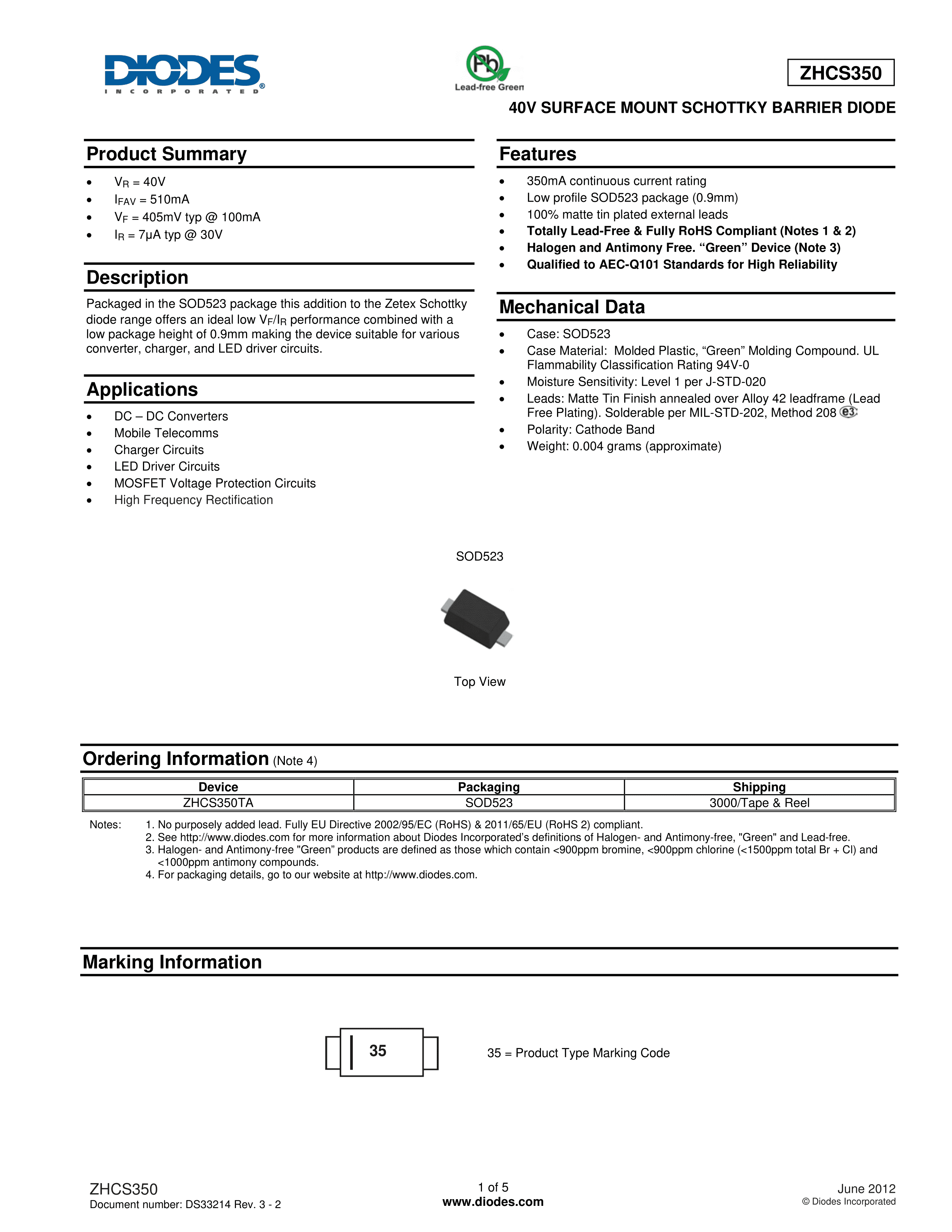 ZHCS350TA数据手册SOD-523封装DIODES(美台)PDF规格书,中英文下载