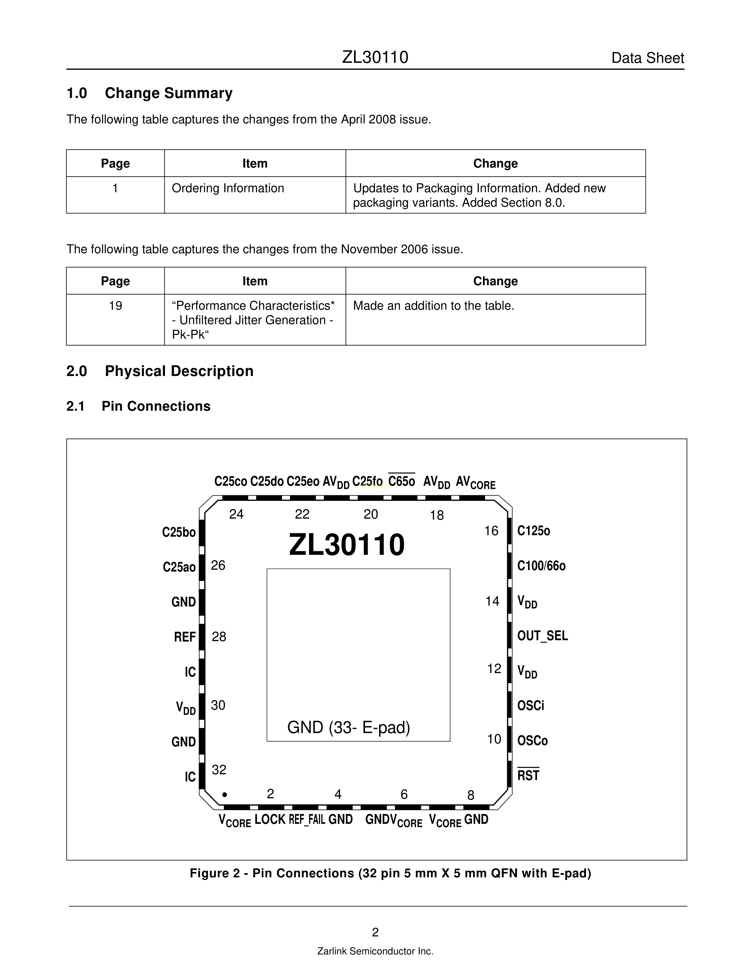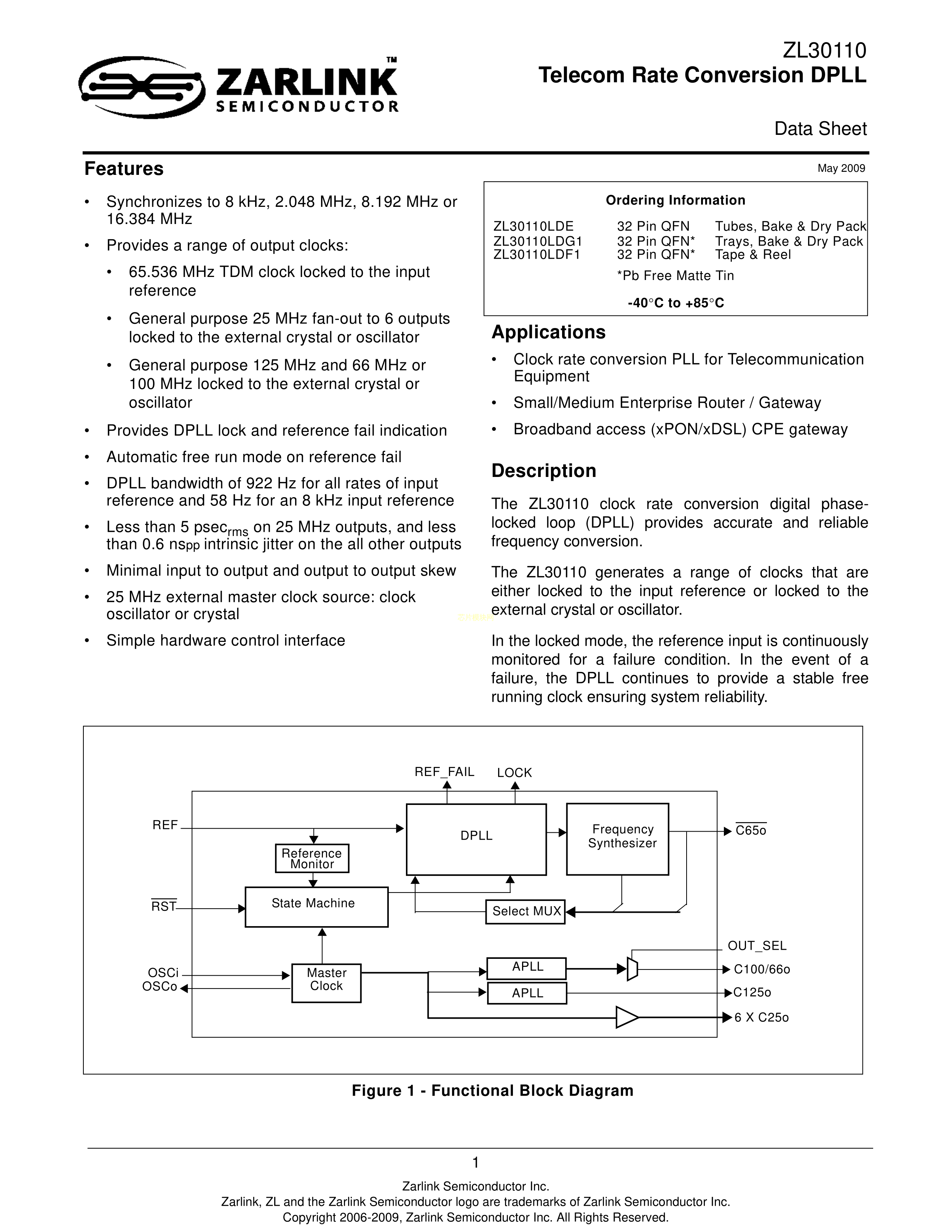 ZL30110LDG1数据手册QFN-32(5x5)封装MICROCHIP(美国微芯)PDF规格书,
