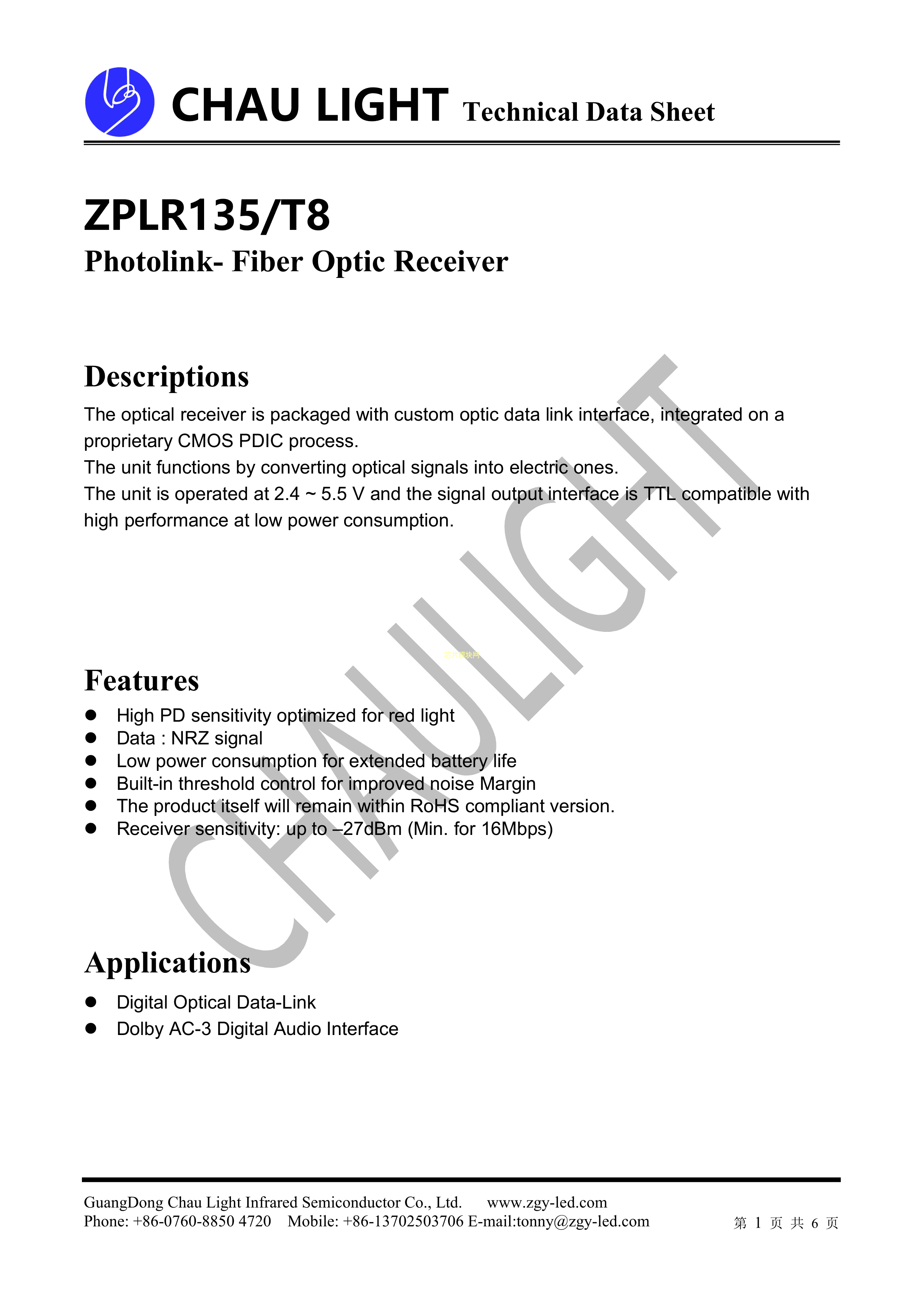ZPLR135-T8数据手册ThroughHole封装ChauLight(洲光源)PDF规格书,中英文下载