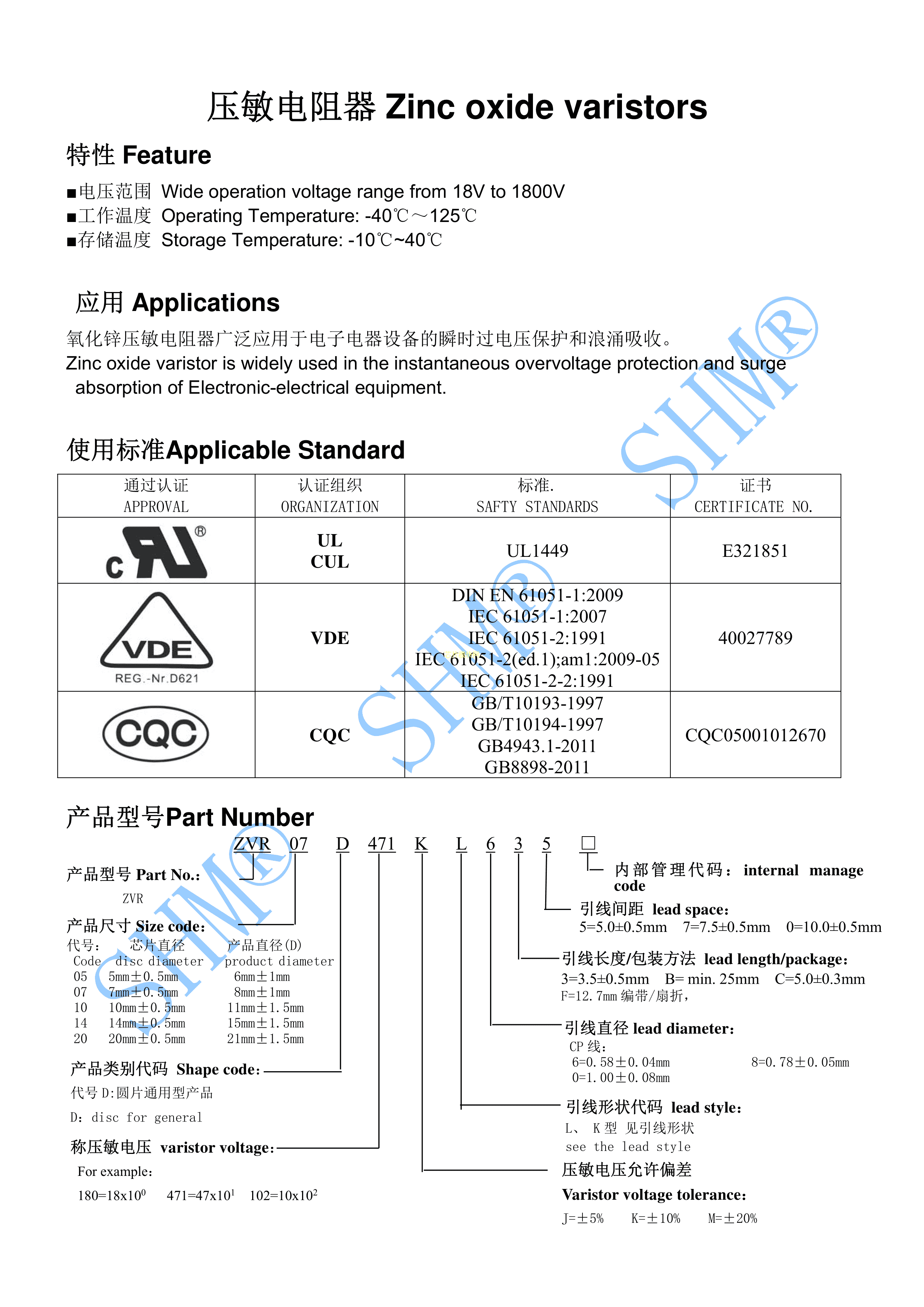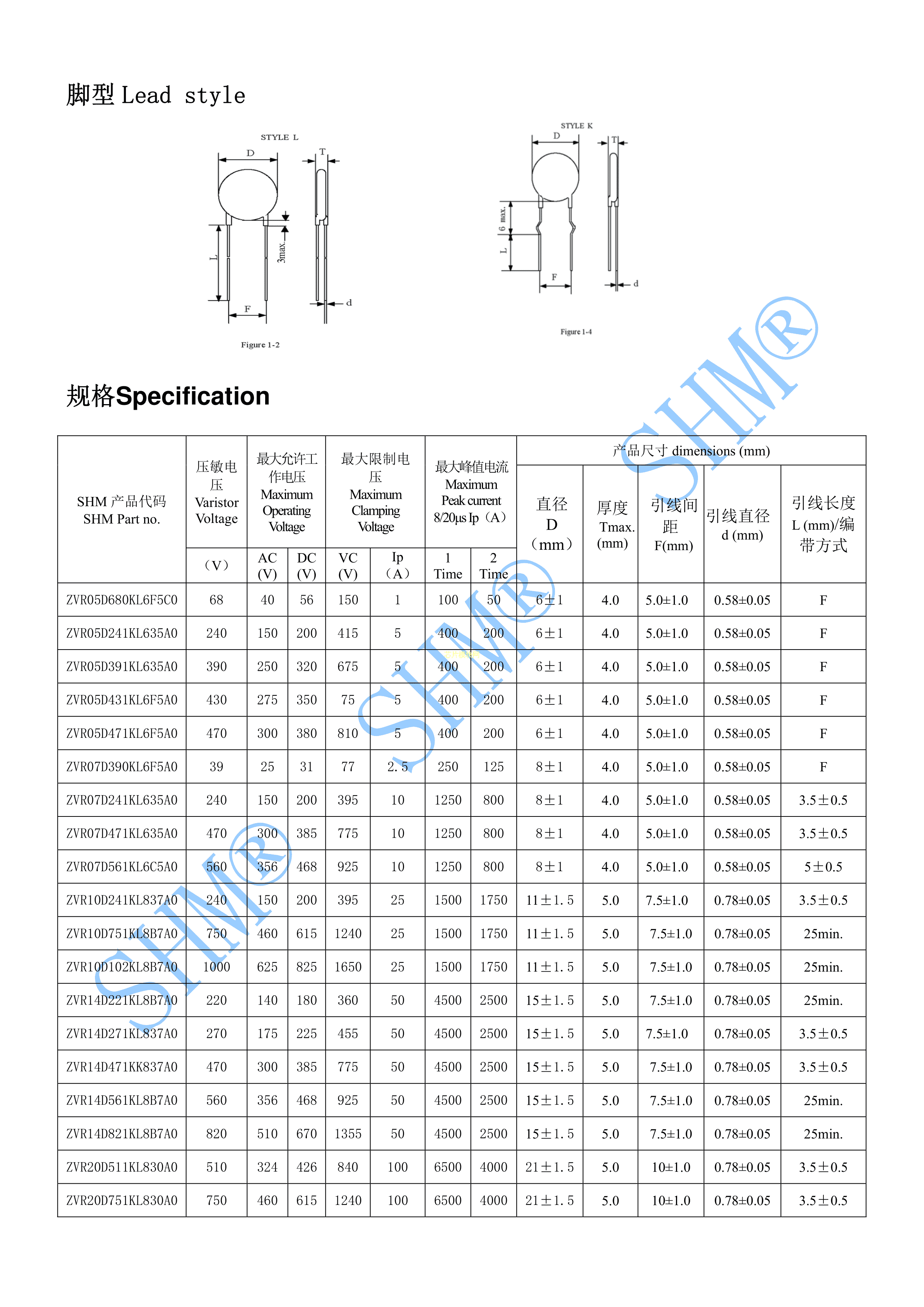 ZVR07D390KL6F5A0数据手册径向引线封装SHM(南方宏明)PDF规格书,中英文下载