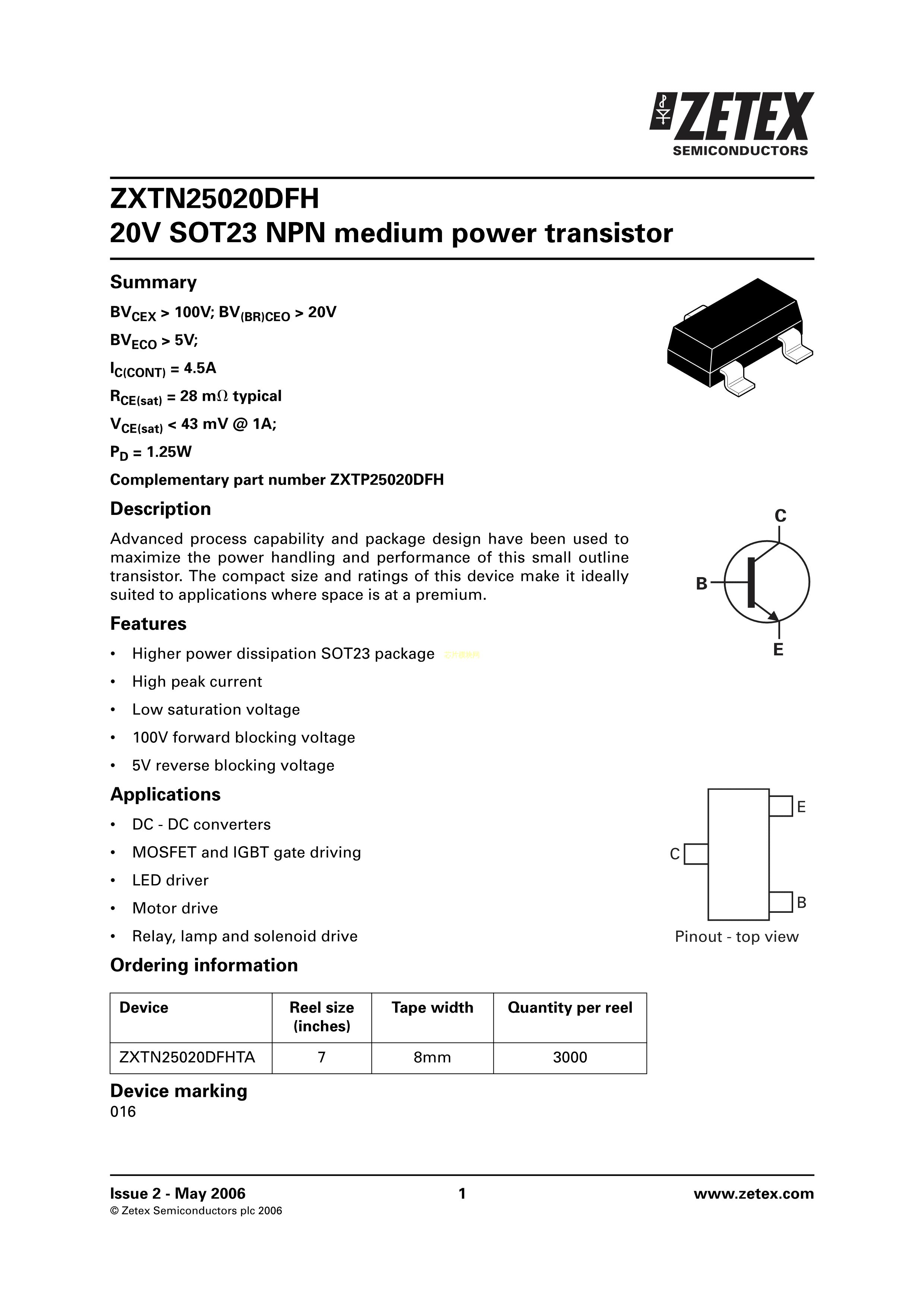 ZXTN25020DFHTA数据手册SOT-23-3封装DIODES(美台)PDF规格书,中英文下载