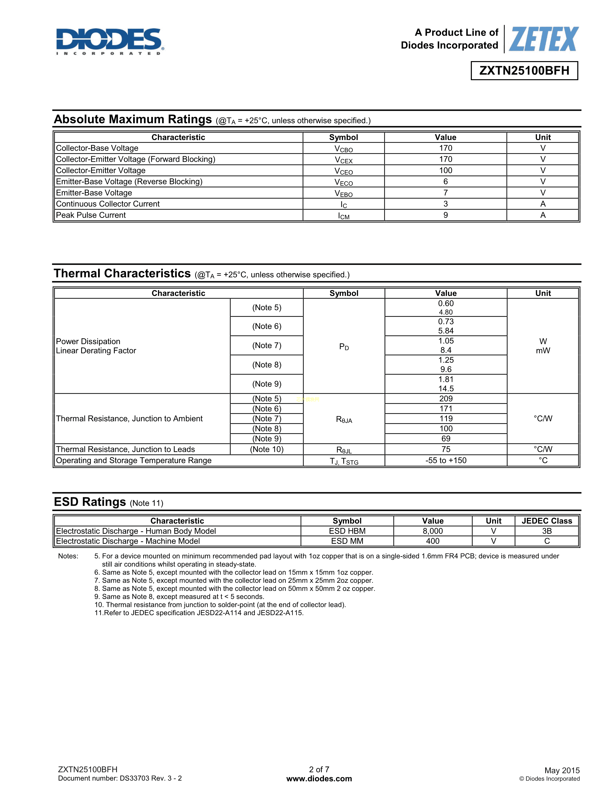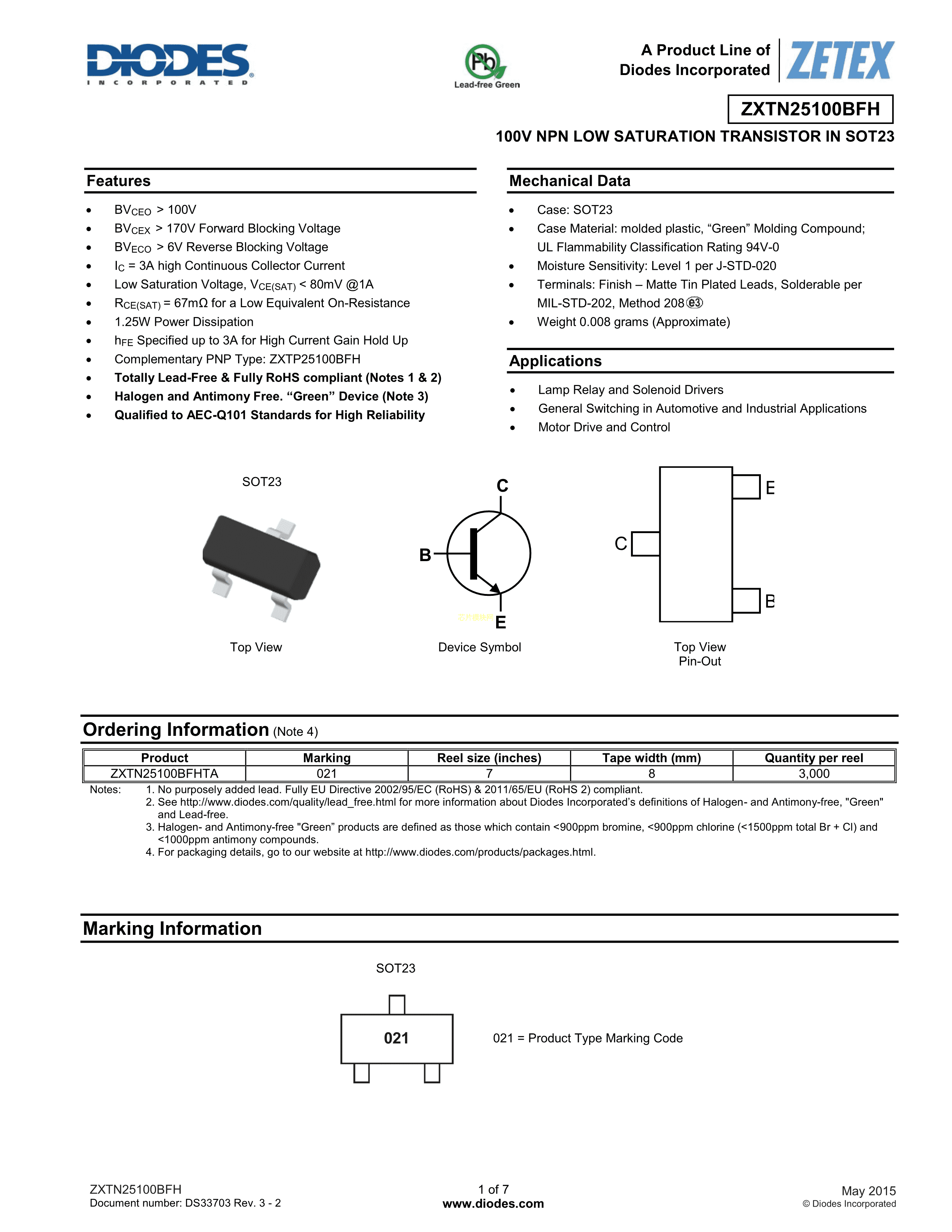 ZXTN25100BFHTA数据手册SOT-23(SOT-23-3)封装DIODES(美台)PDF规