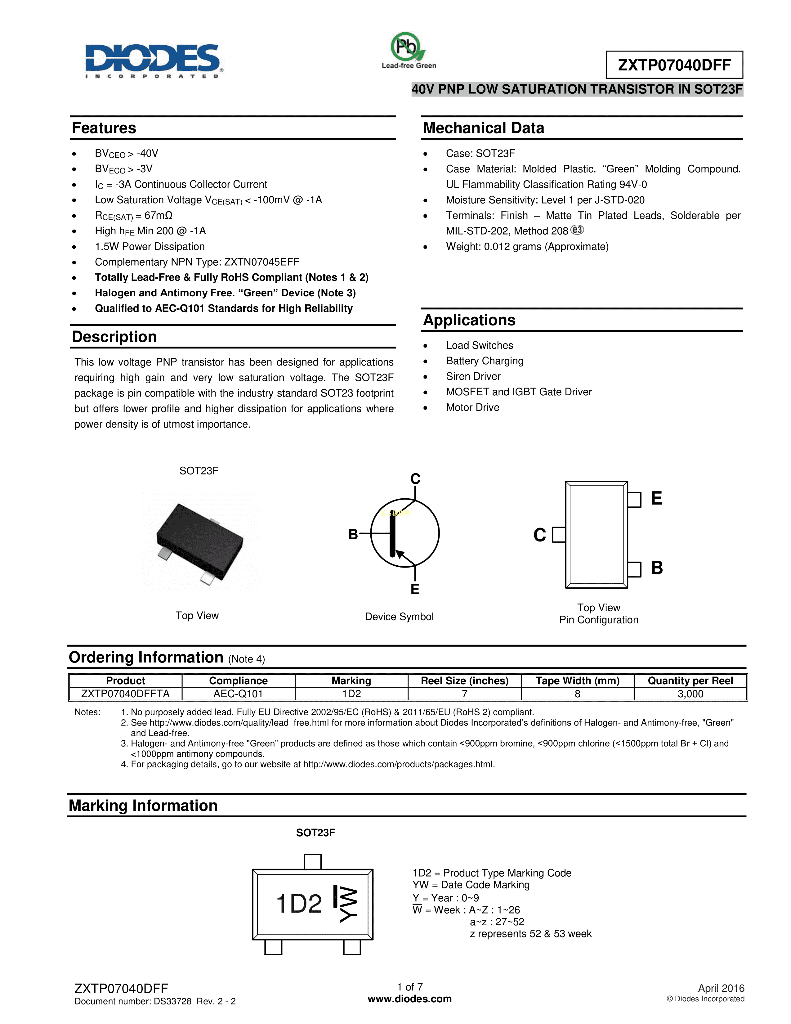 ZXTP07040DFFTA数据手册SOT-23F封装DIODES(美台)PDF规格书,中英文下载
