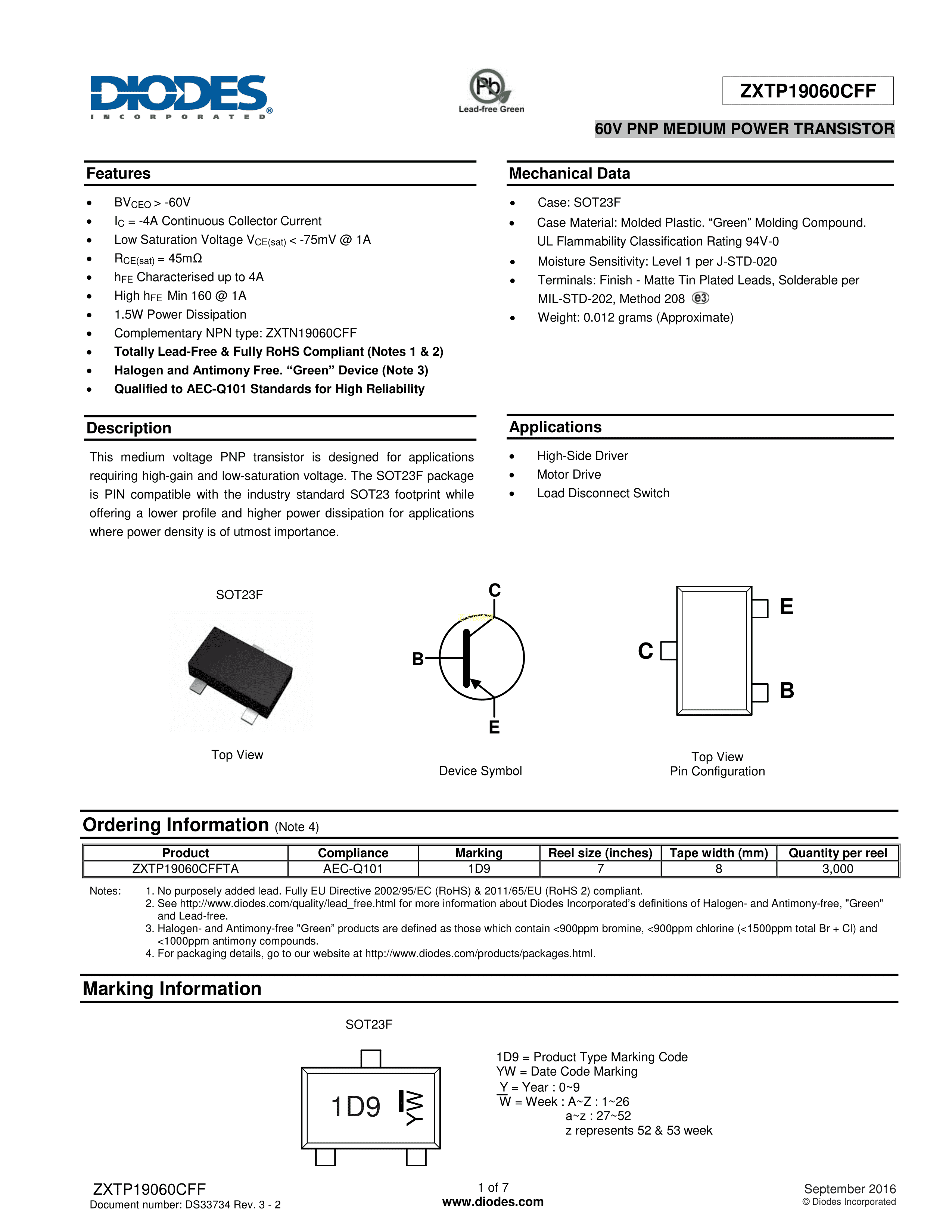 ZXTP19060CFFTA数据手册SOT-23F封装DIODES(美台)PDF规格书,中英文下载