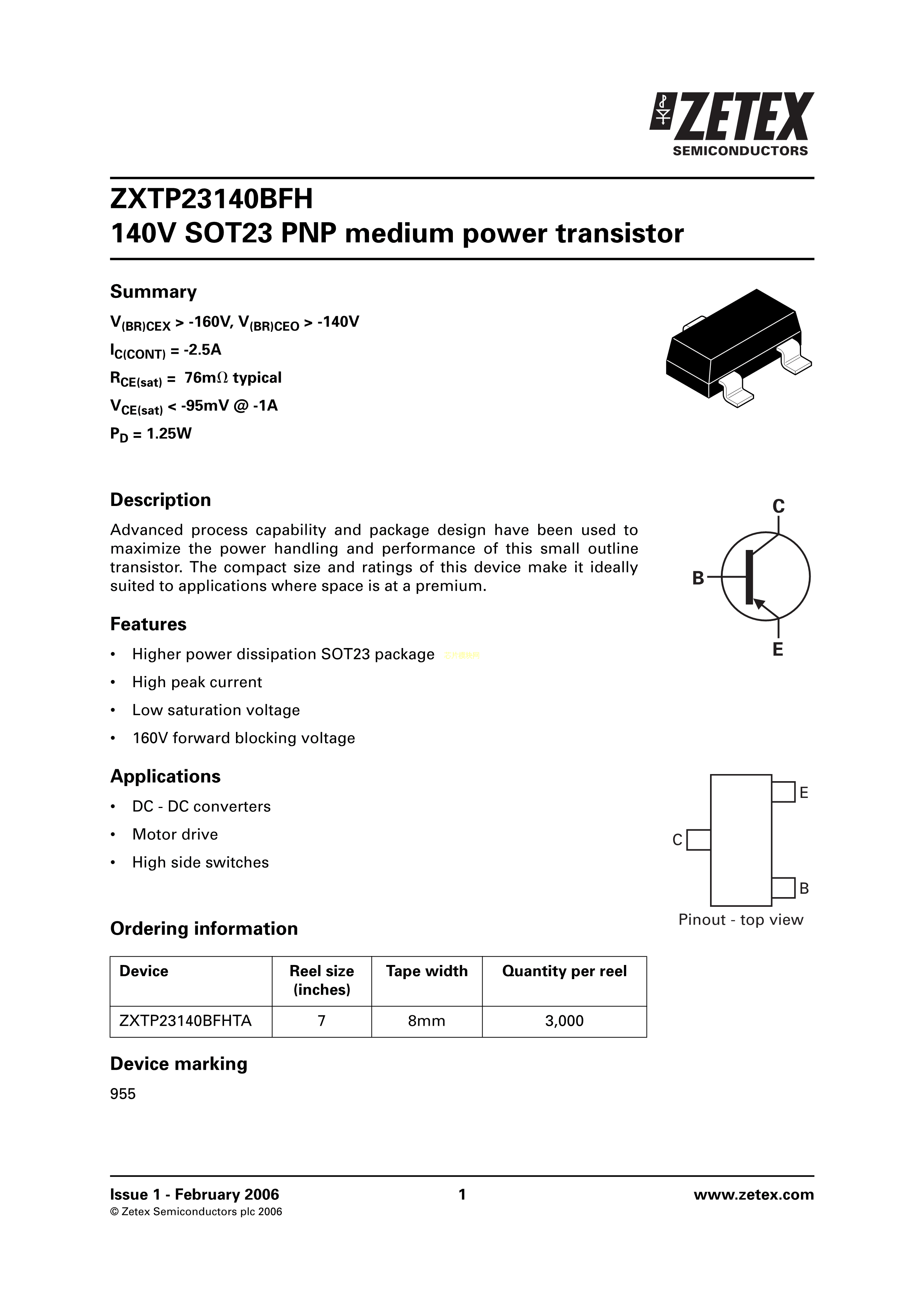 ZXTP23140BFHTA数据手册SOT-23-3封装DIODES(美台)PDF规格书,中英文下载