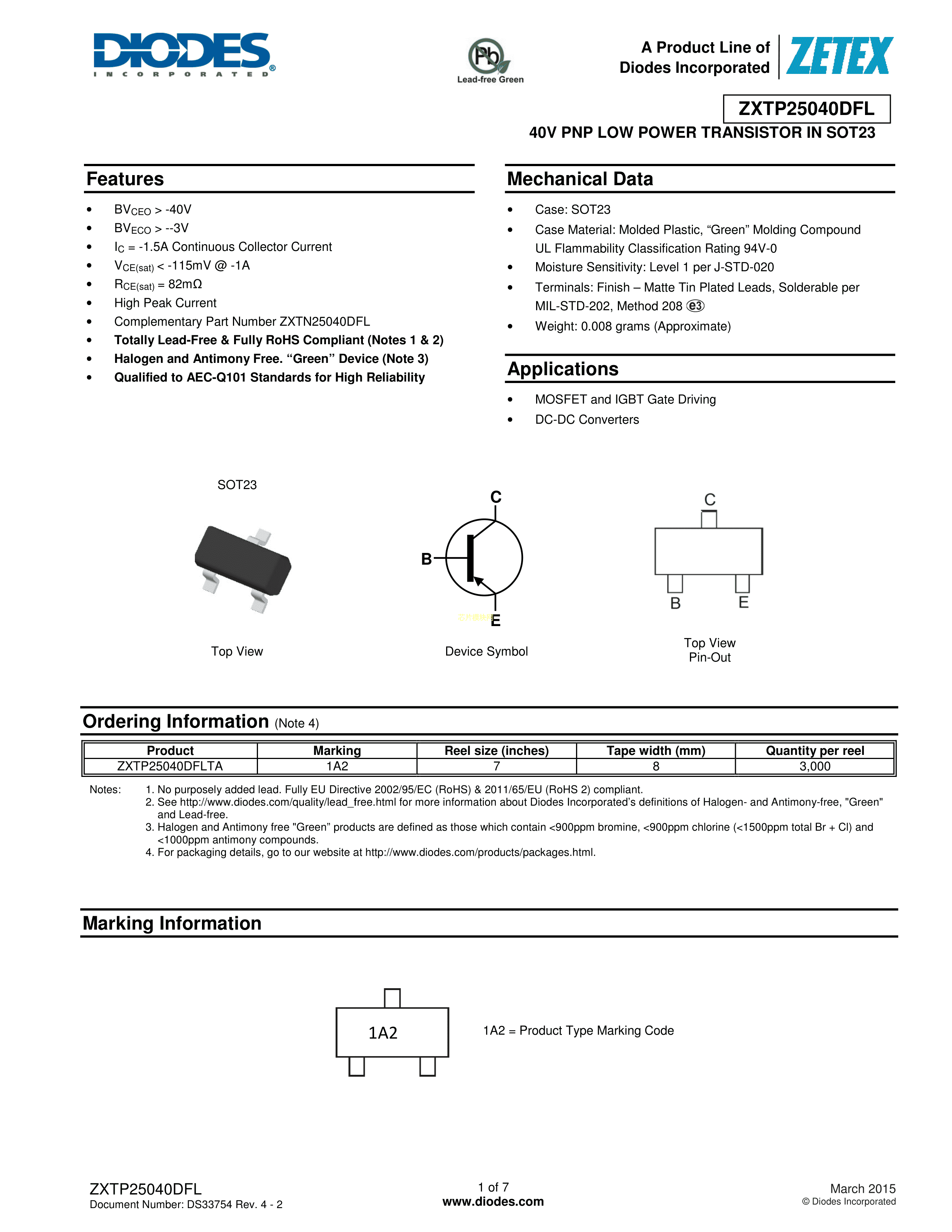 ZXTP25040DFLTA数据手册SOT-23封装DIODES(美台)PDF规格书,中英文下载