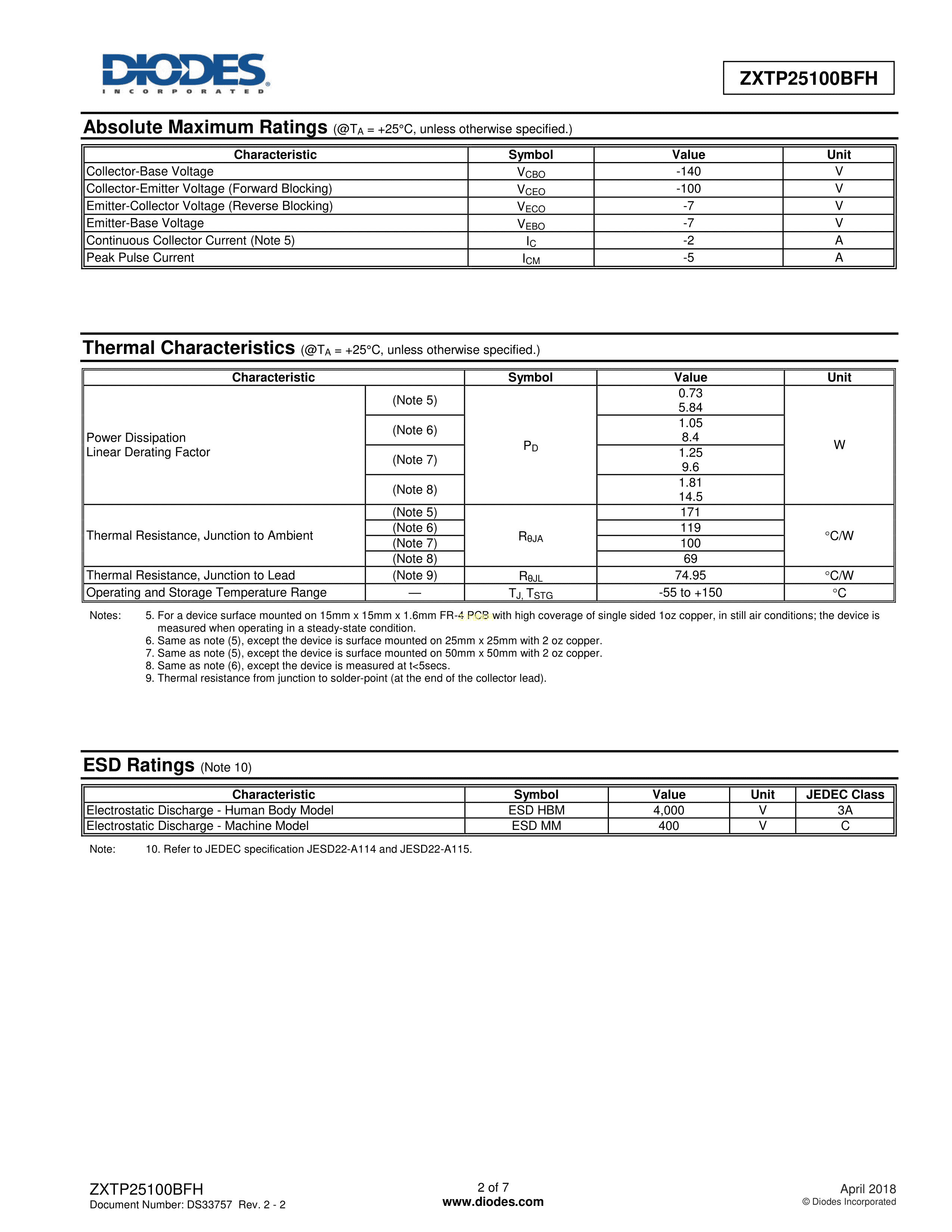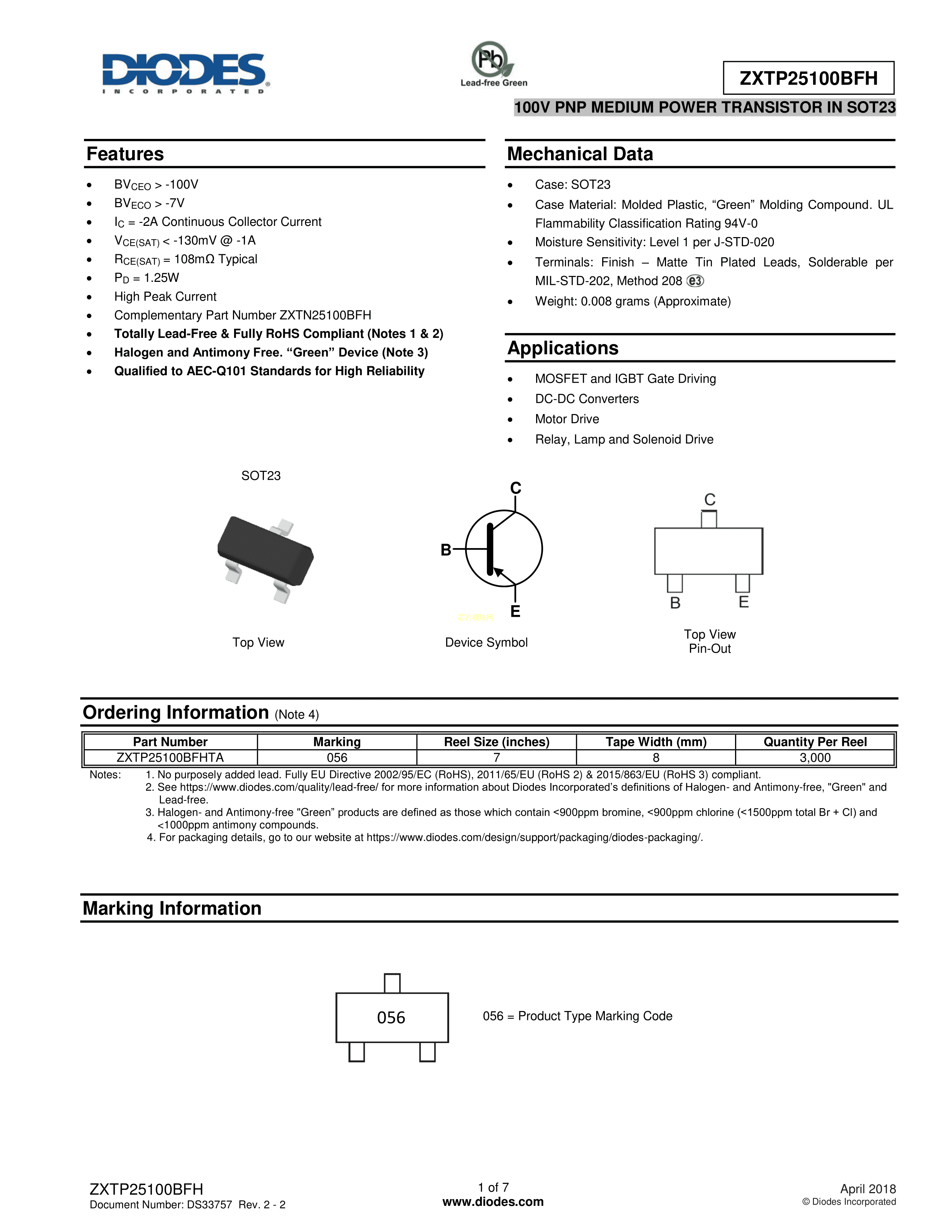 ZXTP25100BFHTA数据手册SOT-23封装DIODES(美台)PDF规格书,中英文下载