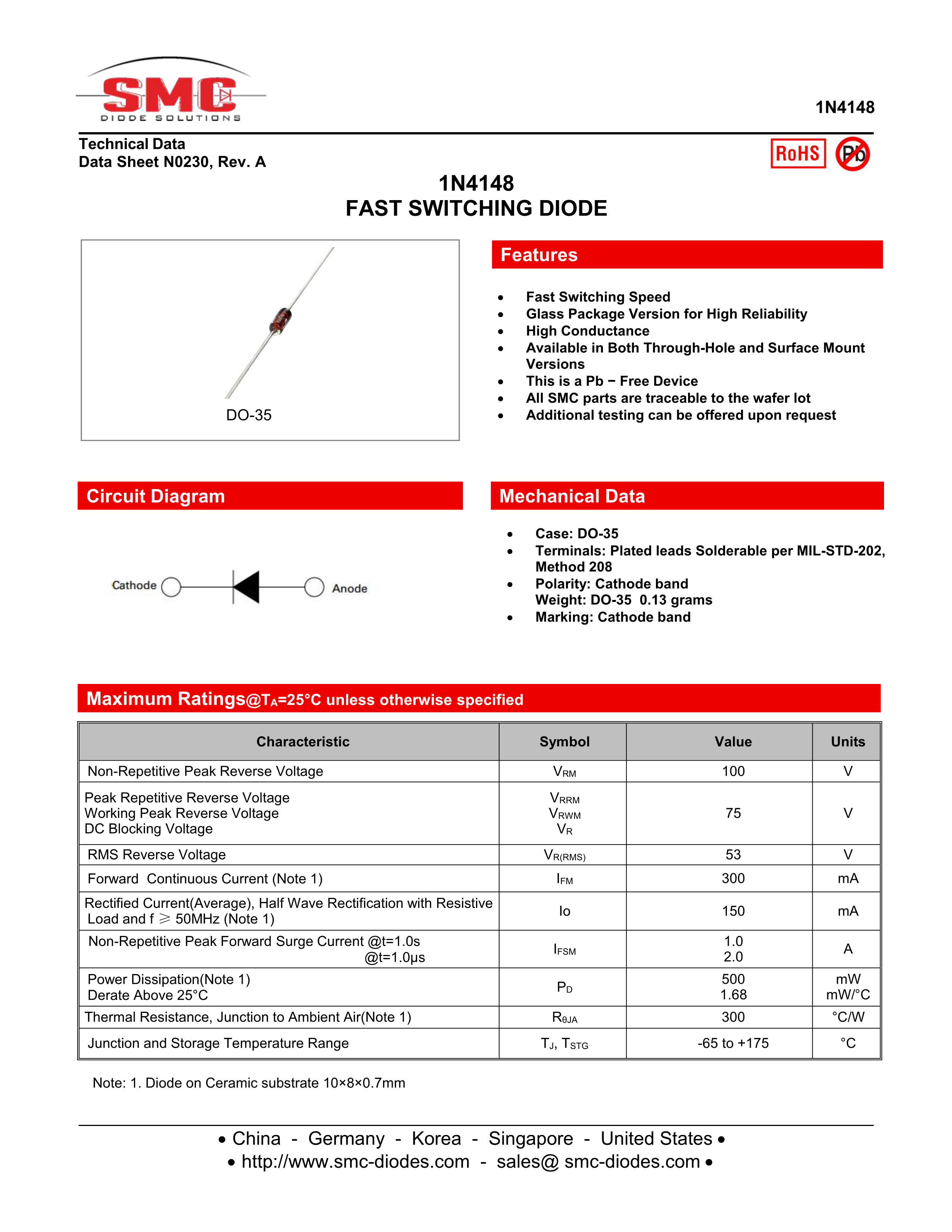1N4148数据手册DO-35封装SMC(桑德斯)PDF规格书,中英文下载