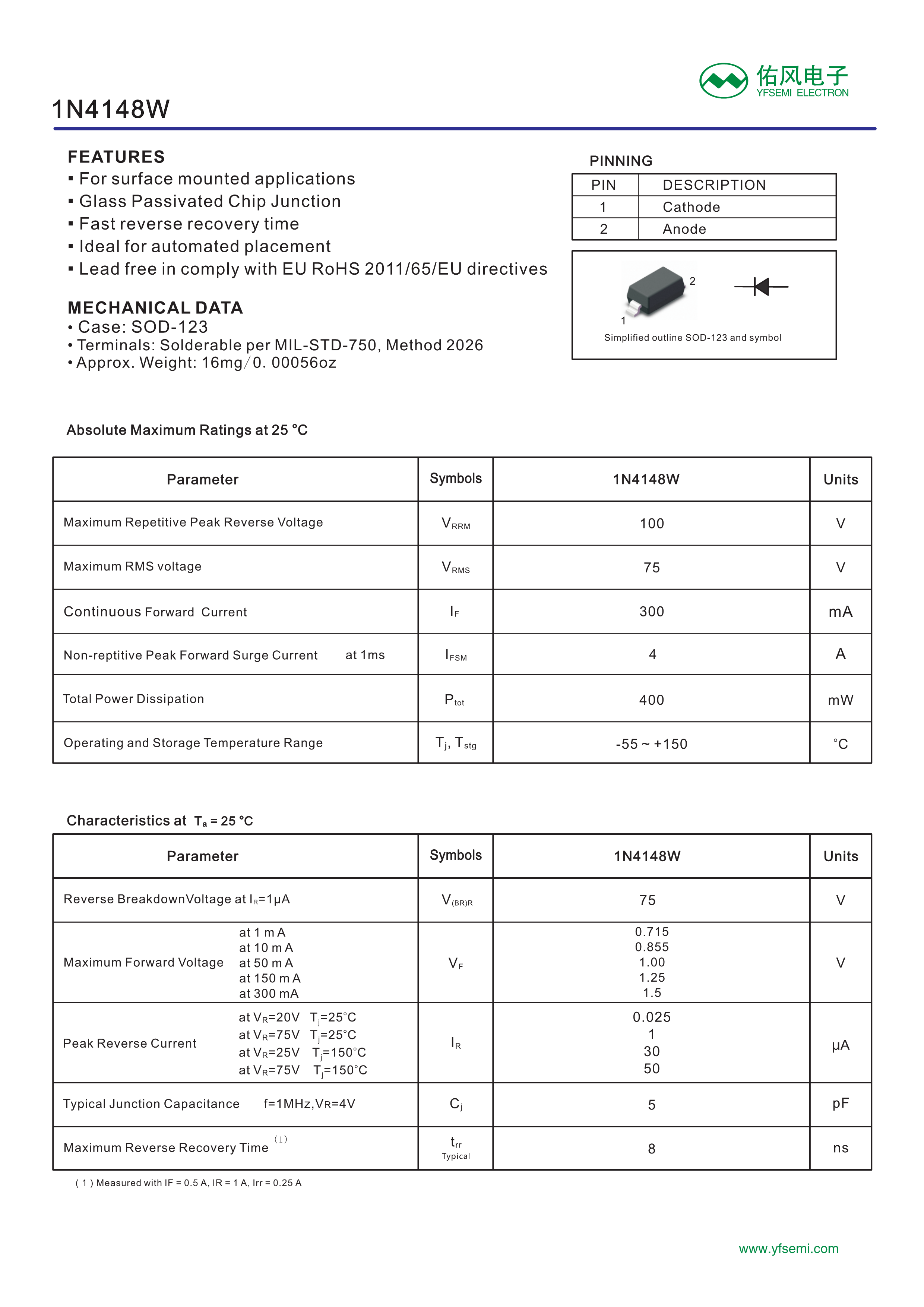 1N4148W数据手册SOD-123封装YFSEMI(江苏佑风微)PDF规格书,中英文下载